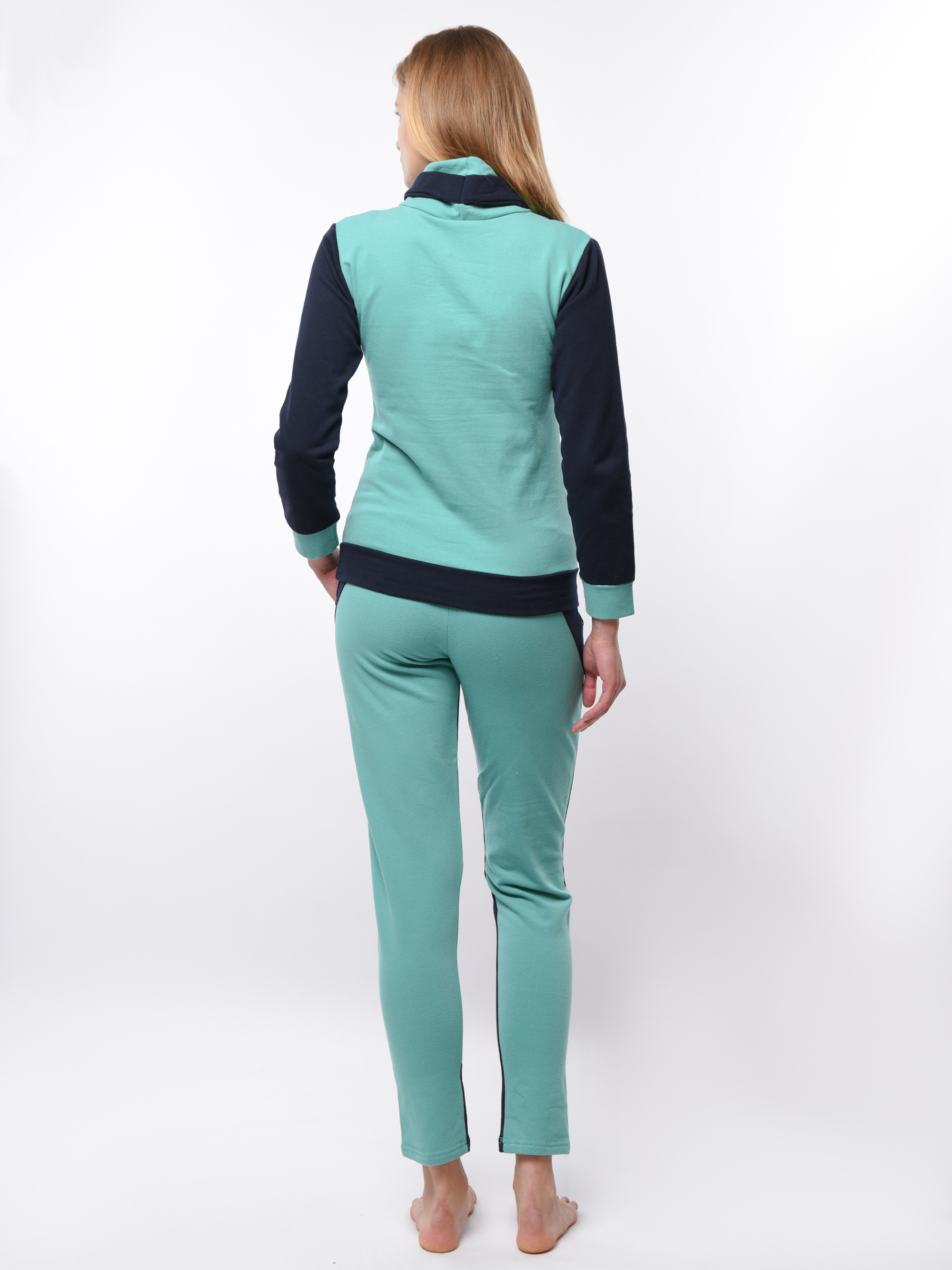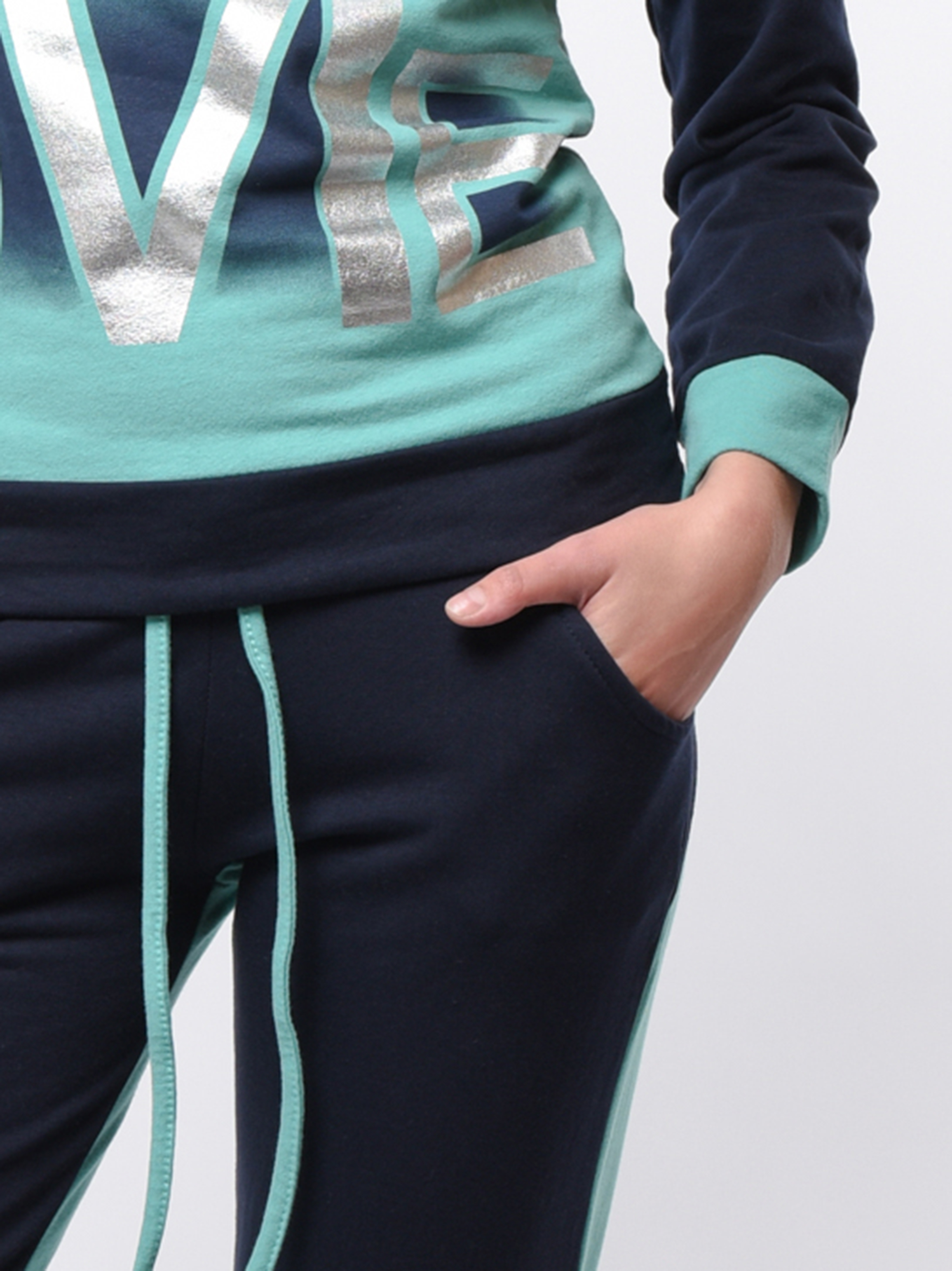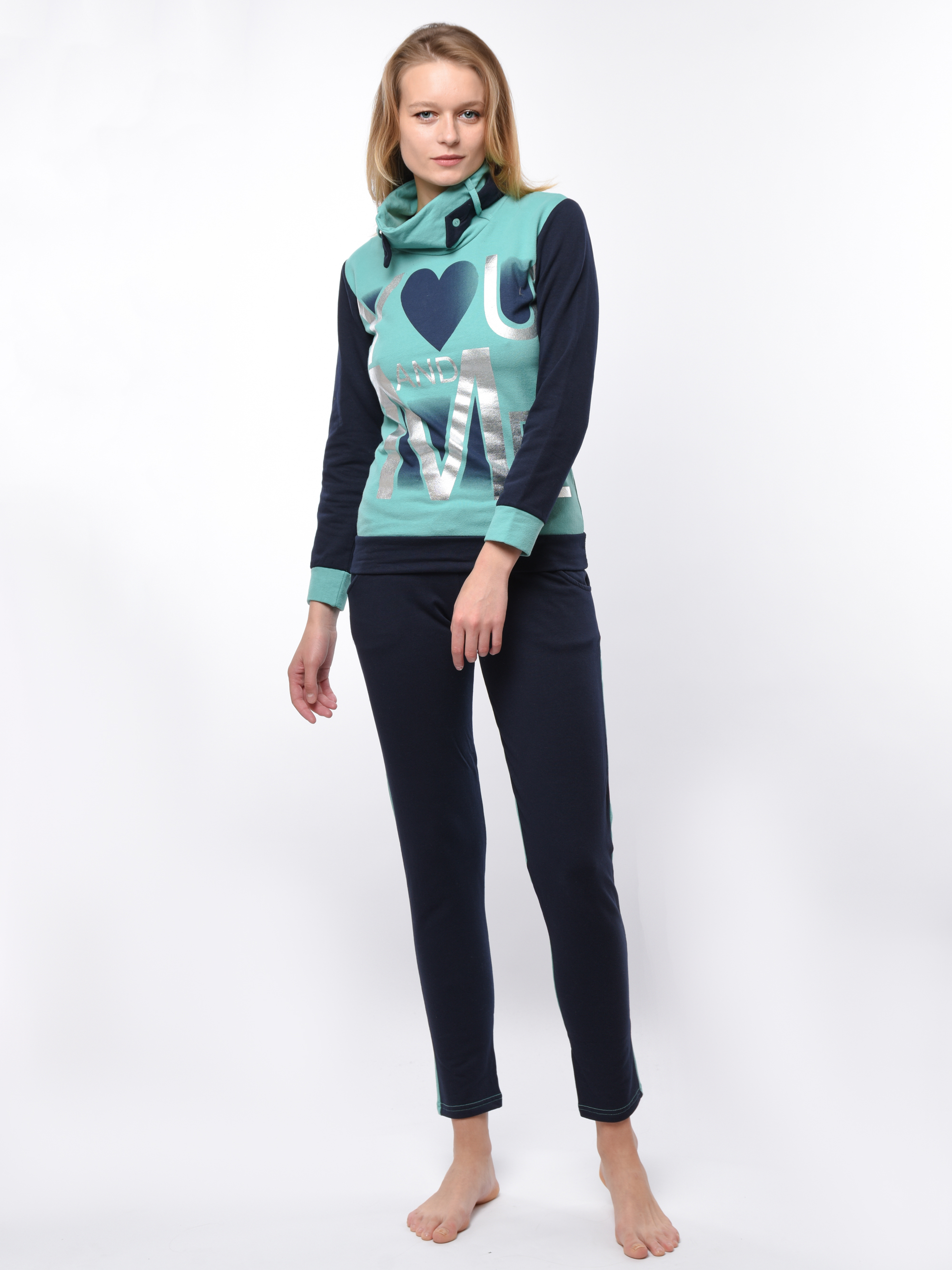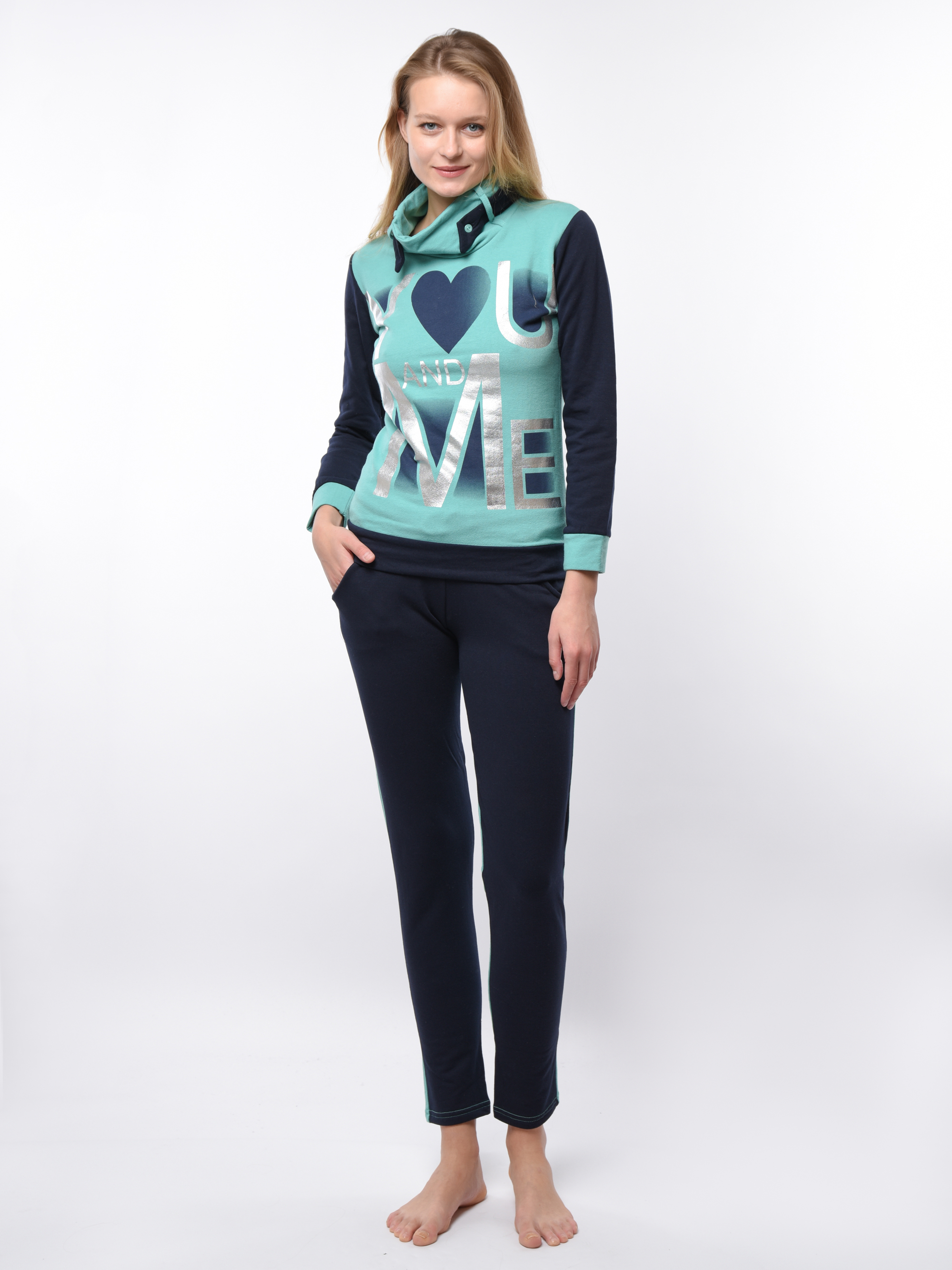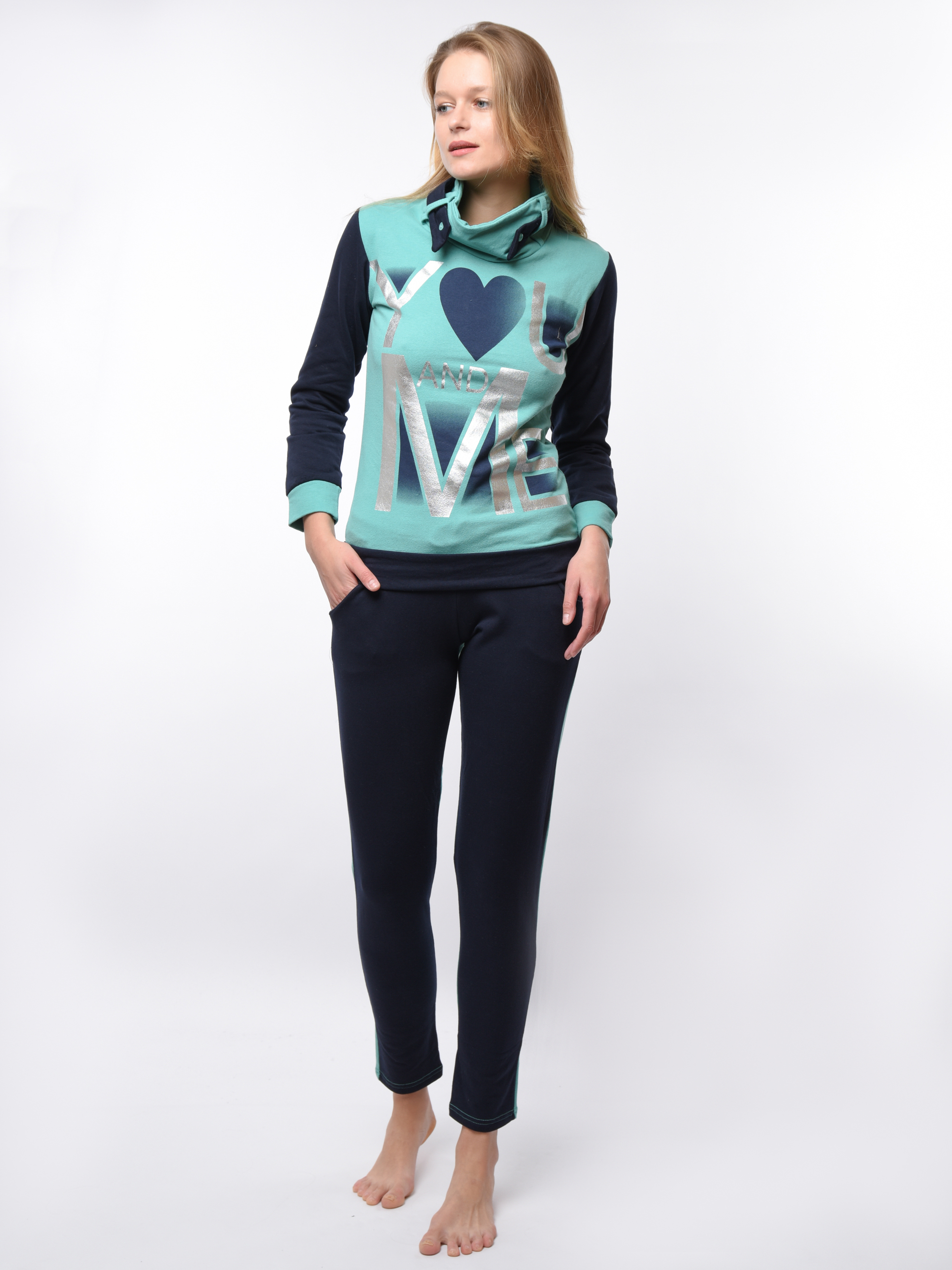 Домашний женский костюм из плотного хлопка с ярким, блестящим принтом спереди, контрастными рукавами и брюками. Крой джемпера свободный, длинные рукава и большой воротник-стойка с декором, Яркий акцент вашего образа - от прогулки до уютного вечера дома. Удобная домашняя одежда обязана дарить комфорт: приятна к коже, свободна в движениях.