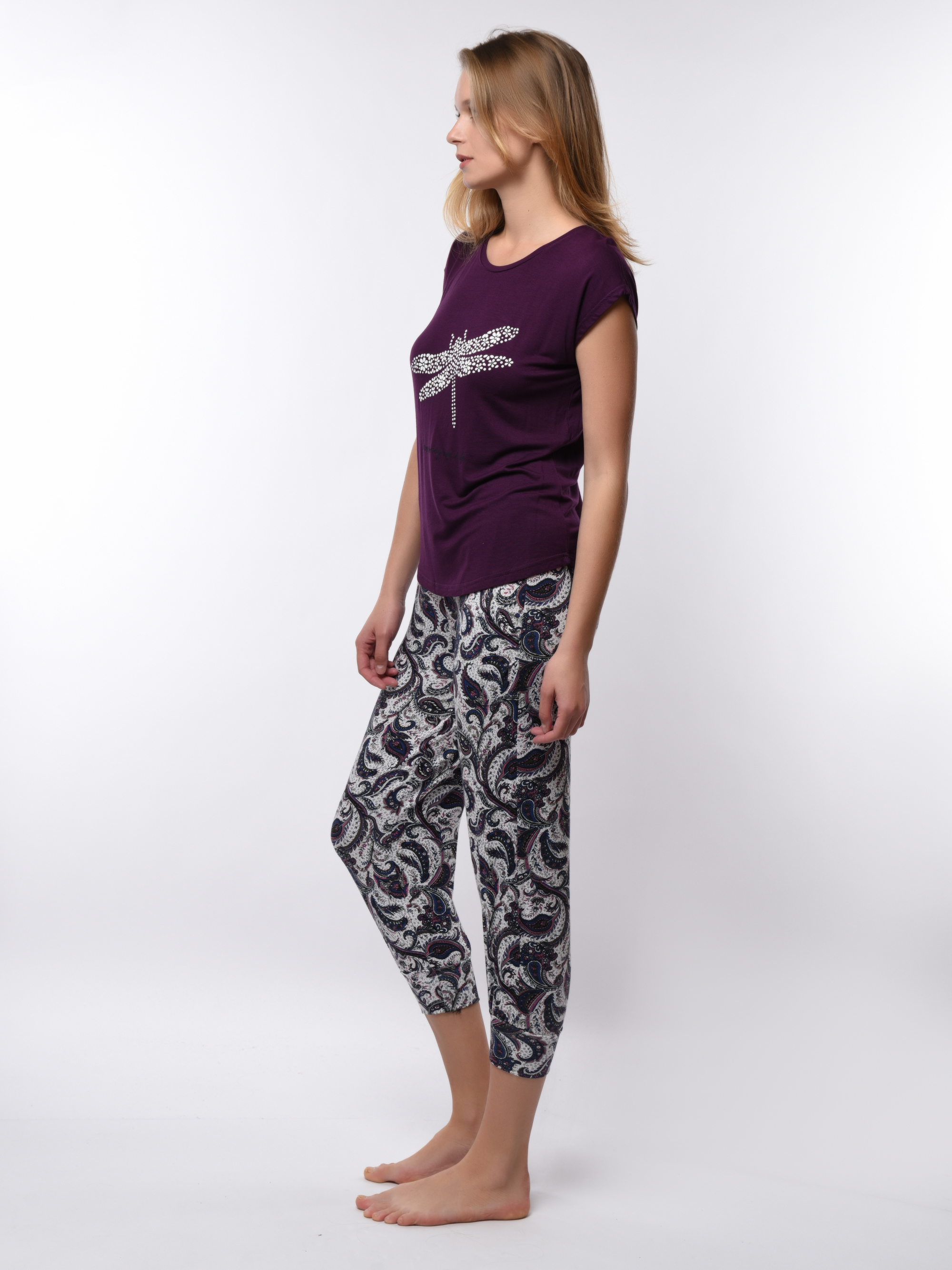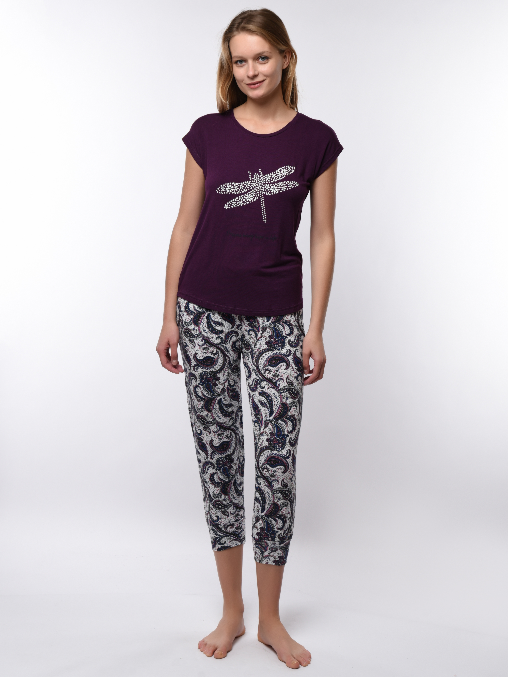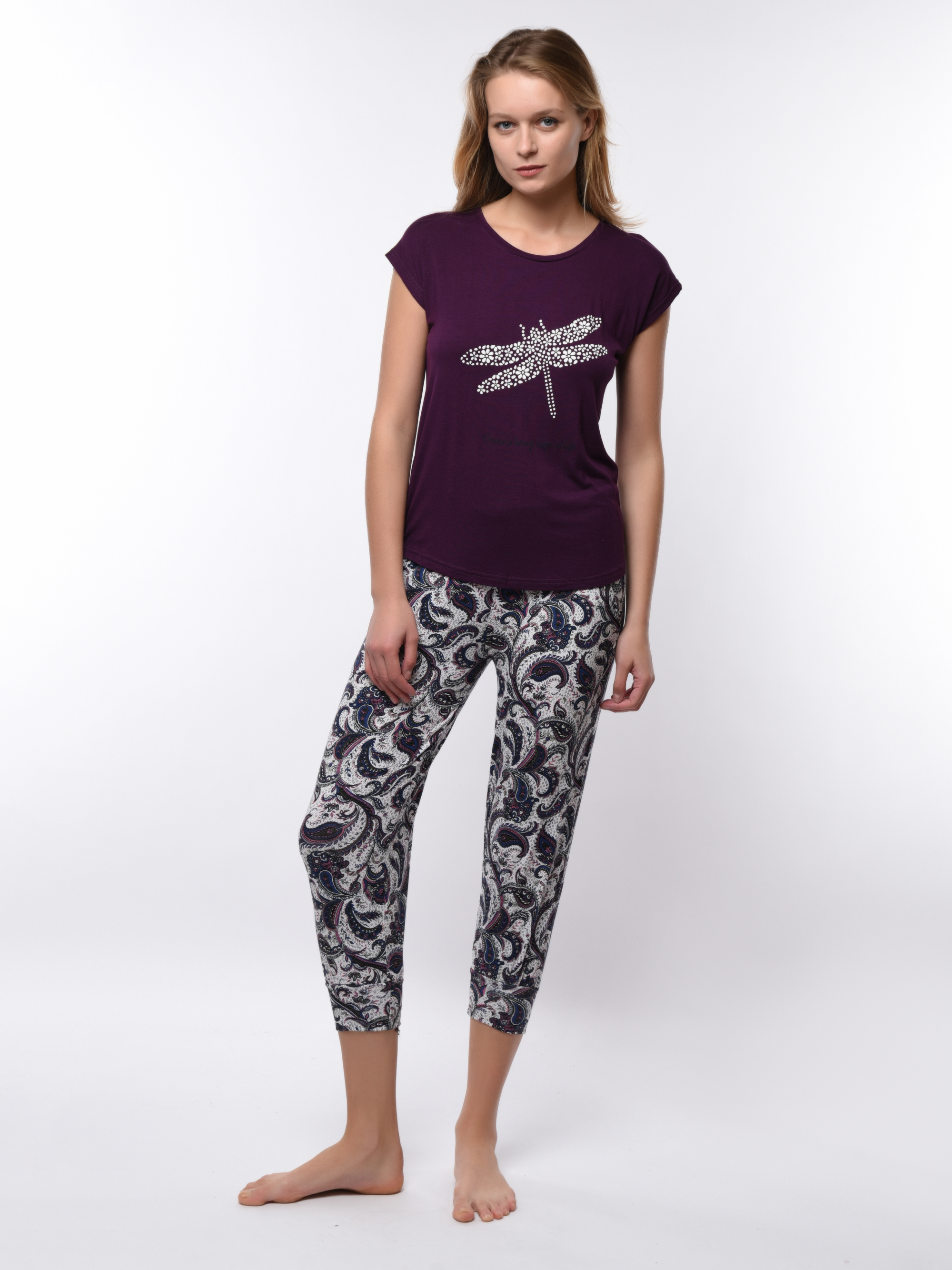 Пижама женская с принтом "стрекоза" от бренда Nicoletta – это сочетание комфорта и стильного дизайна. Состоит из футболки свободного кроя, с круглой горловиной и с принтом. Укороченные брючки контрастного цвета дополняют образ. Изготовлена из качественного материала: 95% вискозы и 5% эластана, обеспечивающих мягкость к телу и свободу движений. Подходит для круглогодичного использования.