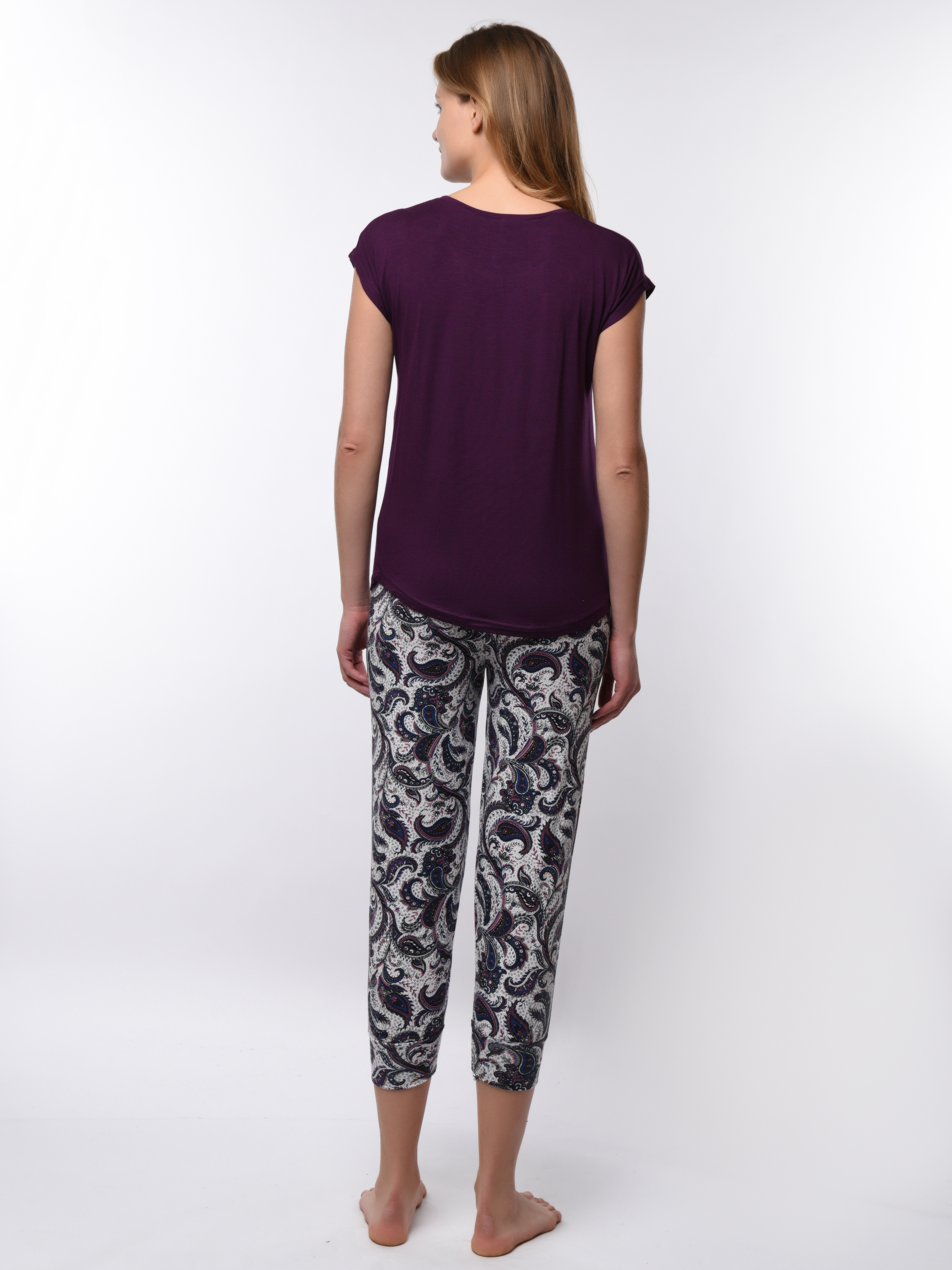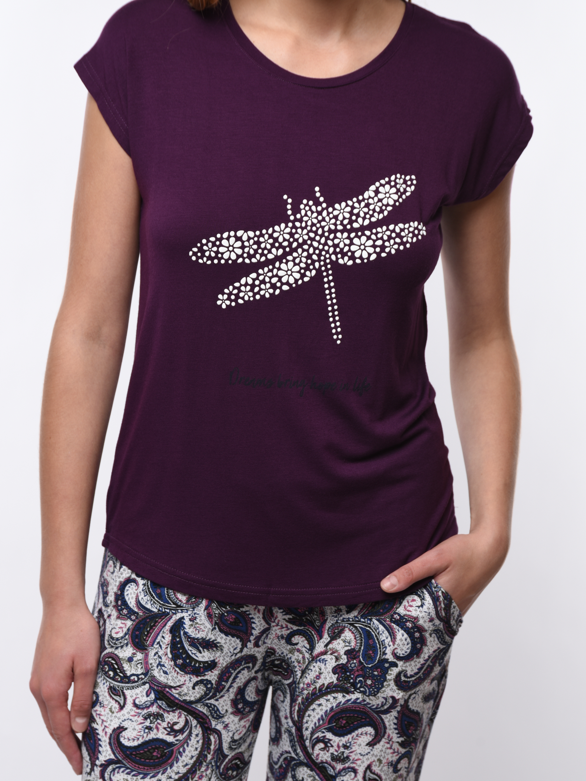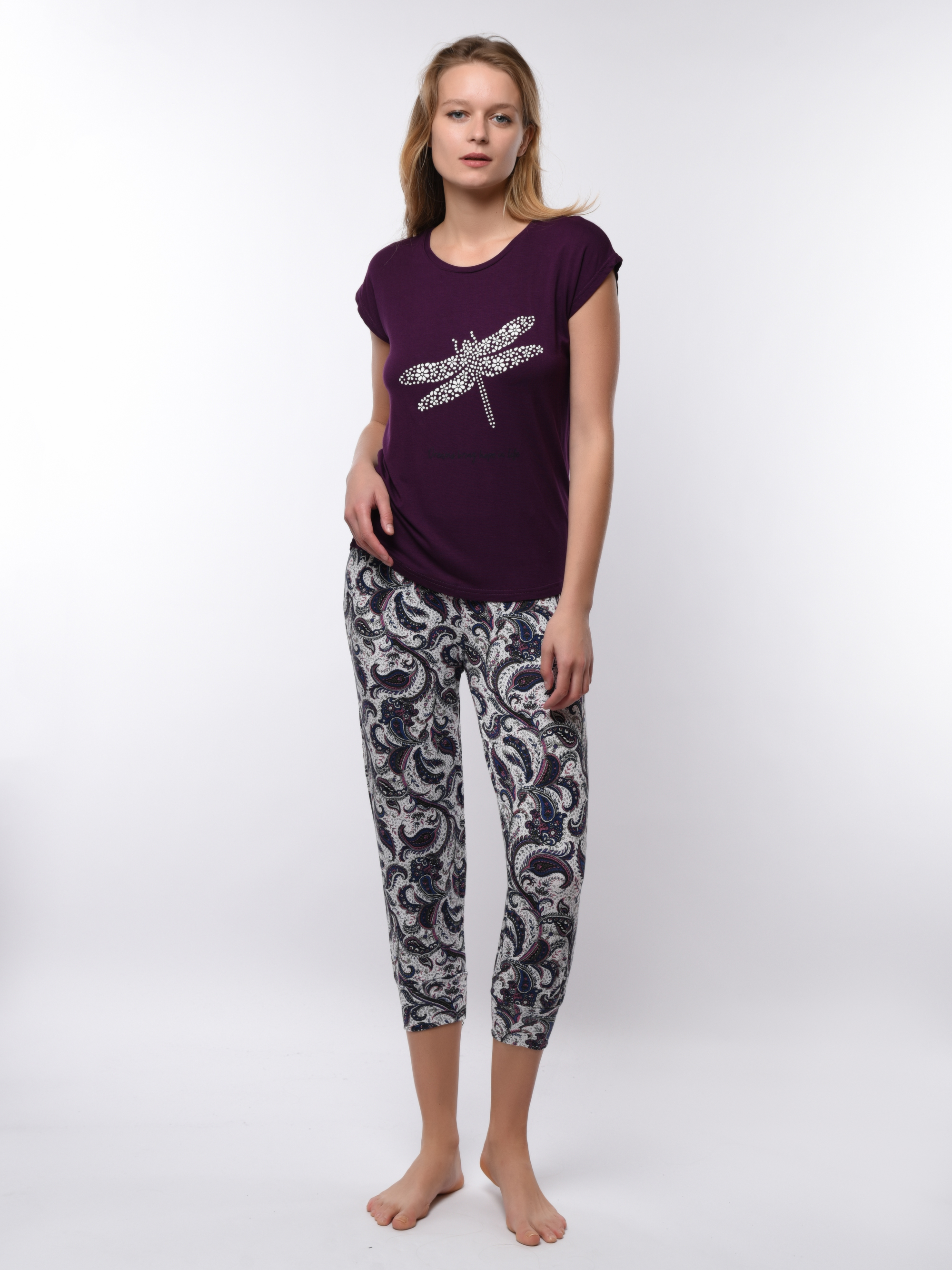 Пижама женская с принтом "стрекоза" от бренда Nicoletta – это сочетание комфорта и стильного дизайна. Состоит из футболки свободного кроя, с круглой горловиной и с принтом. Укороченные брючки контрастного цвета дополняют образ. Изготовлена из качественного материала: 95% вискозы и 5% эластана, обеспечивающих мягкость к телу и свободу движений. Подходит для круглогодичного использования.