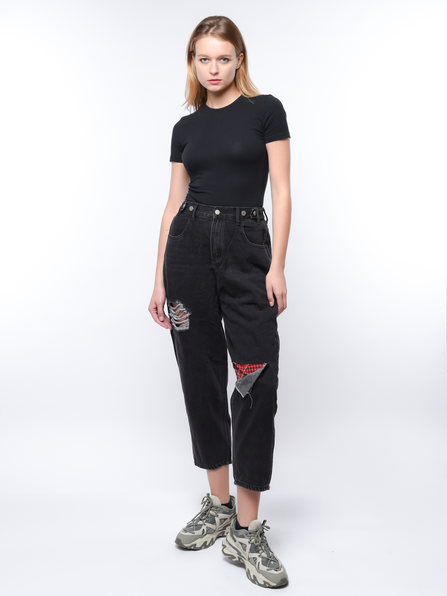 Брюки женские джинсовые, укороченного кроя. Модель дополнена карманами и модными латками. Изготовлены из качественного денима, обеспечивающего комфорт при носке и долговечность модели. Стильный дизайн подчеркивает индивидуальность обладательницы и станет отличным дополнением к базовому гардеробу. Удобны для ежедневной носки и идеально сочетаются с разнообразными верхами — от облегающих топов до свободных блузок и джемперов.