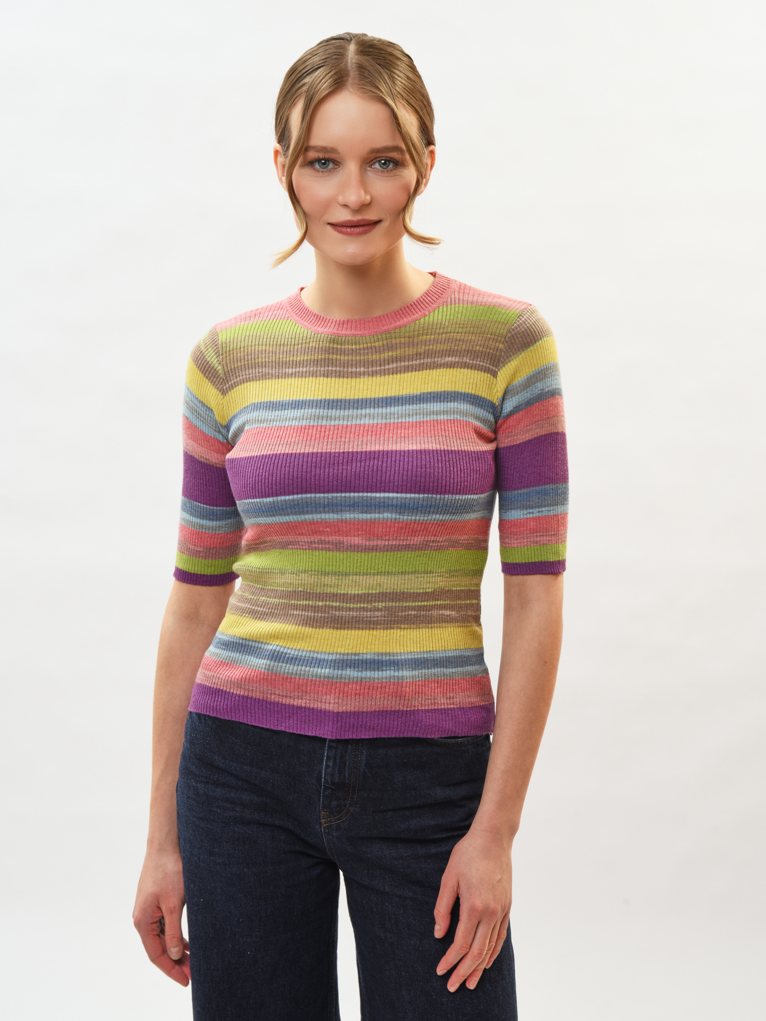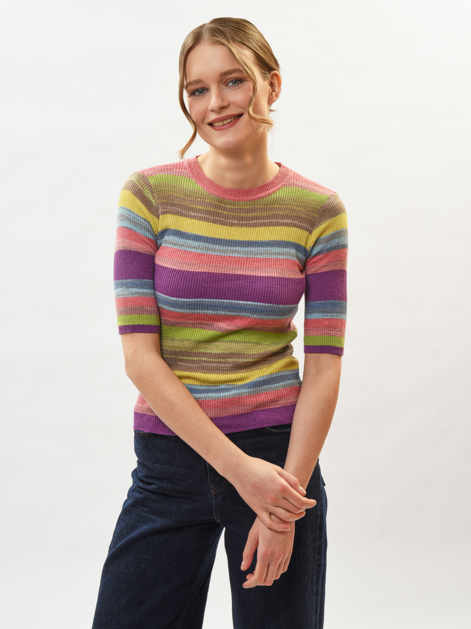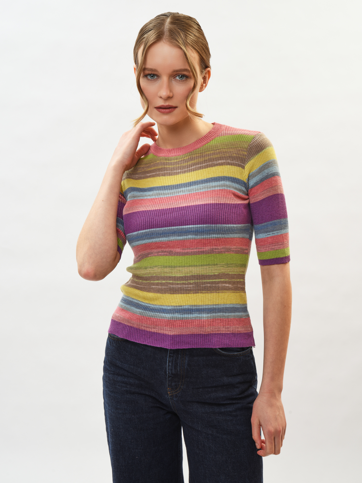 Женский джемпер с коротким рукавом — стильная находка вашего гардероба! Современный крой подчеркивает фигуру, а мягкий материал подарит комфорт в любой день. Круглая горловина и манжеты добавляют изюминку образу, делая его неповторимым. Прекрасно сочетается как со строгими брюками, так и с уютными джинсами для прогулок с друзьями. Стильный акцент вашего нового образа уже ждет вас!