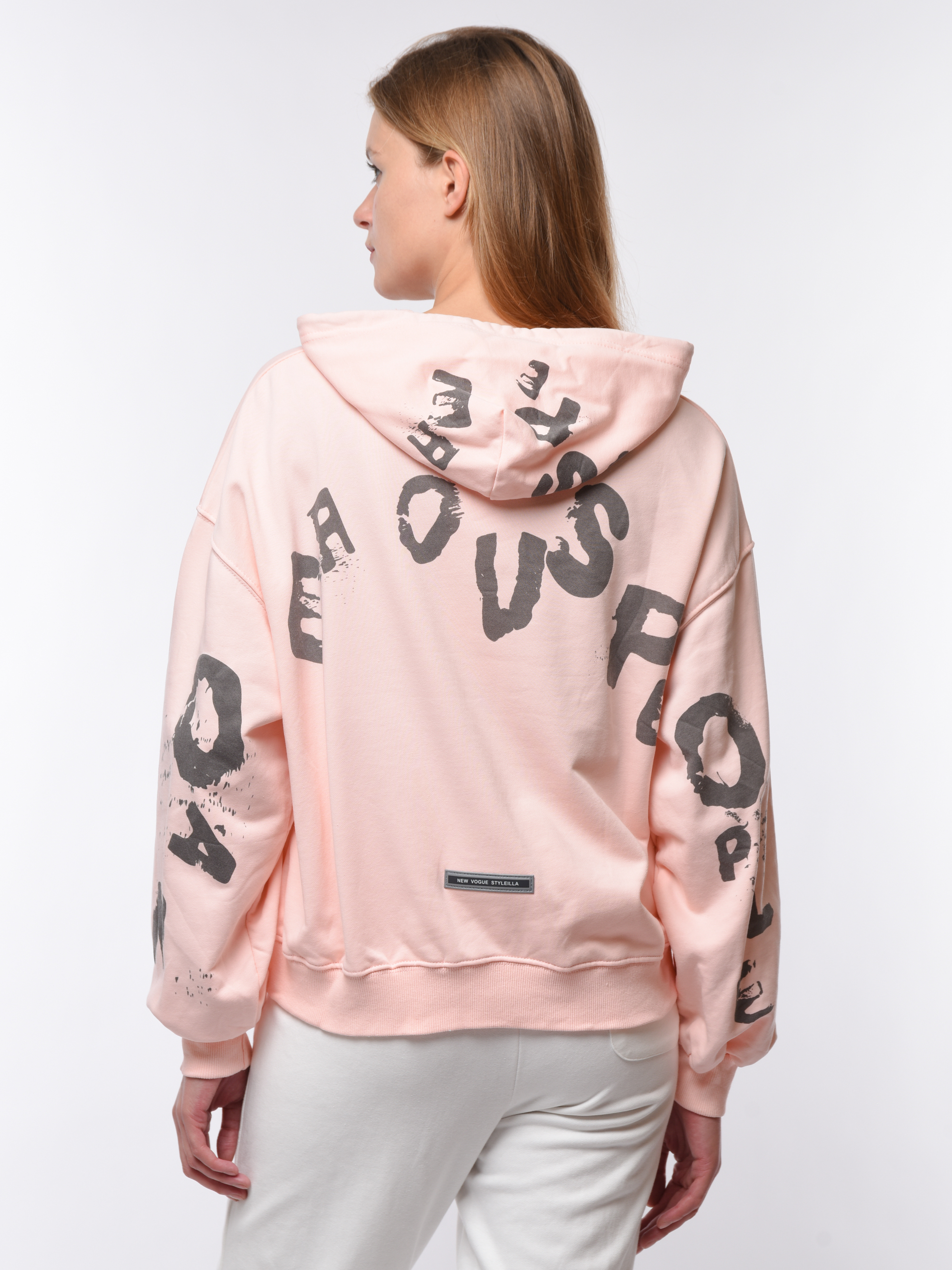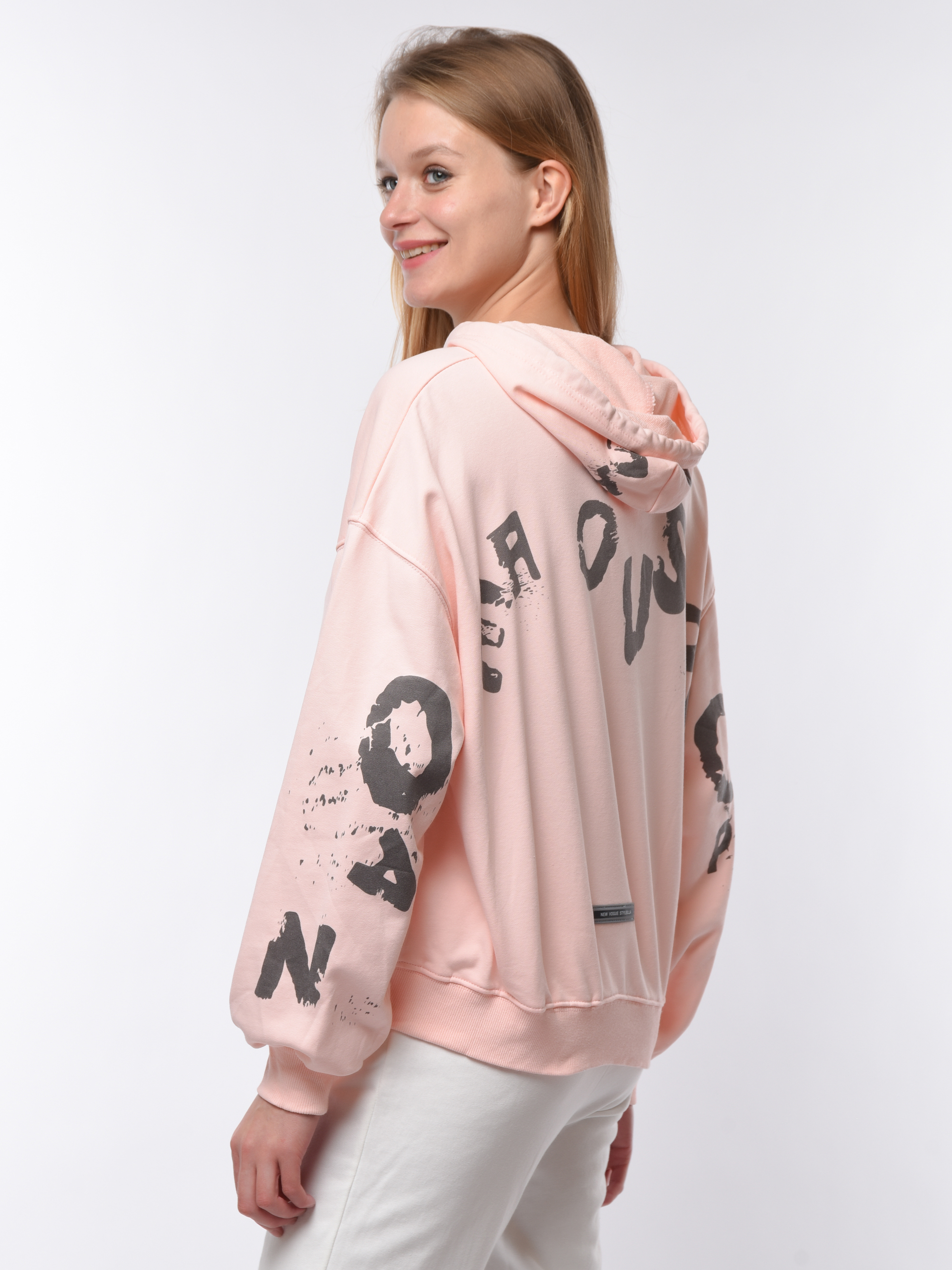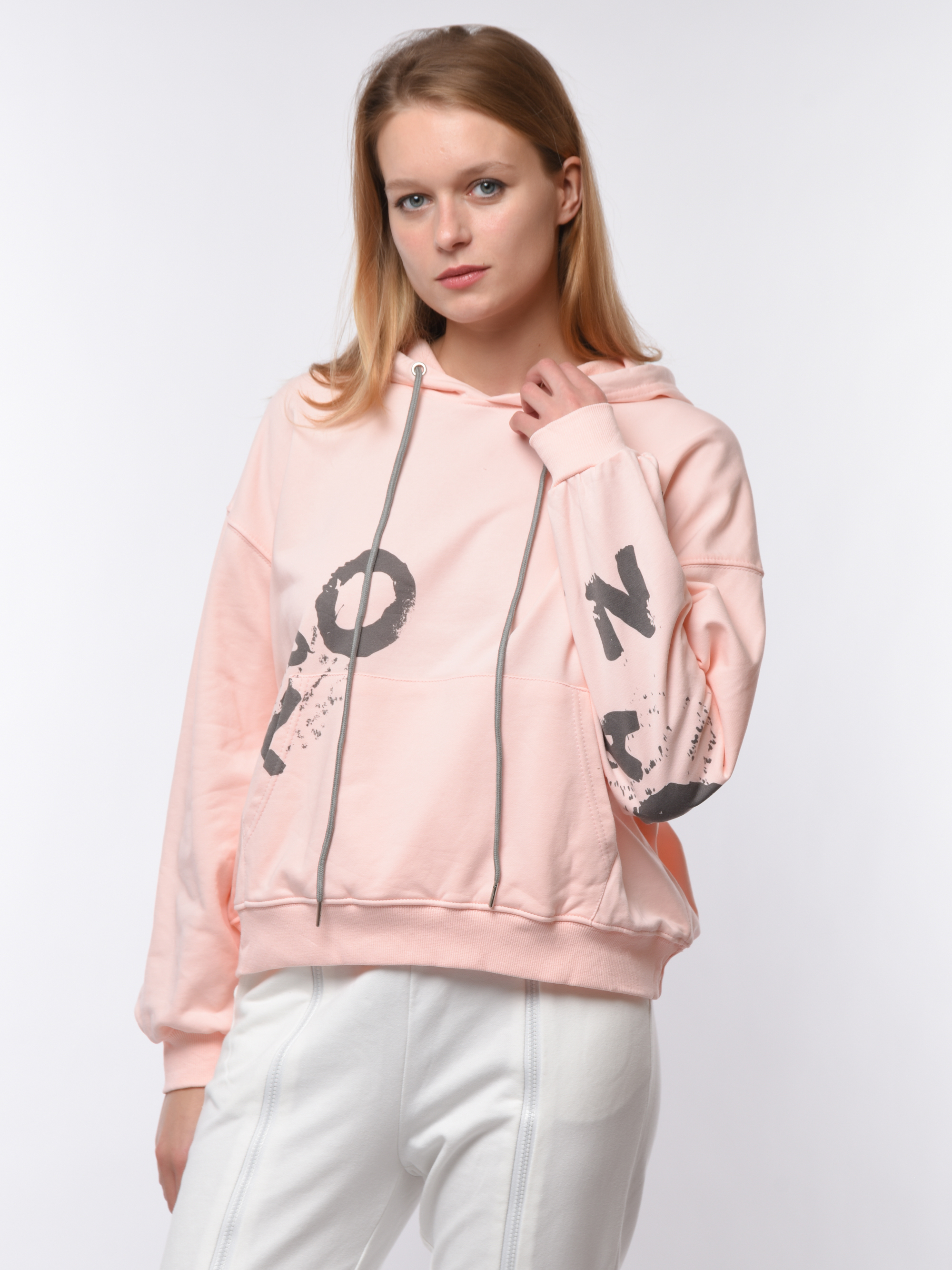 Толстовка женская свободного кроя с капюшоном. Дополнена манжетами на рукавах и по низу. По всей поверхности украшена крупными надписями. Изготовлена из комфортного материала, сочетающего практичность эластана и натуральность хлопка. Идеально подходит для ежедневной носки и активного отдыха. Удобна и долговечна благодаря качественному исполнению от бренда Cascatto. Рекомендуется бережная стирка при 30°C.