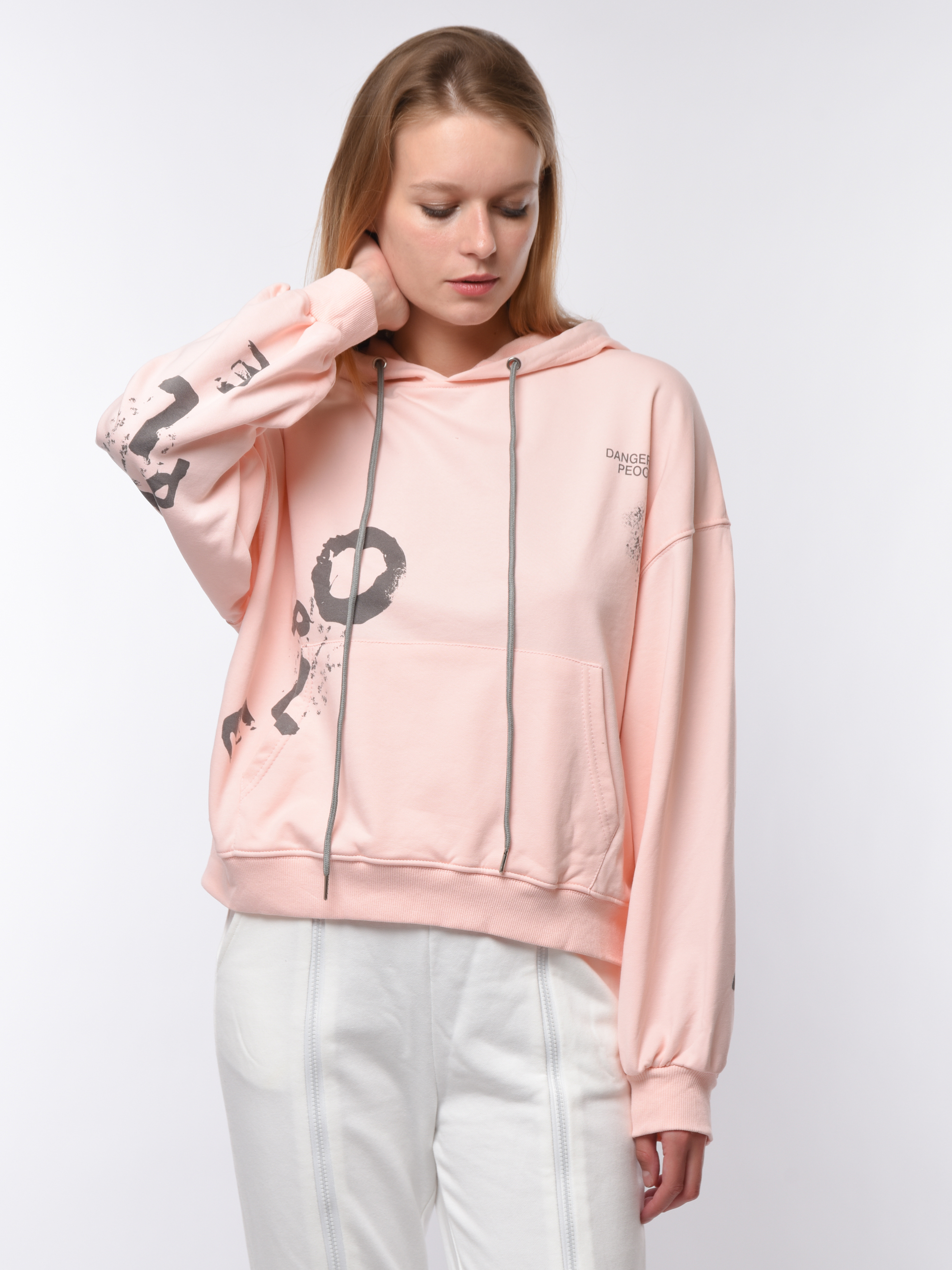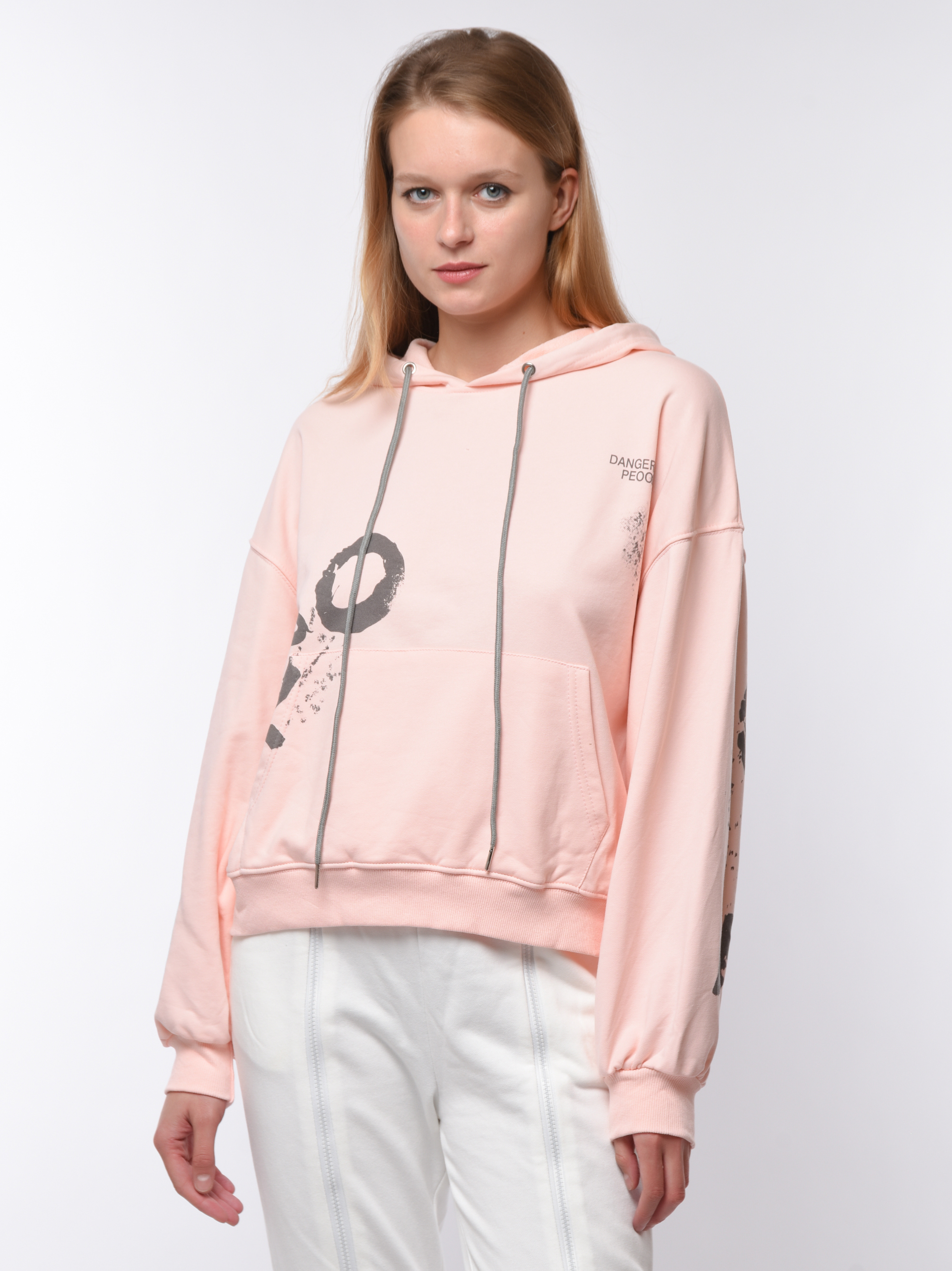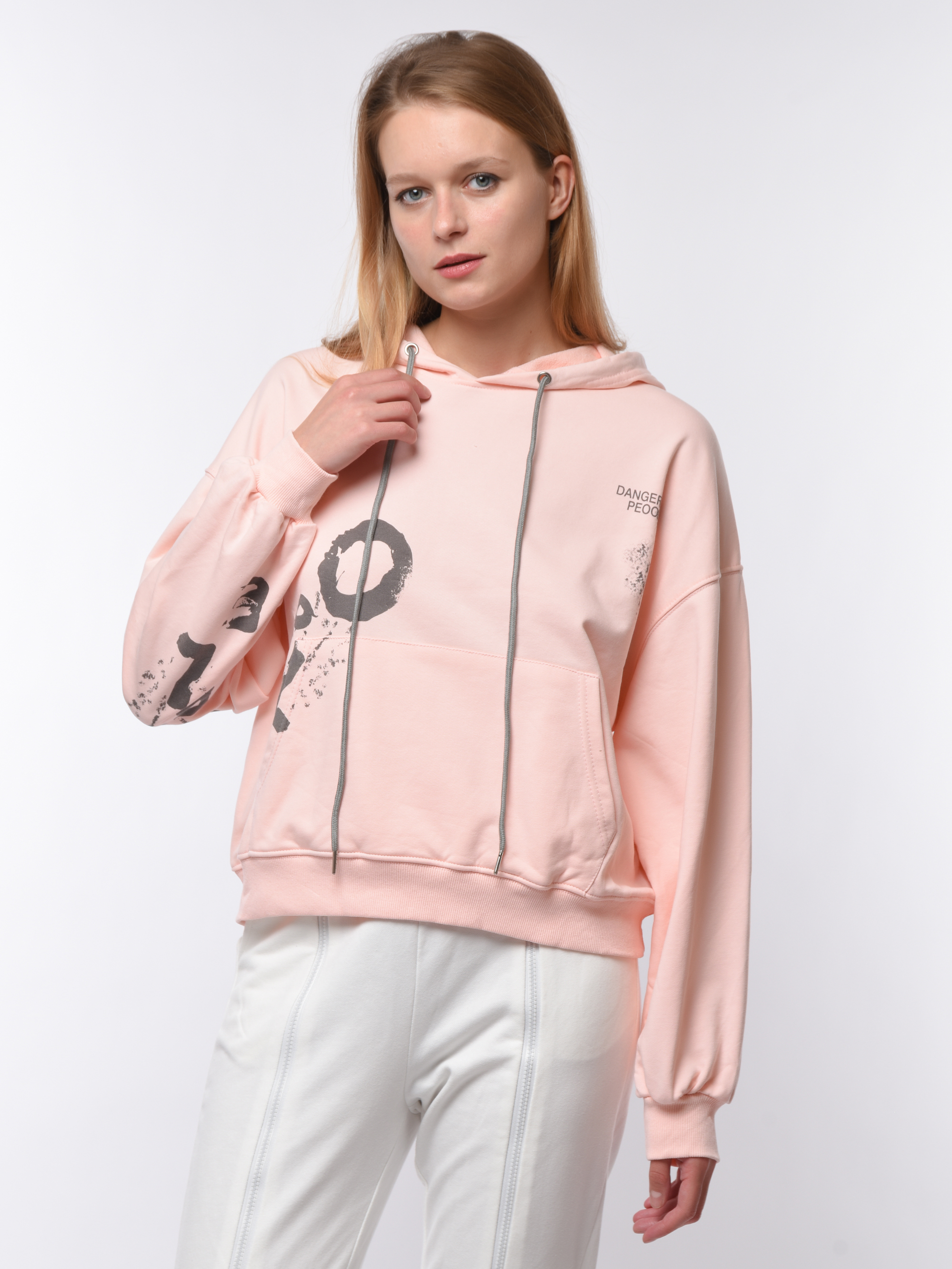 Толстовка женская свободного кроя с капюшоном. Дополнена манжетами на рукавах и по низу. По всей поверхности украшена крупными надписями. Изготовлена из комфортного материала, сочетающего практичность эластана и натуральность хлопка. Идеально подходит для ежедневной носки и активного отдыха. Удобна и долговечна благодаря качественному исполнению от бренда Cascatto. Рекомендуется бережная стирка при 30°C.