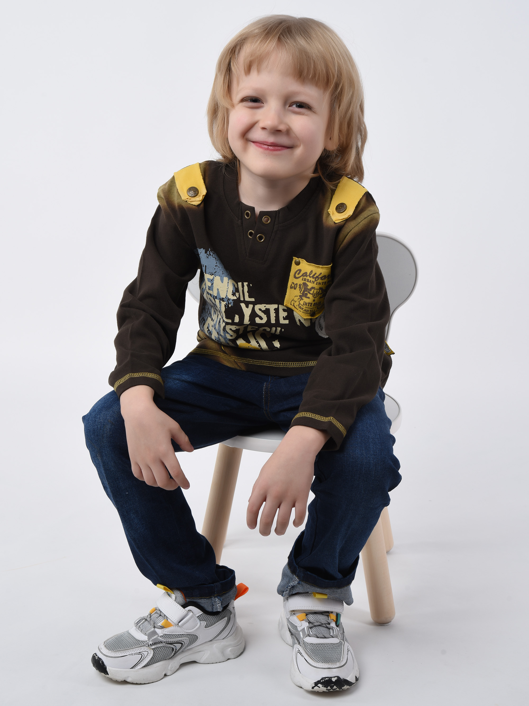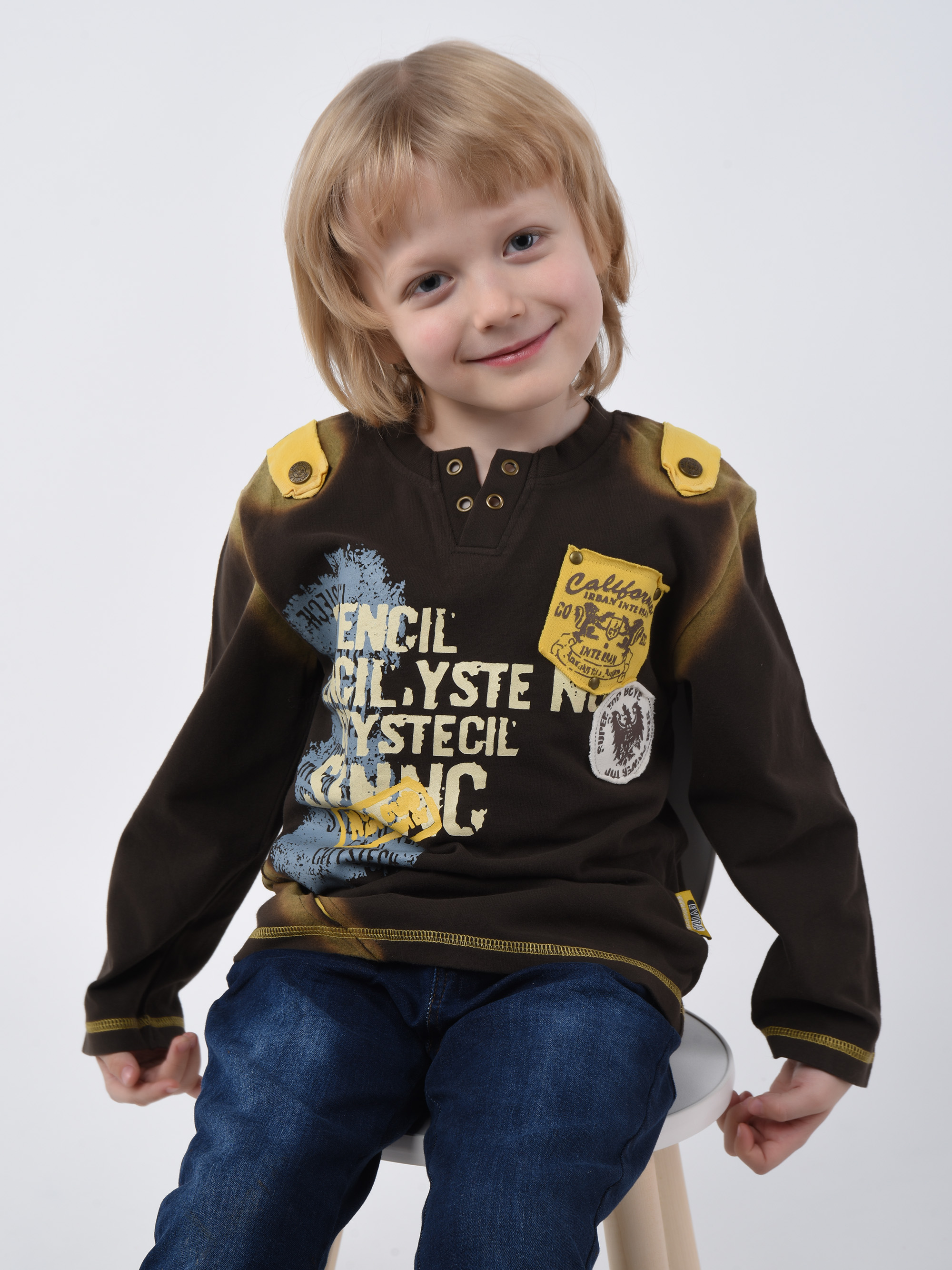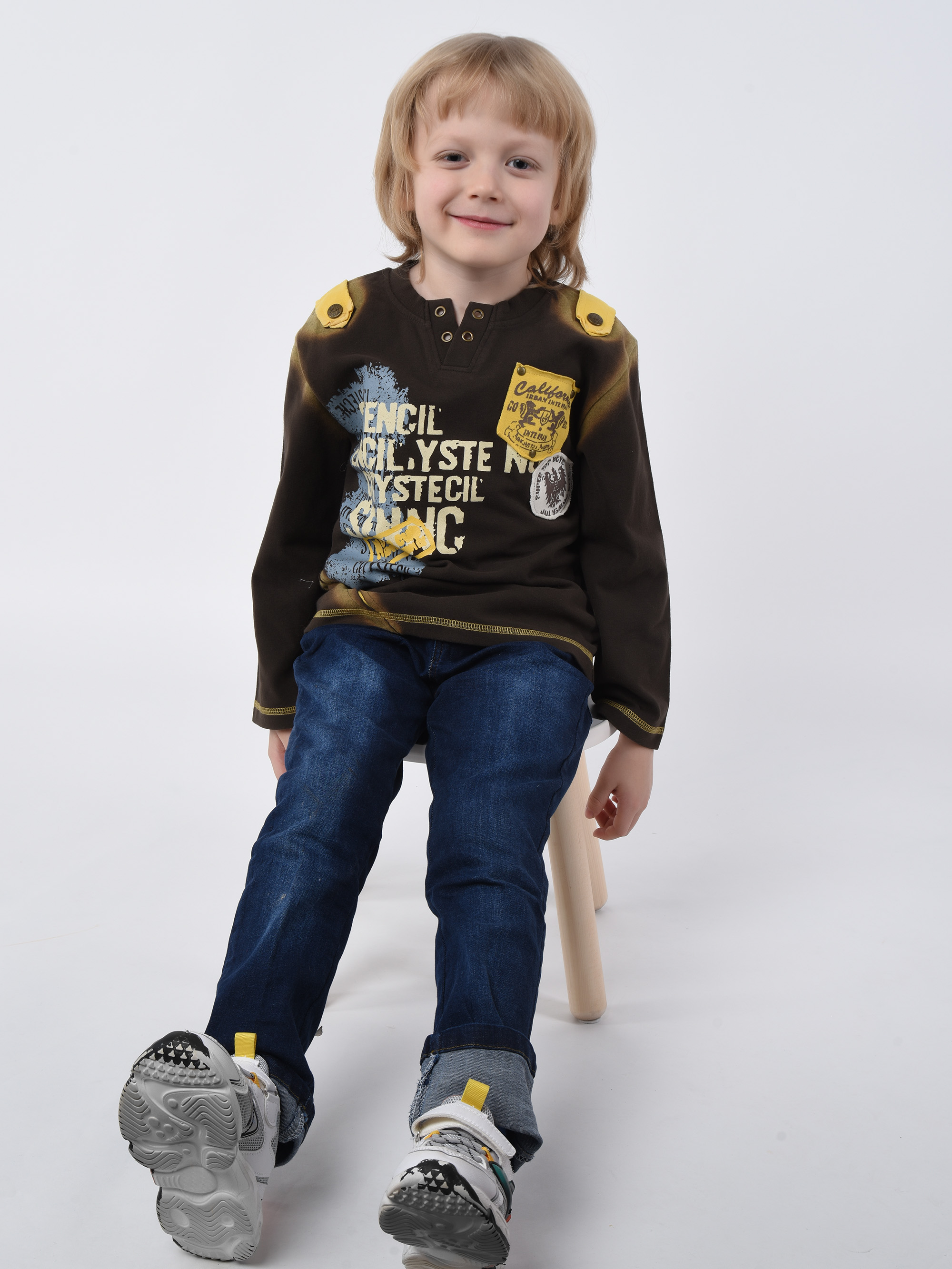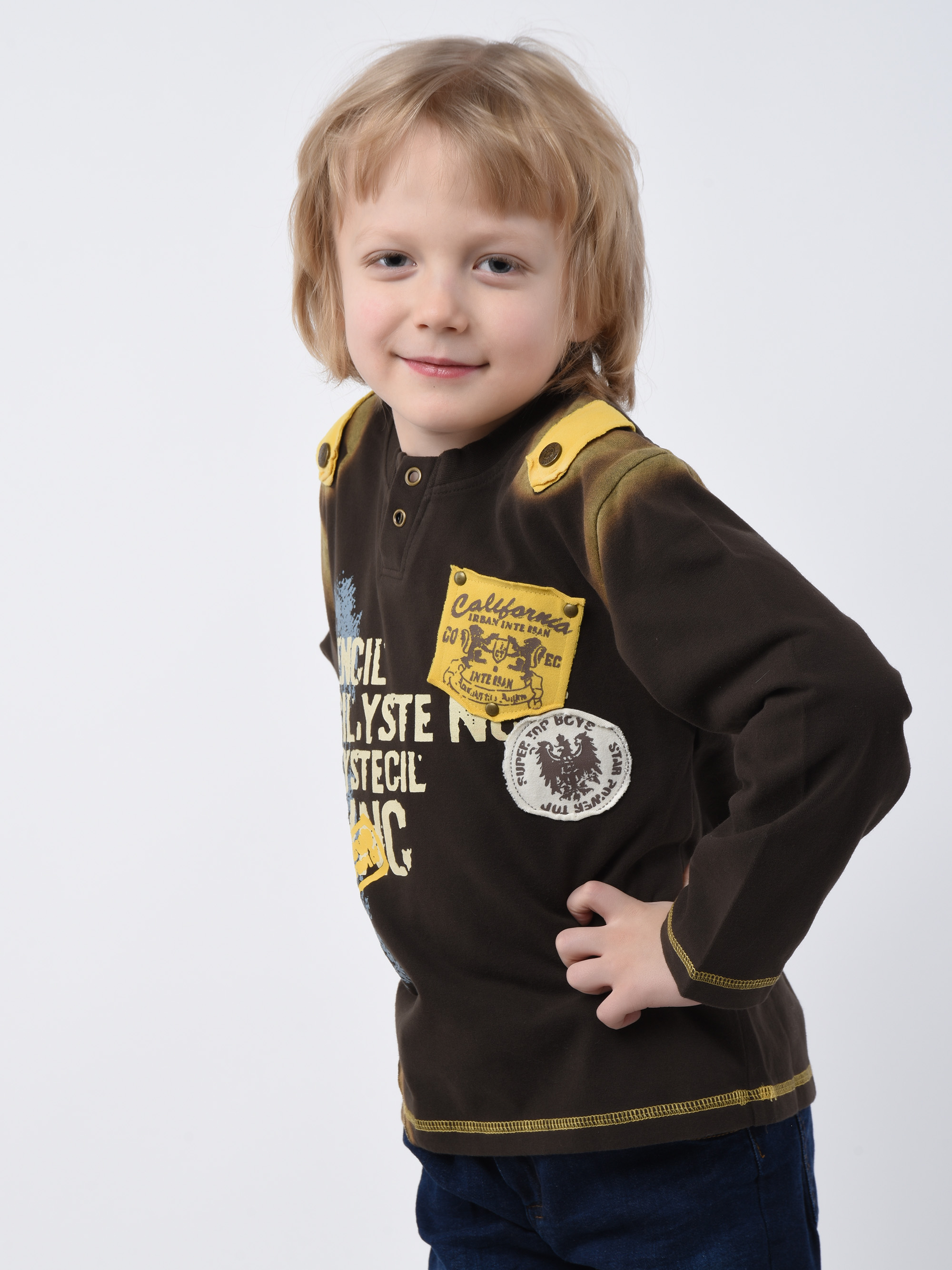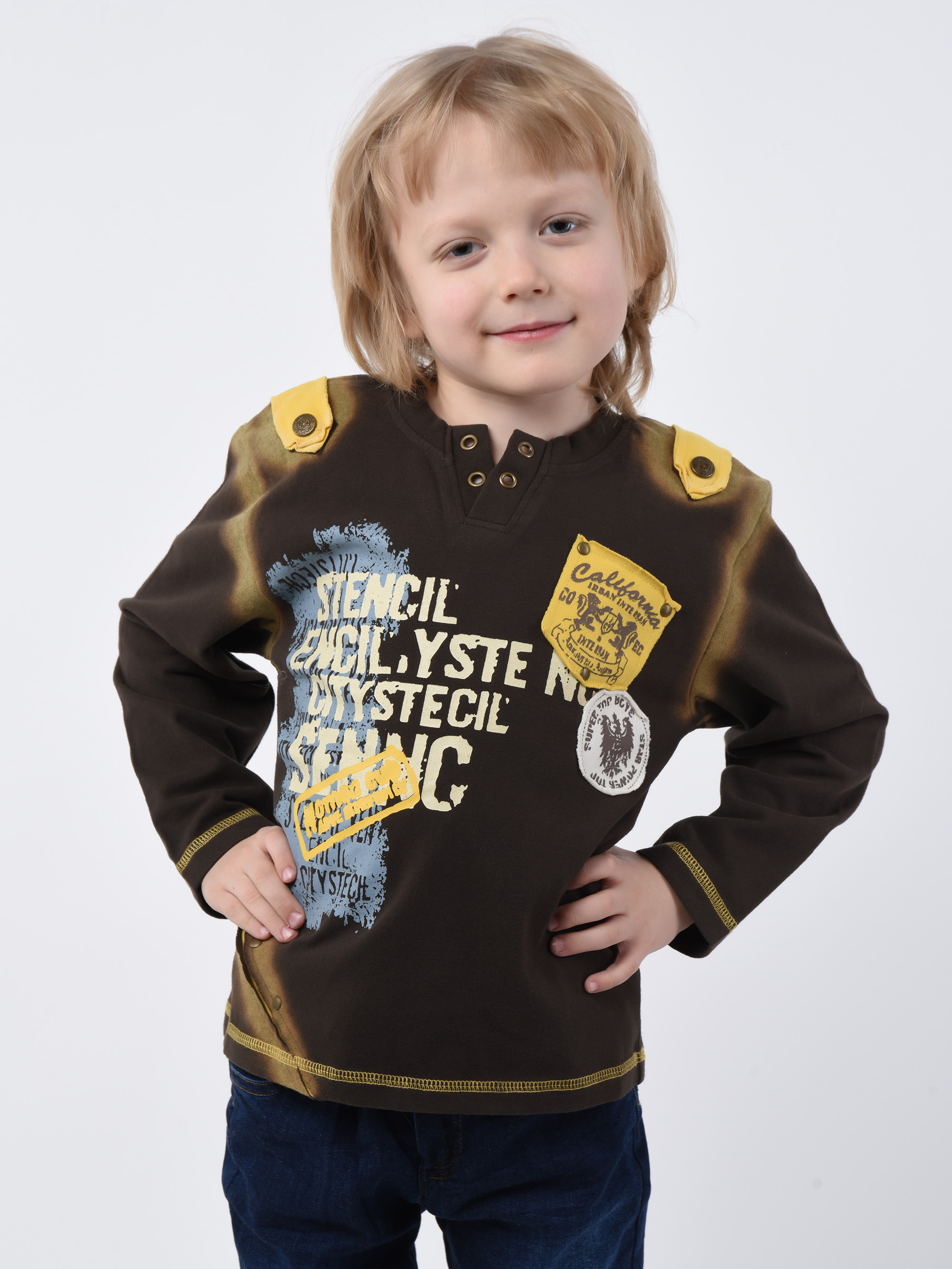 Детский джемпер цвета кофе стилизованный декоративными прорезями, погонами, и ярким принтом. Изготовлена из тонкого хлопкового материала. Фасон гипоаллергенного джемпера никогда не наскучит малышу. Мастера Csacatto детализовали его металлическими кнопками, пуговицами, и лоскутными логотипами. Гигроскопичный материал защищает кожу от переохлаждения и не препятствует воздухопроницаемости. Плотная и нежная ткань не вызывает аллергических реакций. Вырез горловины обработан широкой бейкой из трикотажа. Кромка подола и длинных рукавов окантованы петельной плоской строчкой. Разноцветный принт переда разнообразит настроение интересным мотивом!