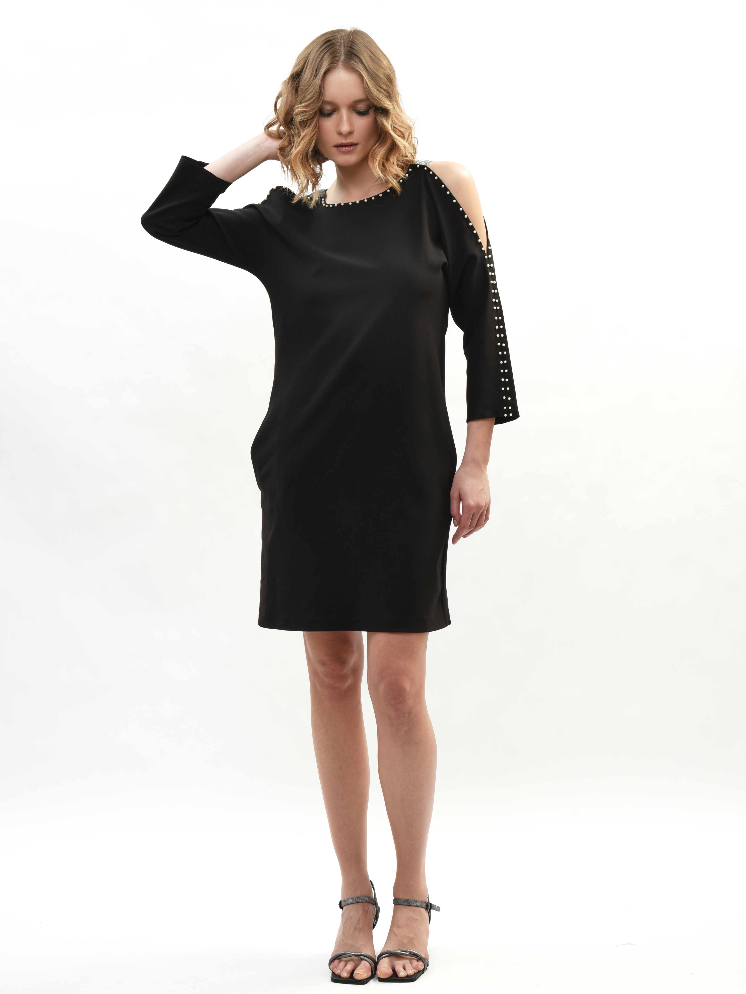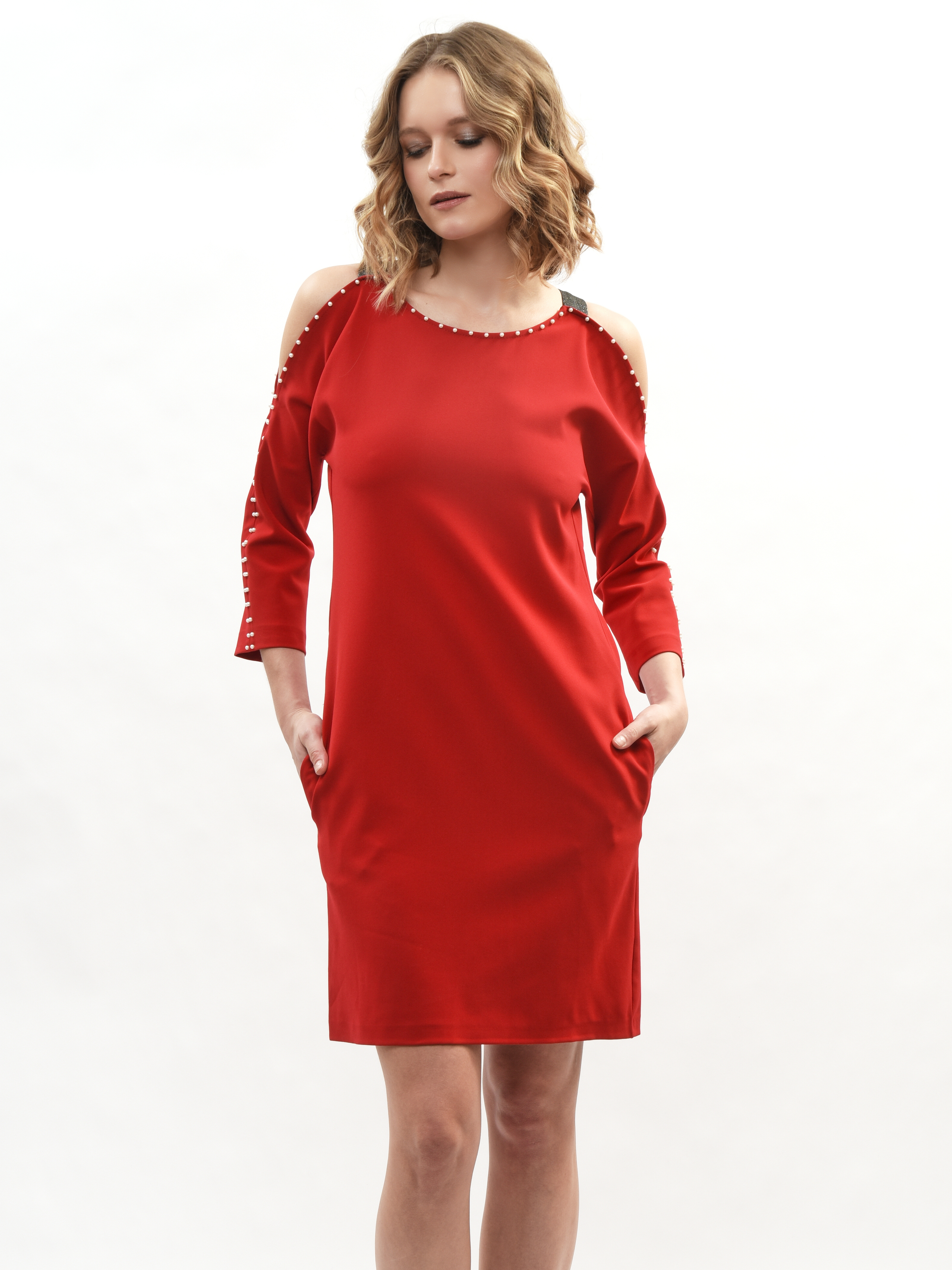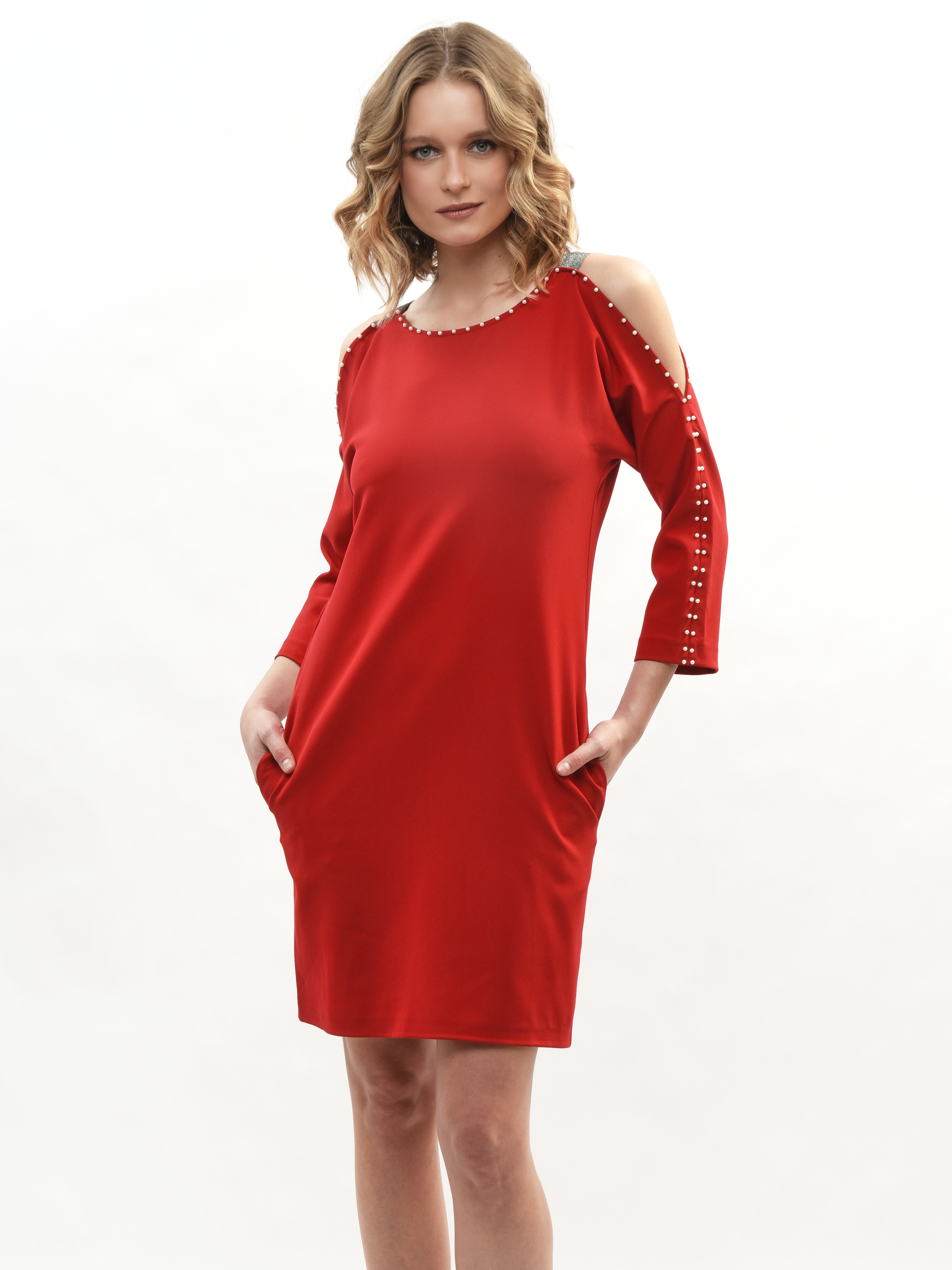 Стильное, укороченное платье с открытыми плечами. Изящные цельнокроеные рукава длины 3/4 расшиты бусинами, подчеркивают достоинства фигуры, а свободный силуэт с удобными боковыми карманами придает уверенности. Широкий вырез-«лодочка», эластичные внутренние лямки обеспечивают комфорт и безупречный внешний вид. Платье идеально как для повседневной носки, так и для праздников!