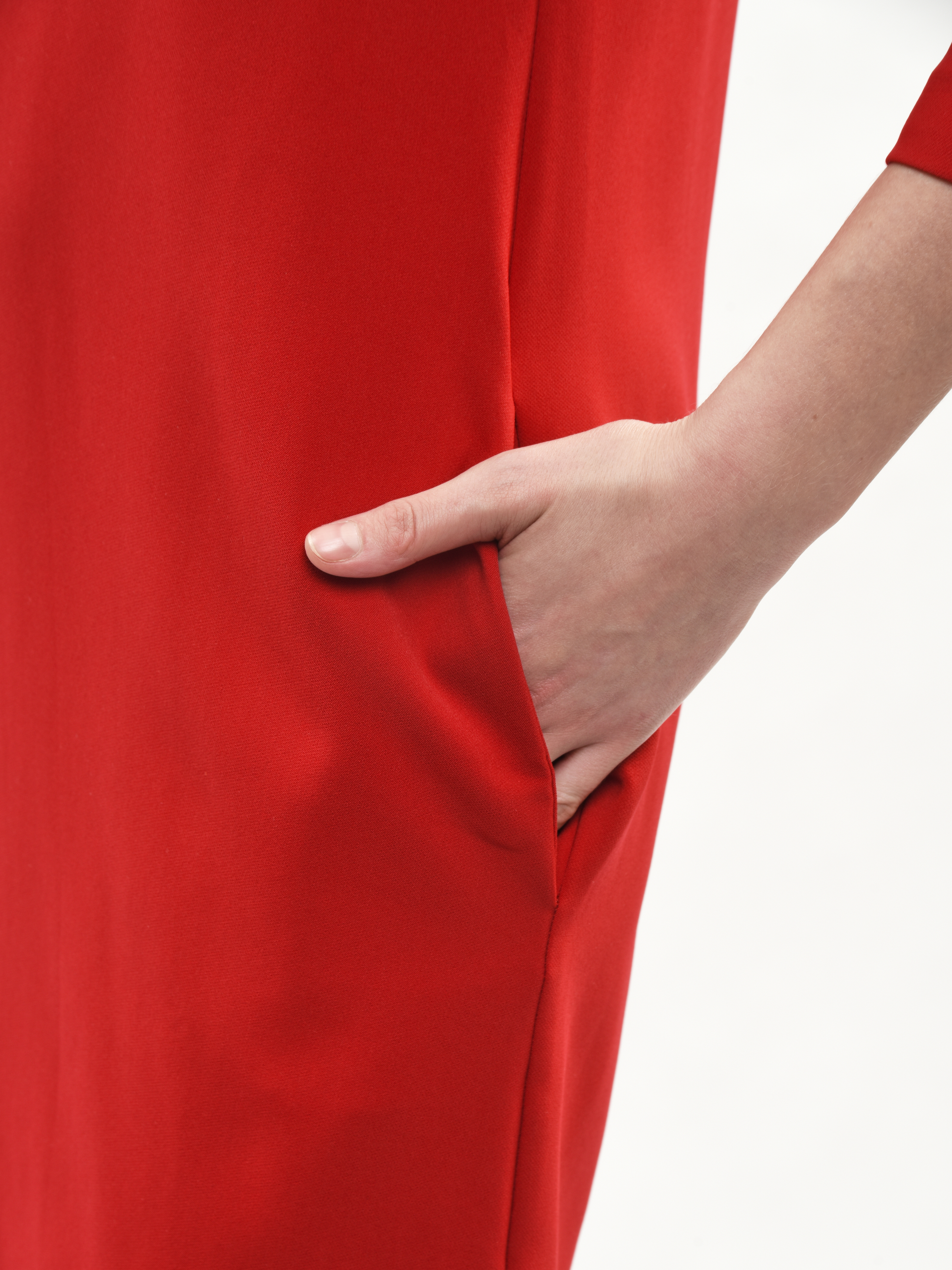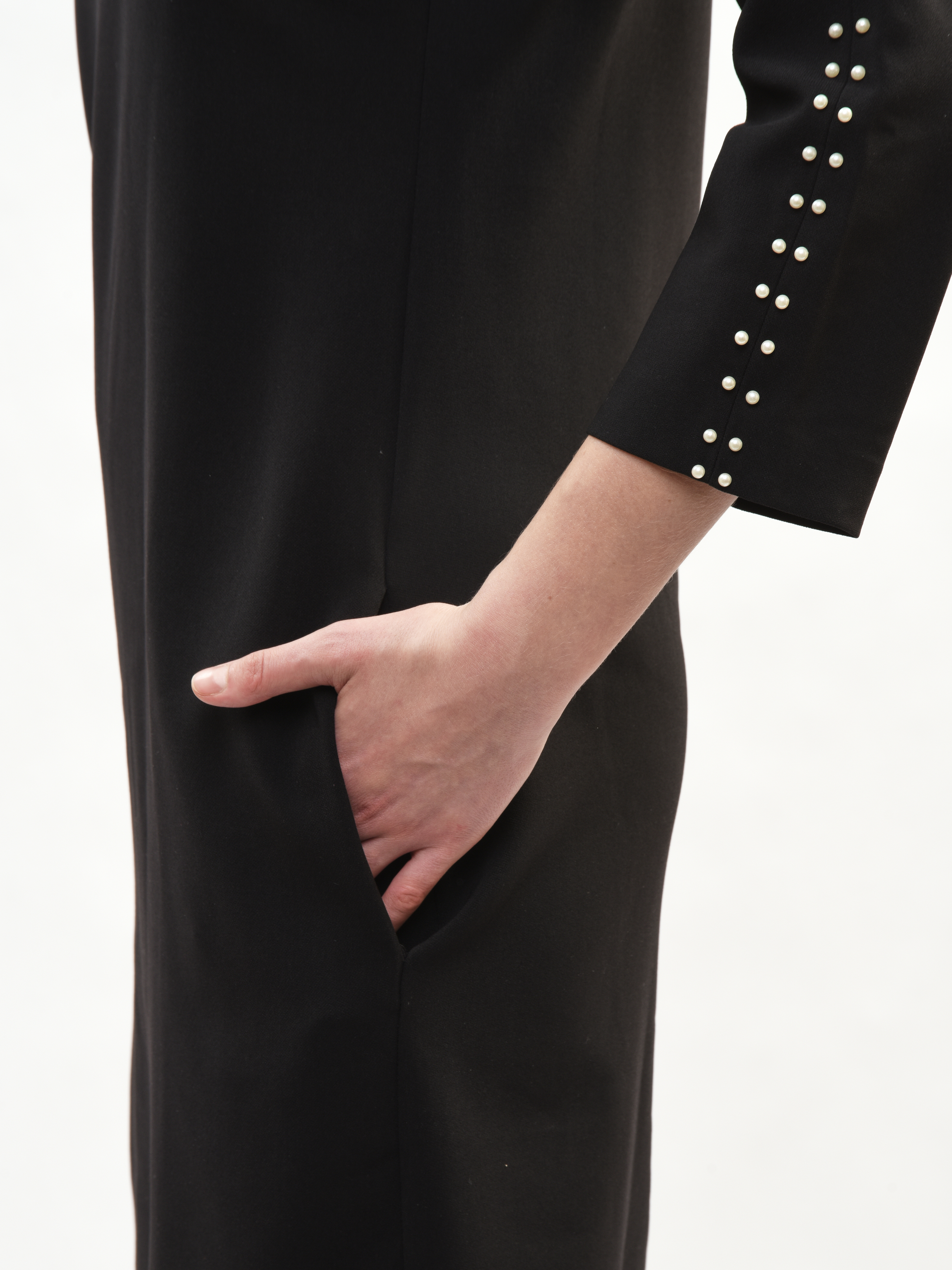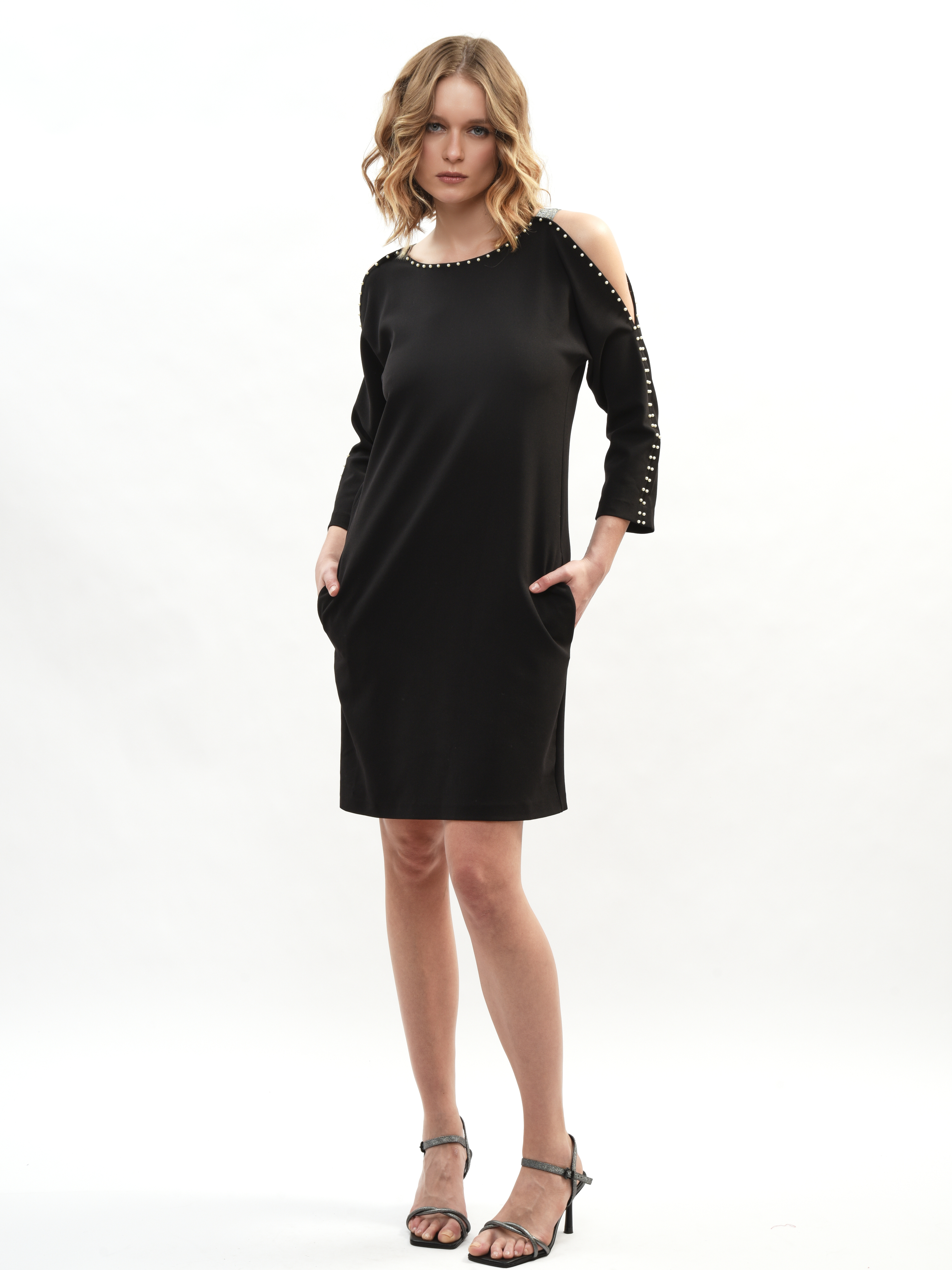 Стильное, укороченное платье с открытыми плечами. Изящные цельнокроеные рукава длины 3/4 расшиты бусинами, подчеркивают достоинства фигуры, а свободный силуэт с удобными боковыми карманами придает уверенности. Широкий вырез-«лодочка», эластичные внутренние лямки обеспечивают комфорт и безупречный внешний вид. Платье идеально как для повседневной носки, так и для праздников!