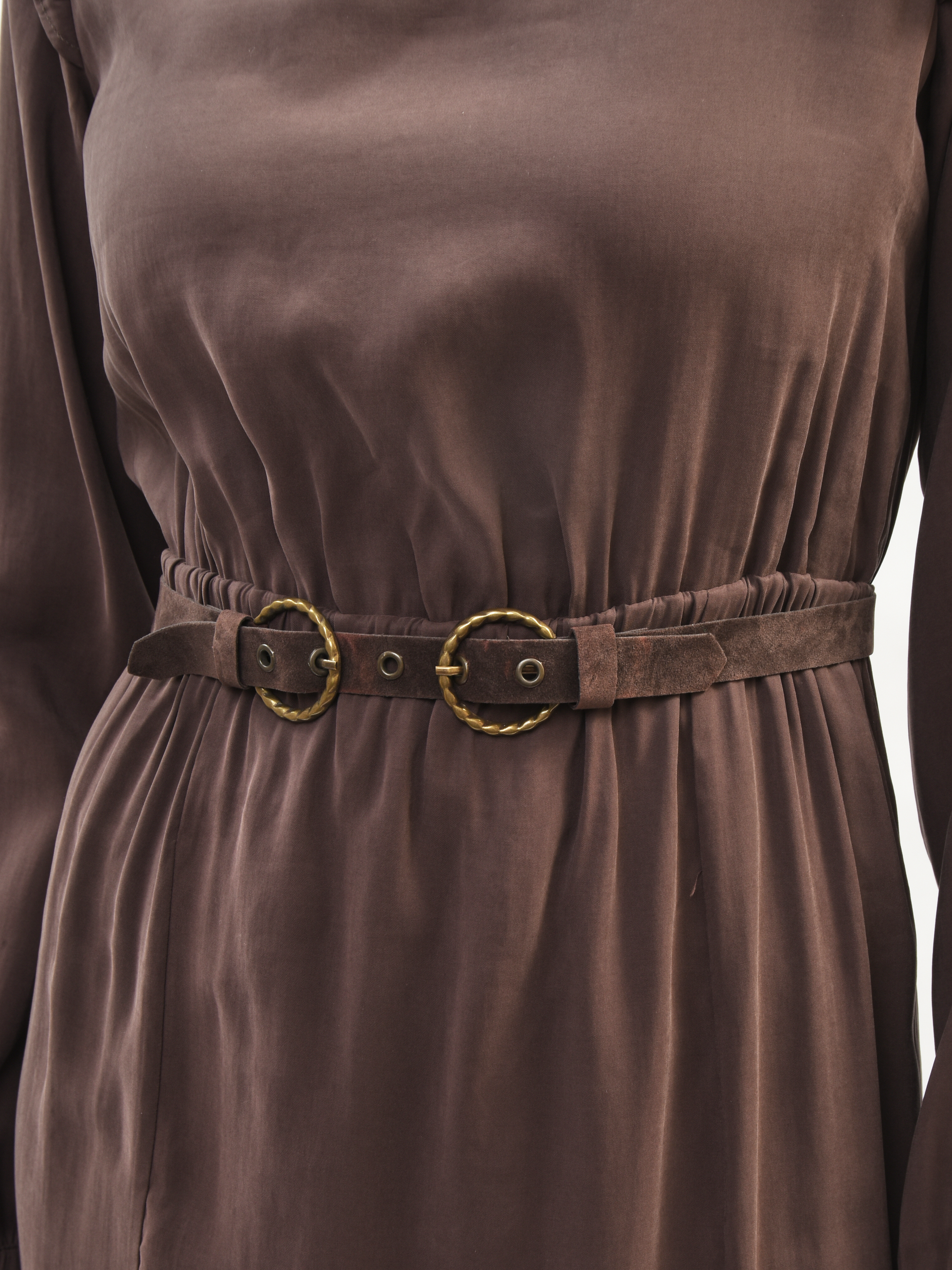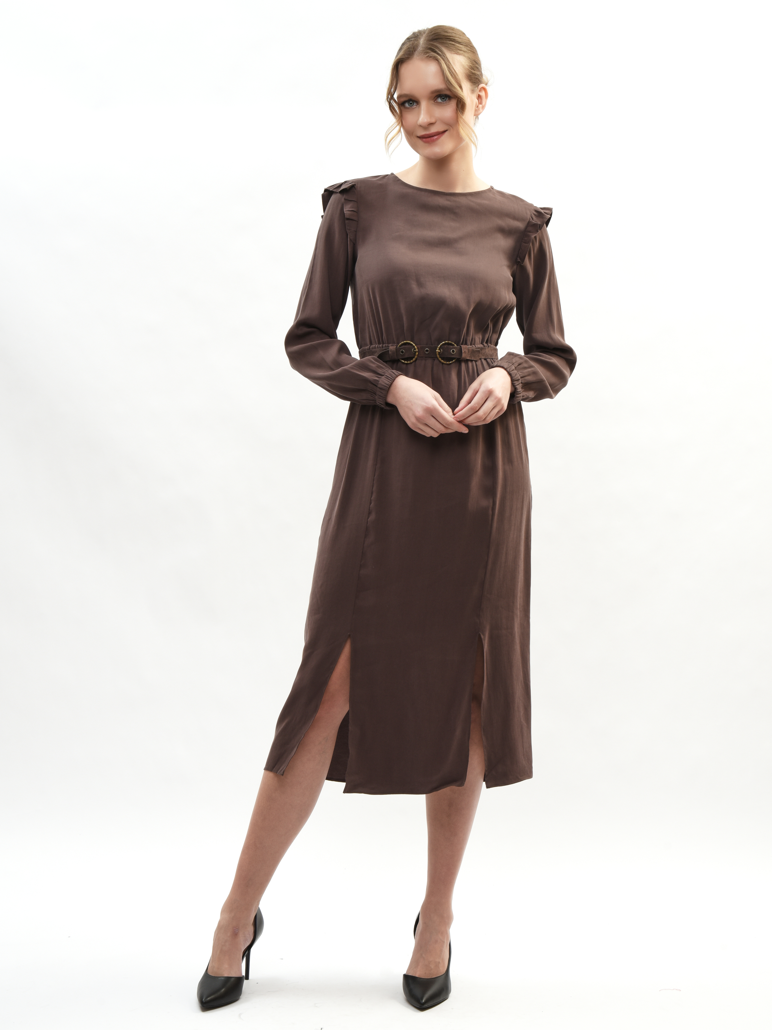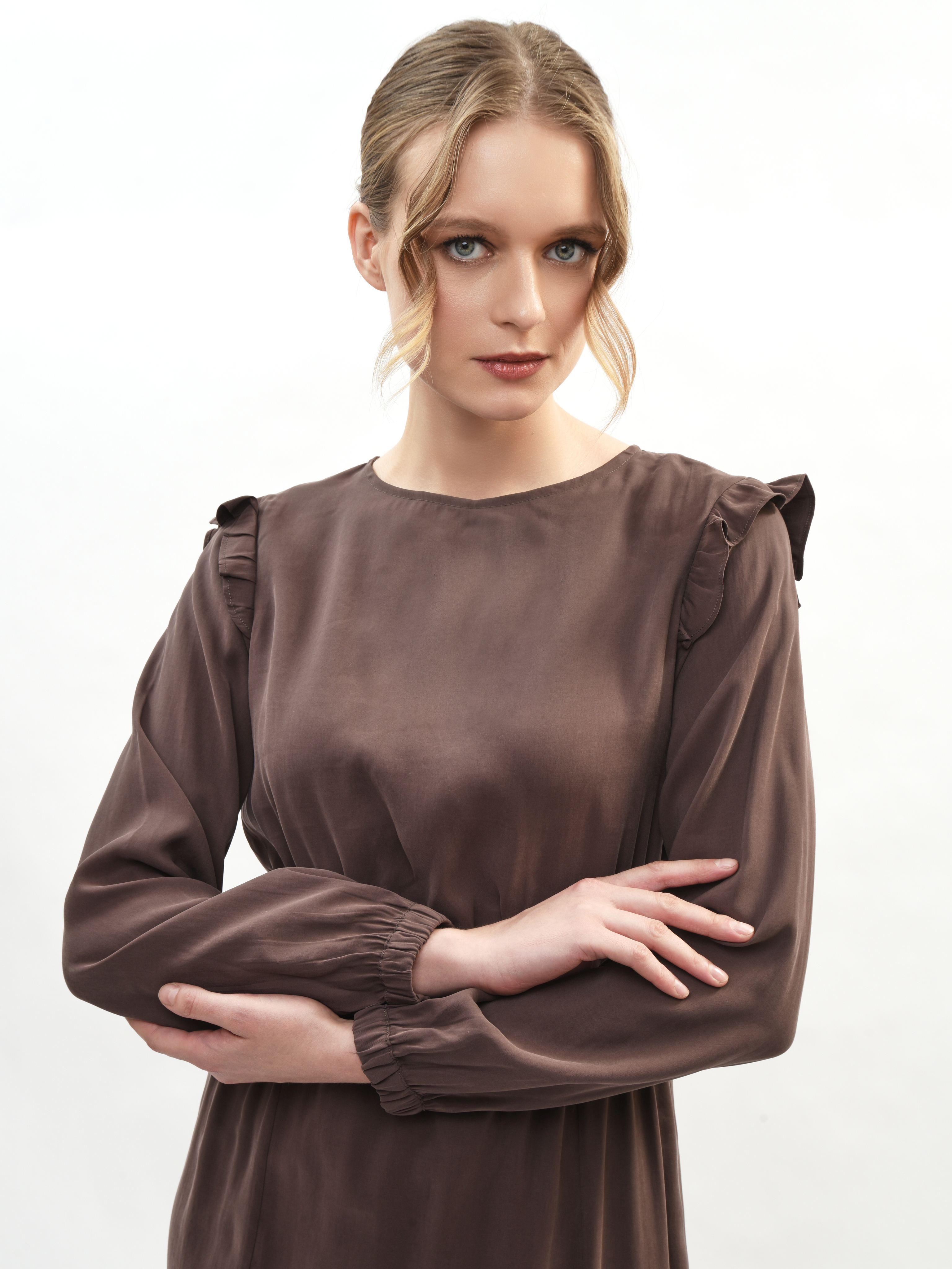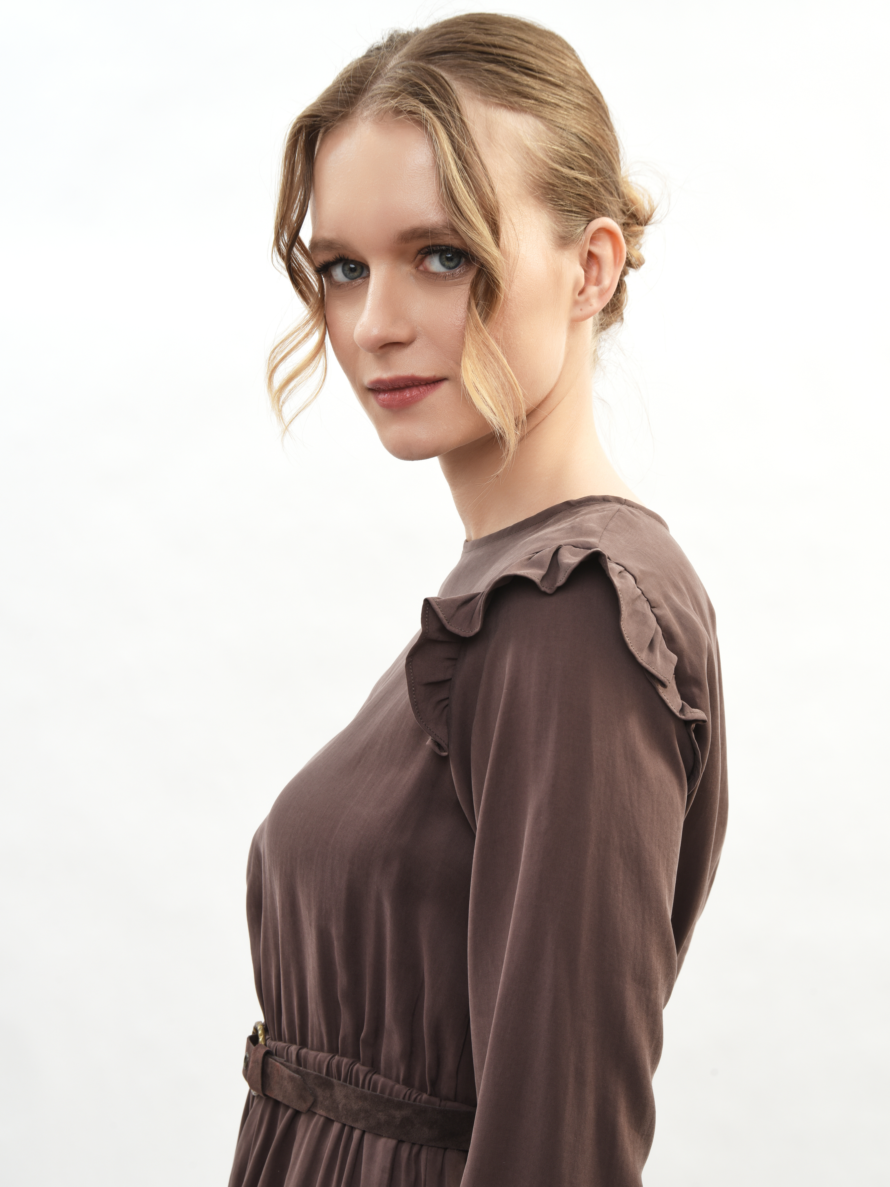 Женское платье длиной миди, с круглой горловиной и рюшами на плечах. Изготовлено из легкого, струящегося материала. Модель свободного кроя, застегивается на одну пуговицу на спинке. Свободные рукава «Епископ» оформлены узкими манжетами. В подарок модельеры Cascatto прилагают пояс из натуральной замши. Он подчеркнет вашу женственную фигуру. Элегантный наряд подойдет для работы, а также и для выхода в театр после трудового дня.