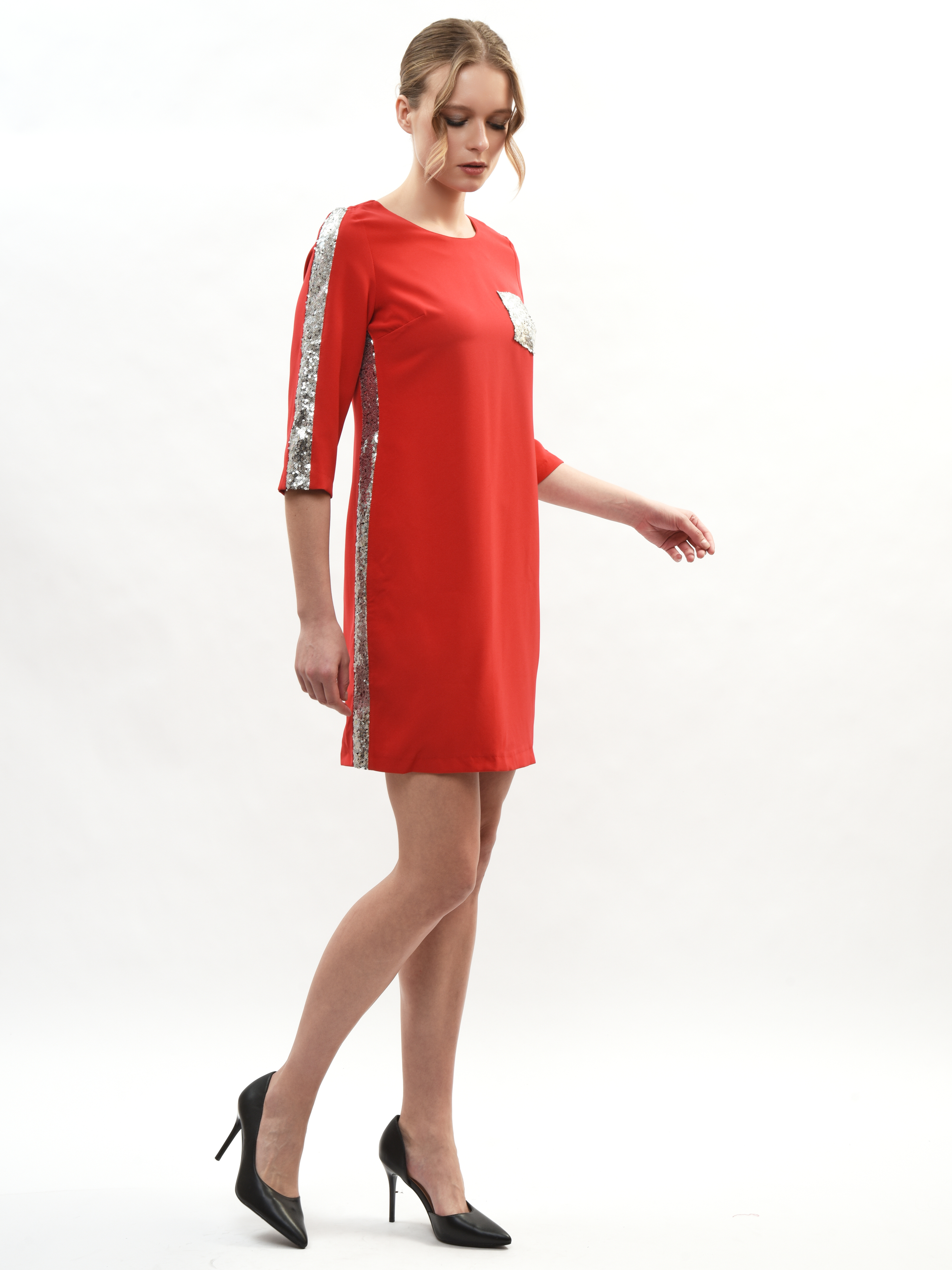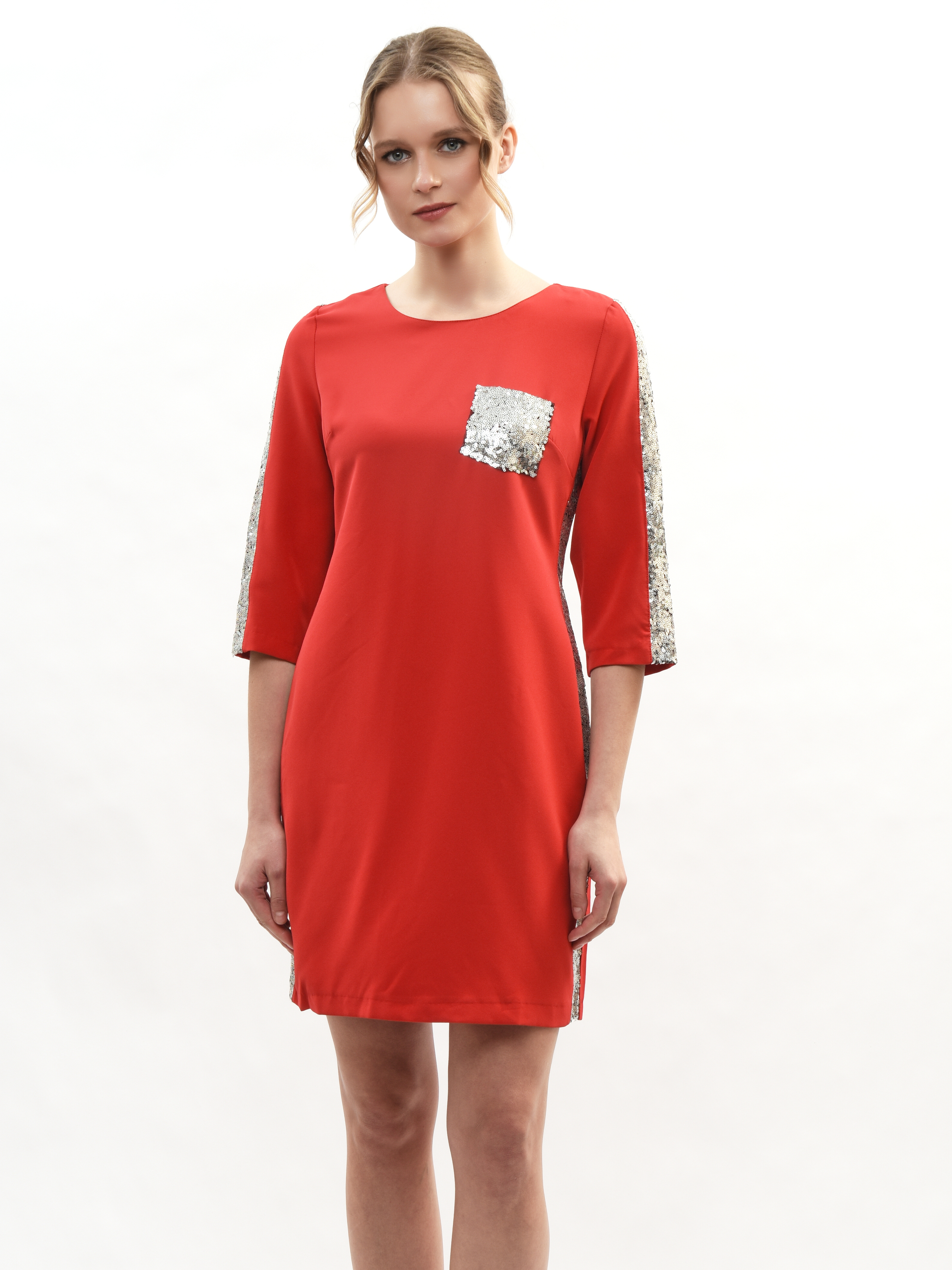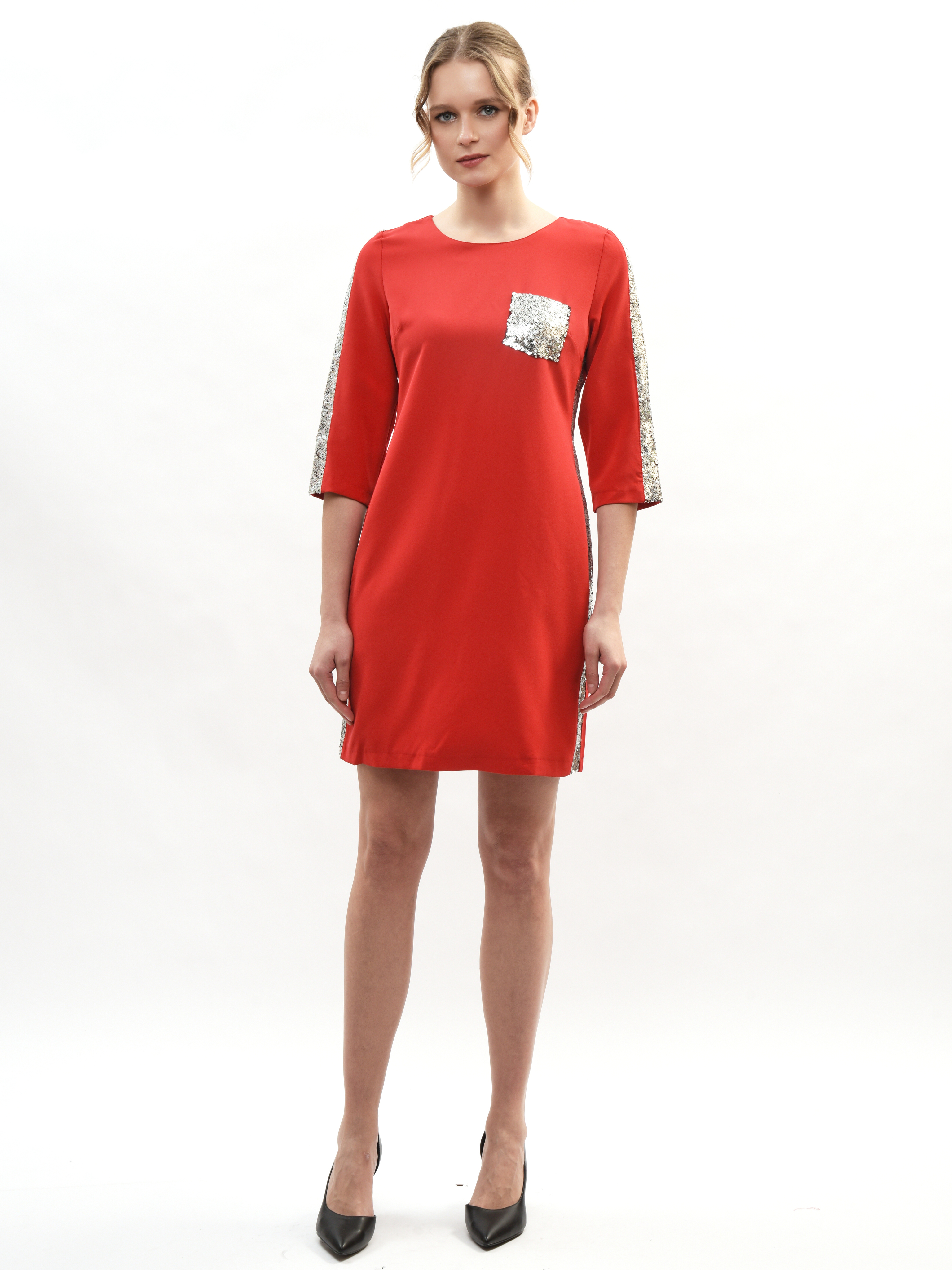 Платье облегающего кроя с рукавами три четверти– яркий акцент вашего образа! Модель зрительно стройнит любую фигуру, благодаря универсальным широким лампасам, которые расшиты блестящими пайетками. Высококачественная материя приятна к телу, обеспечивает комфорт и свободу движений. Стильное решение как для вечеринки, так и повседневного выхода!