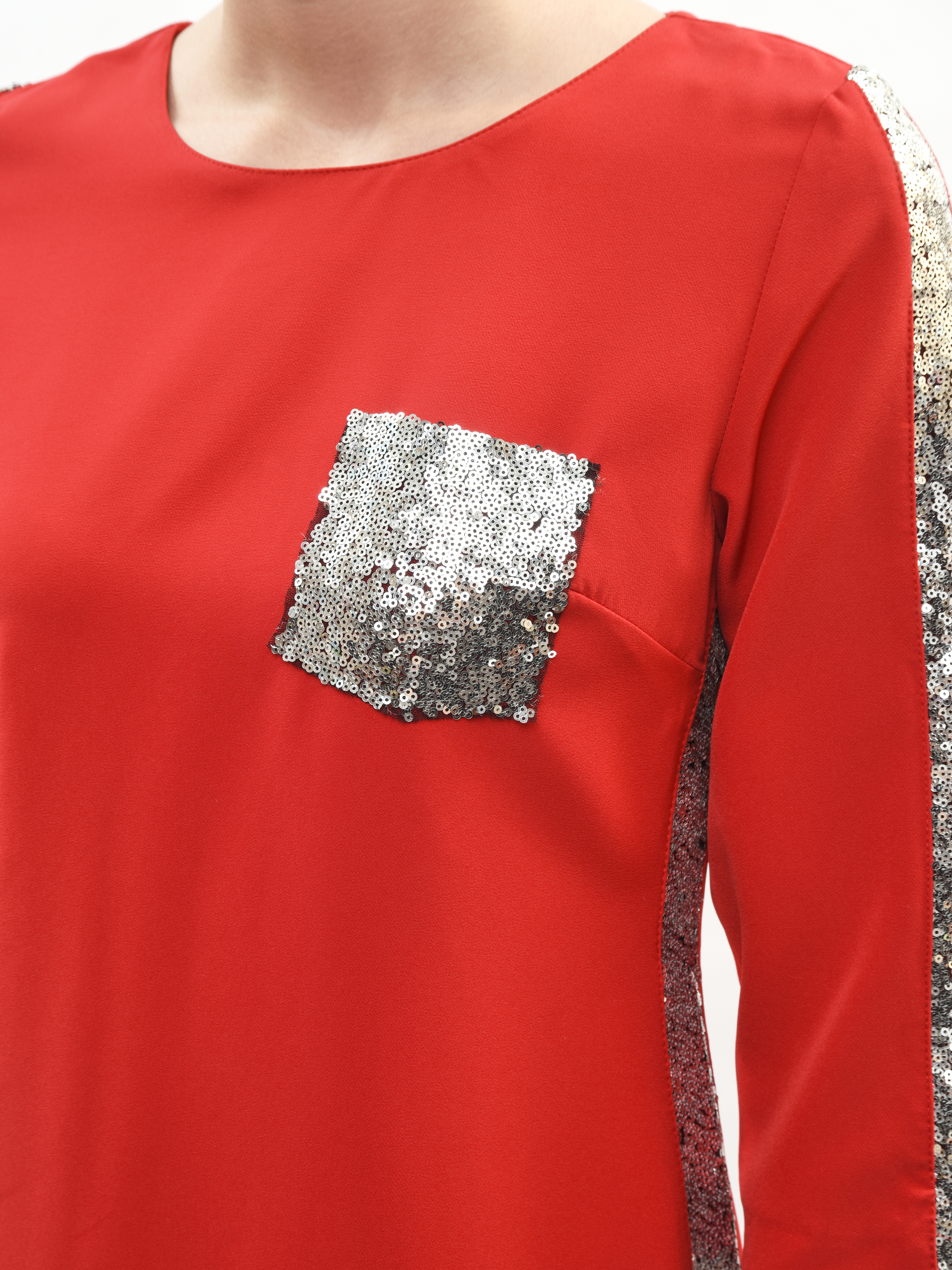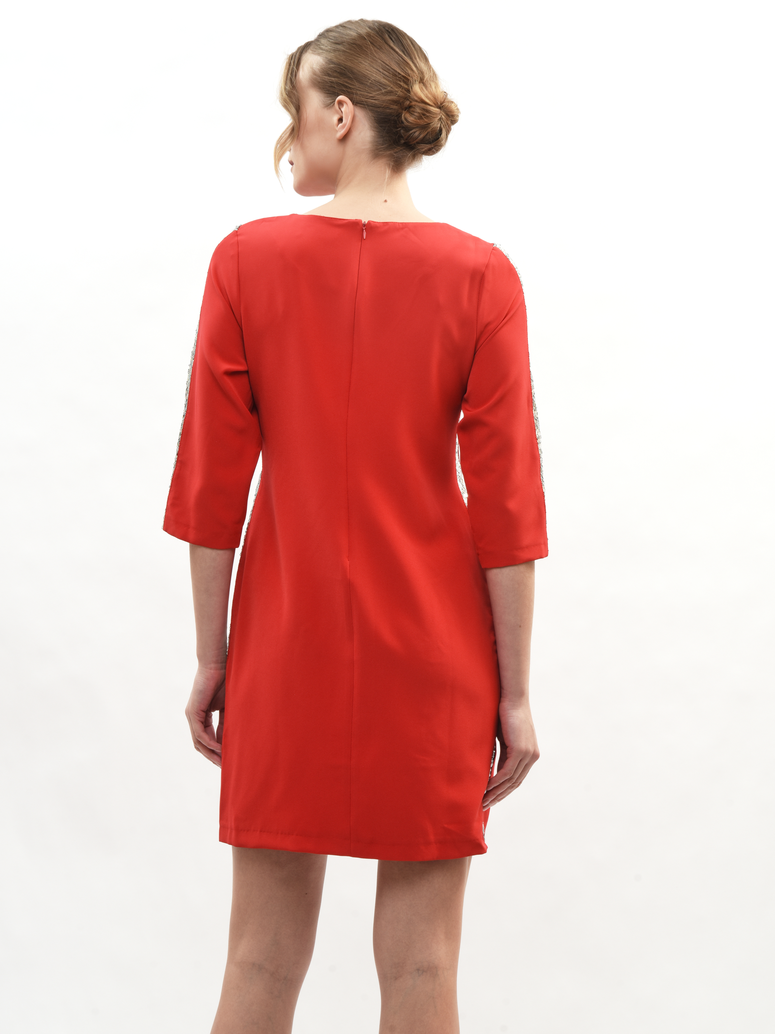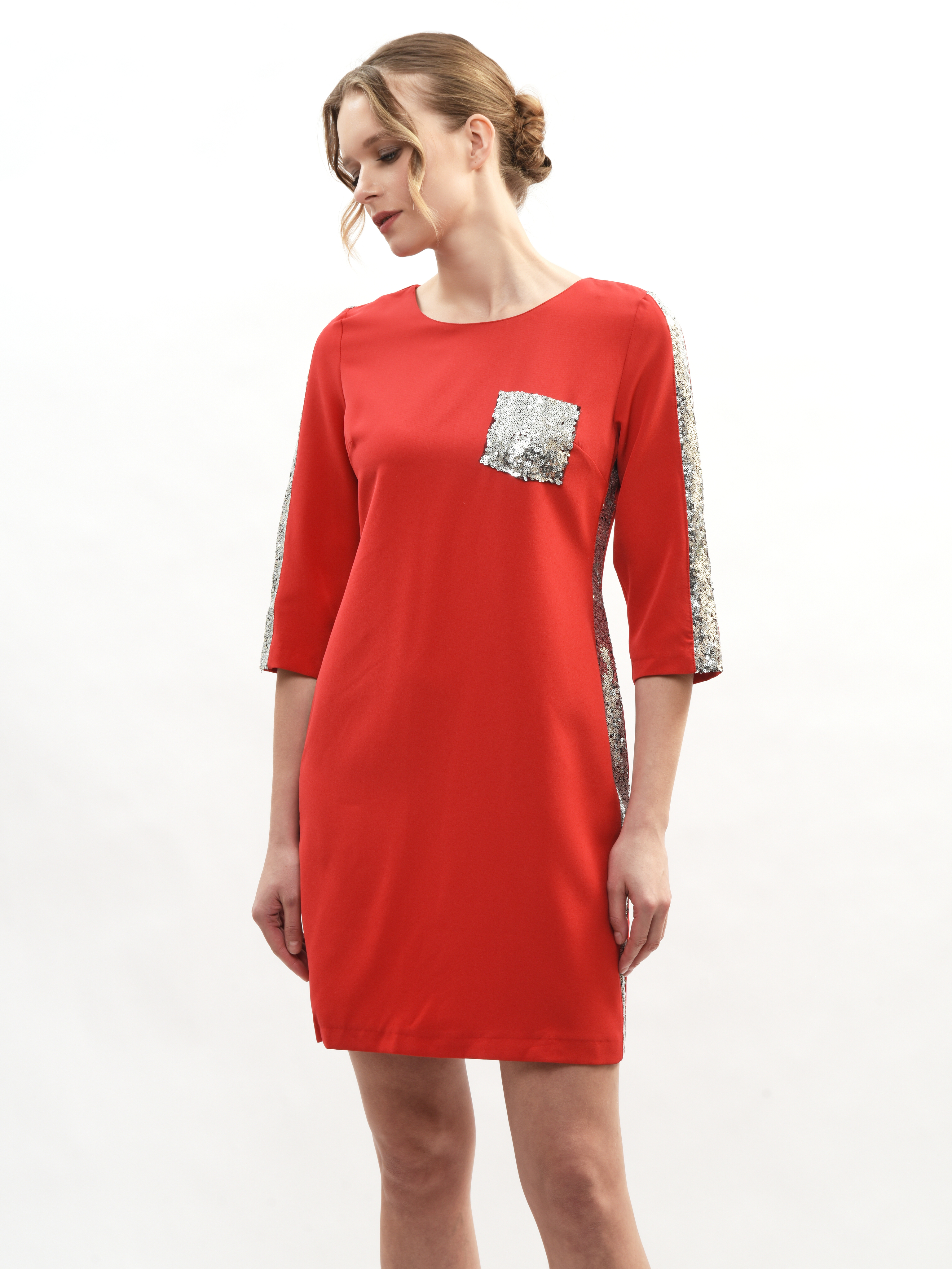 Платье облегающего кроя с рукавами три четверти– яркий акцент вашего образа! Модель зрительно стройнит любую фигуру, благодаря универсальным широким лампасам, которые расшиты блестящими пайетками. Высококачественная материя приятна к телу, обеспечивает комфорт и свободу движений. Стильное решение как для вечеринки, так и повседневного выхода!