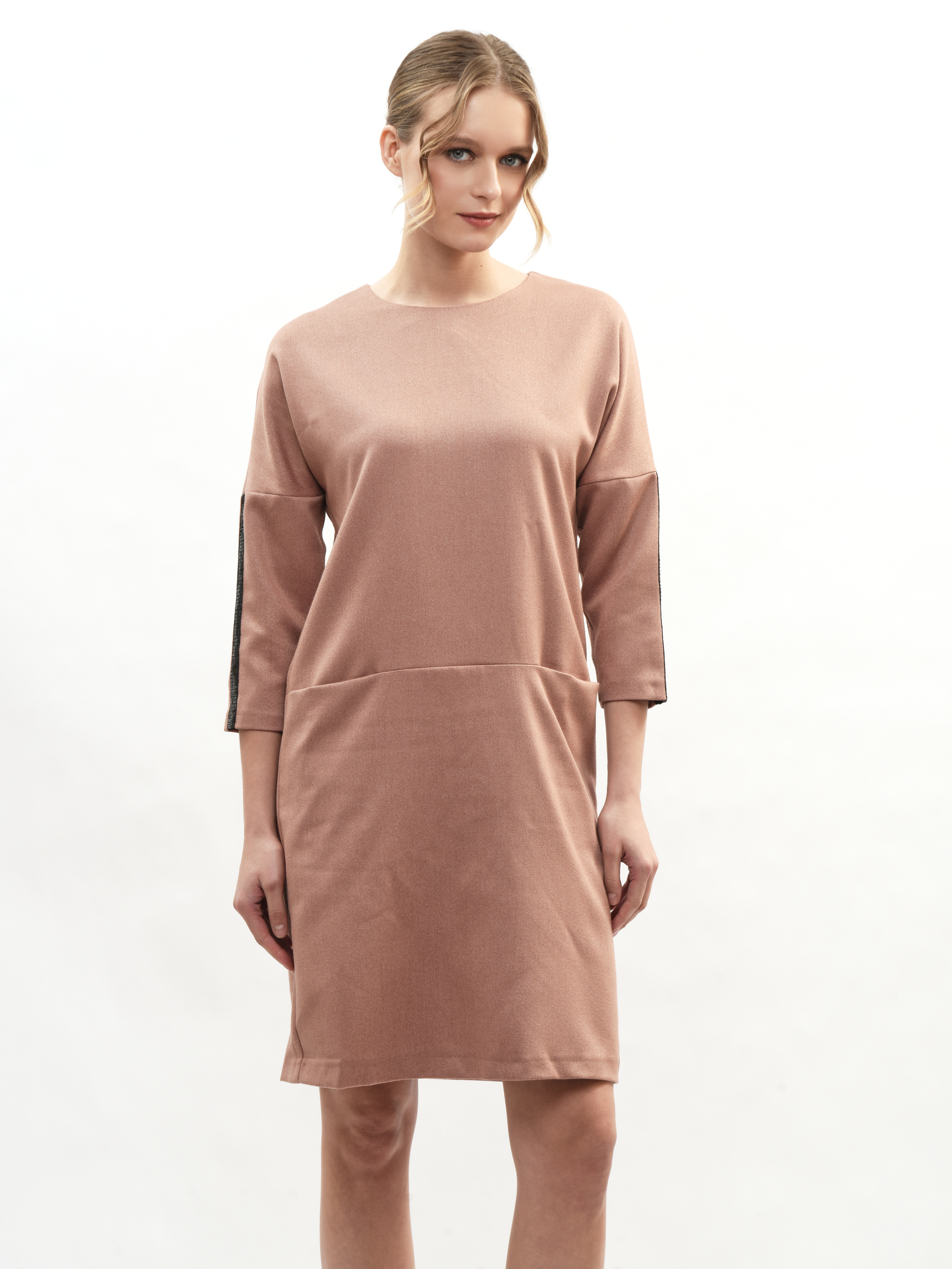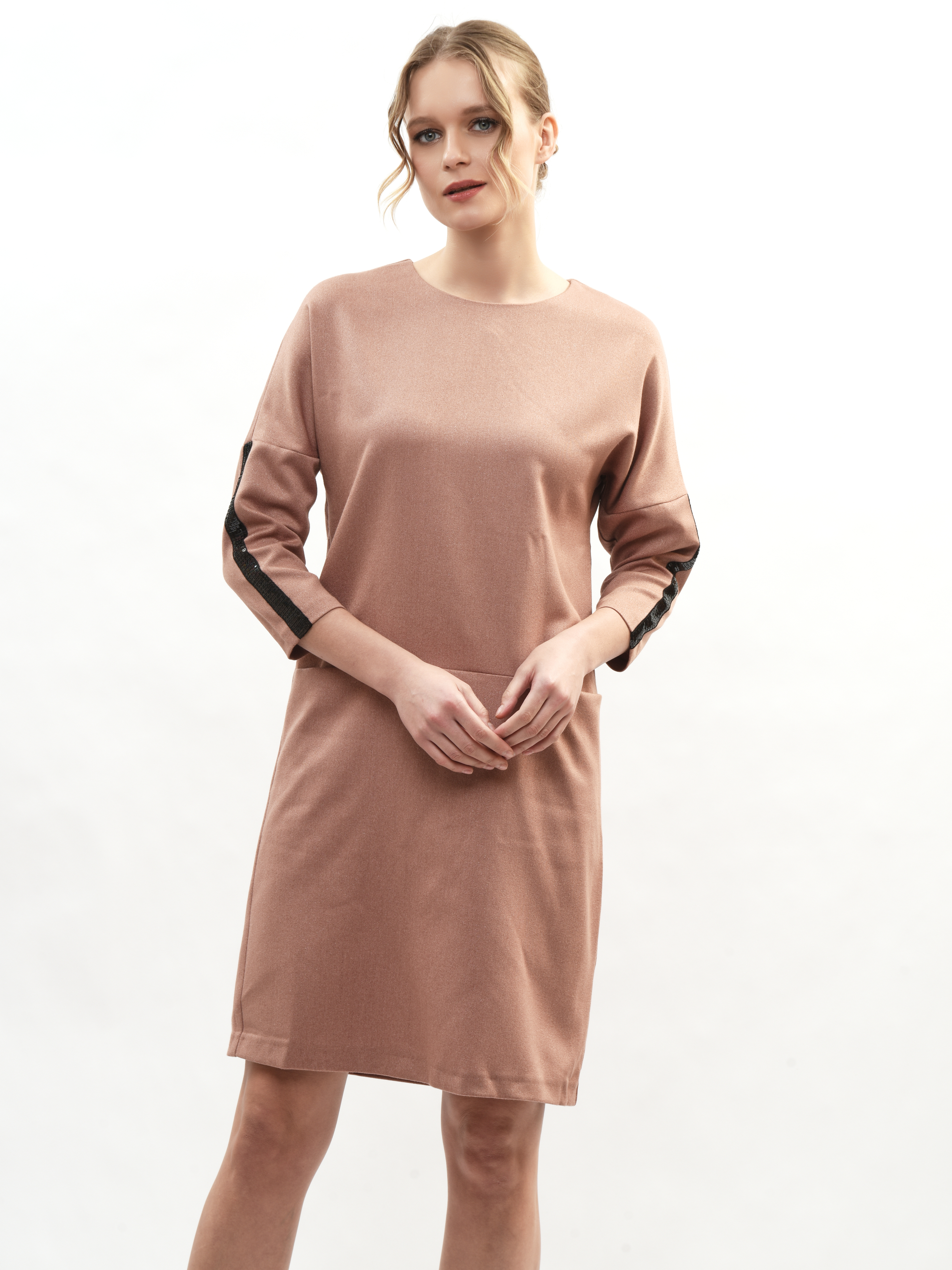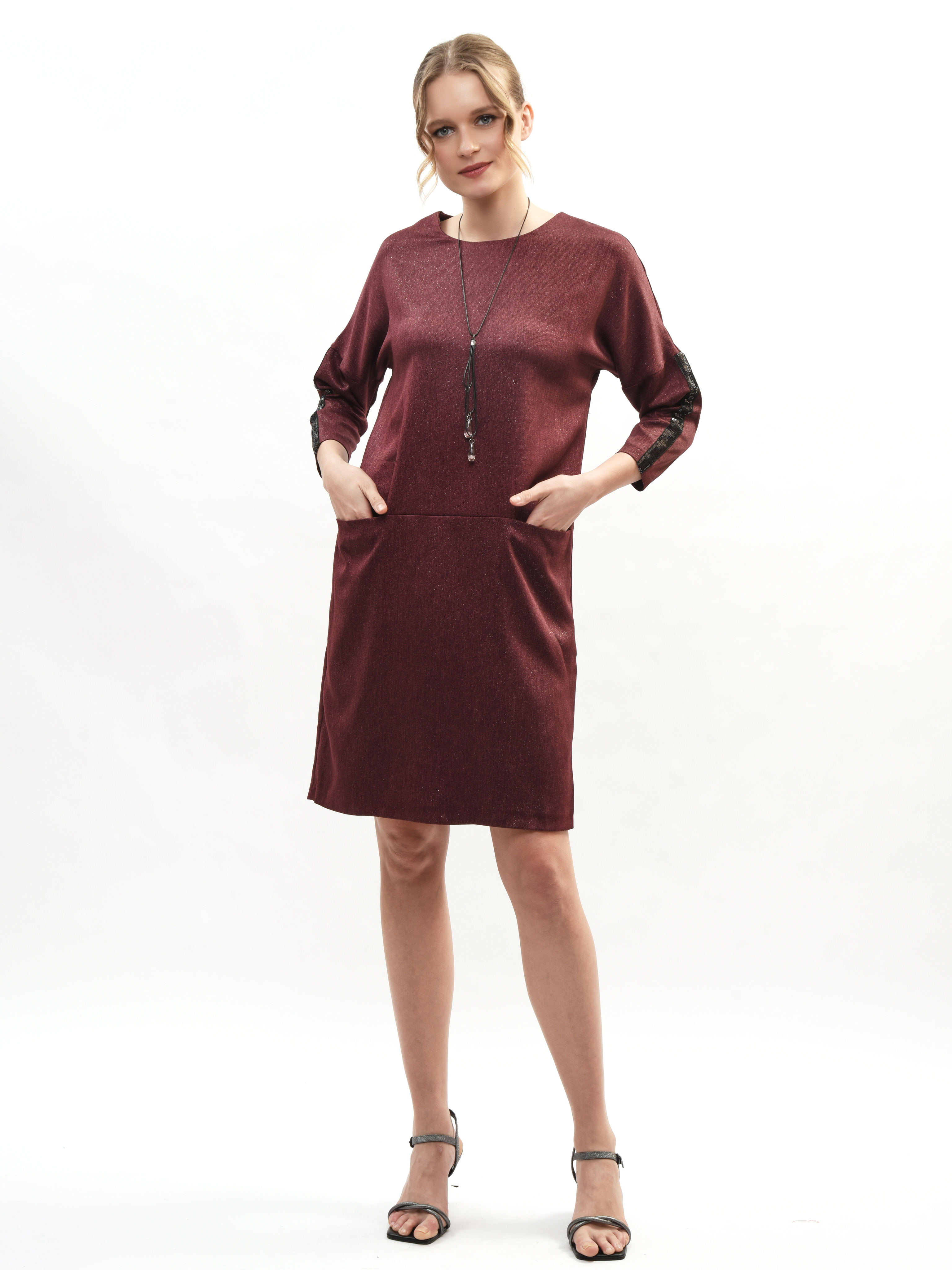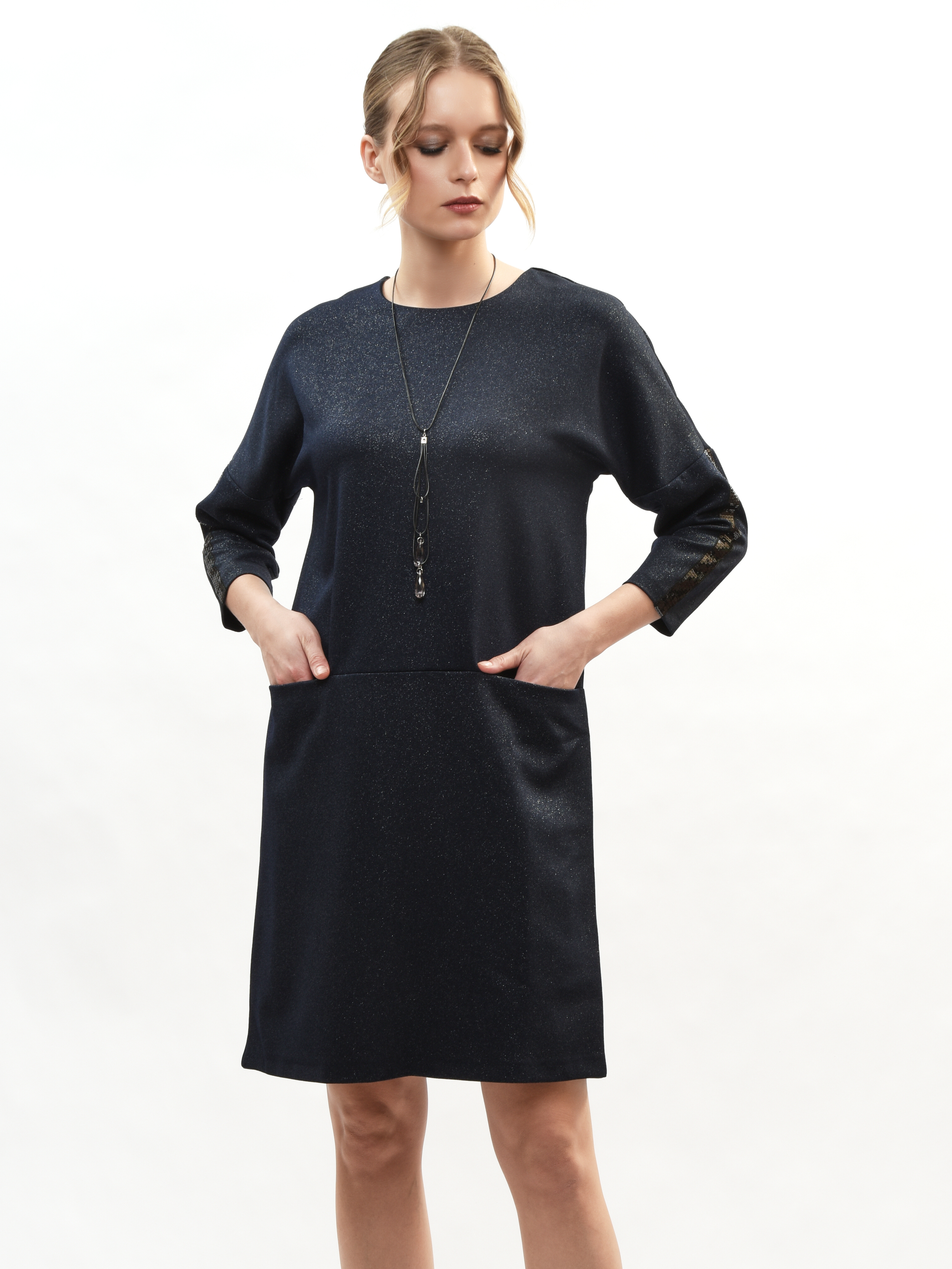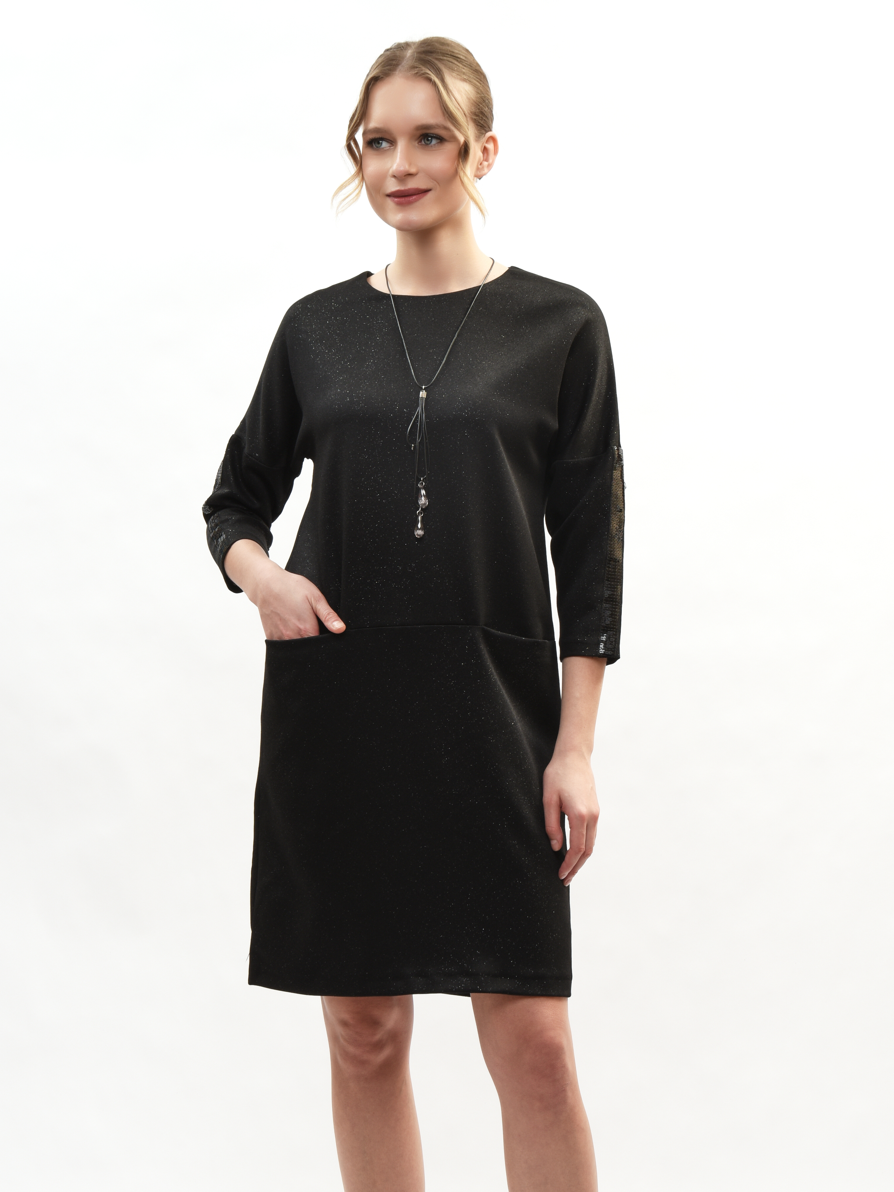 Платье прямого кроя – ваш идеальный спутник в создании элегантного образа! Круглая горловина подчеркивает красоту шеи, а рукава три четверти придают нотку романтики. Глубокие карманы удобны и практичны. Это платье станет вашим любимым выбором для повседневных прогулок и вечерних встреч. Элегантность, комфорт и стиль в каждой детали!