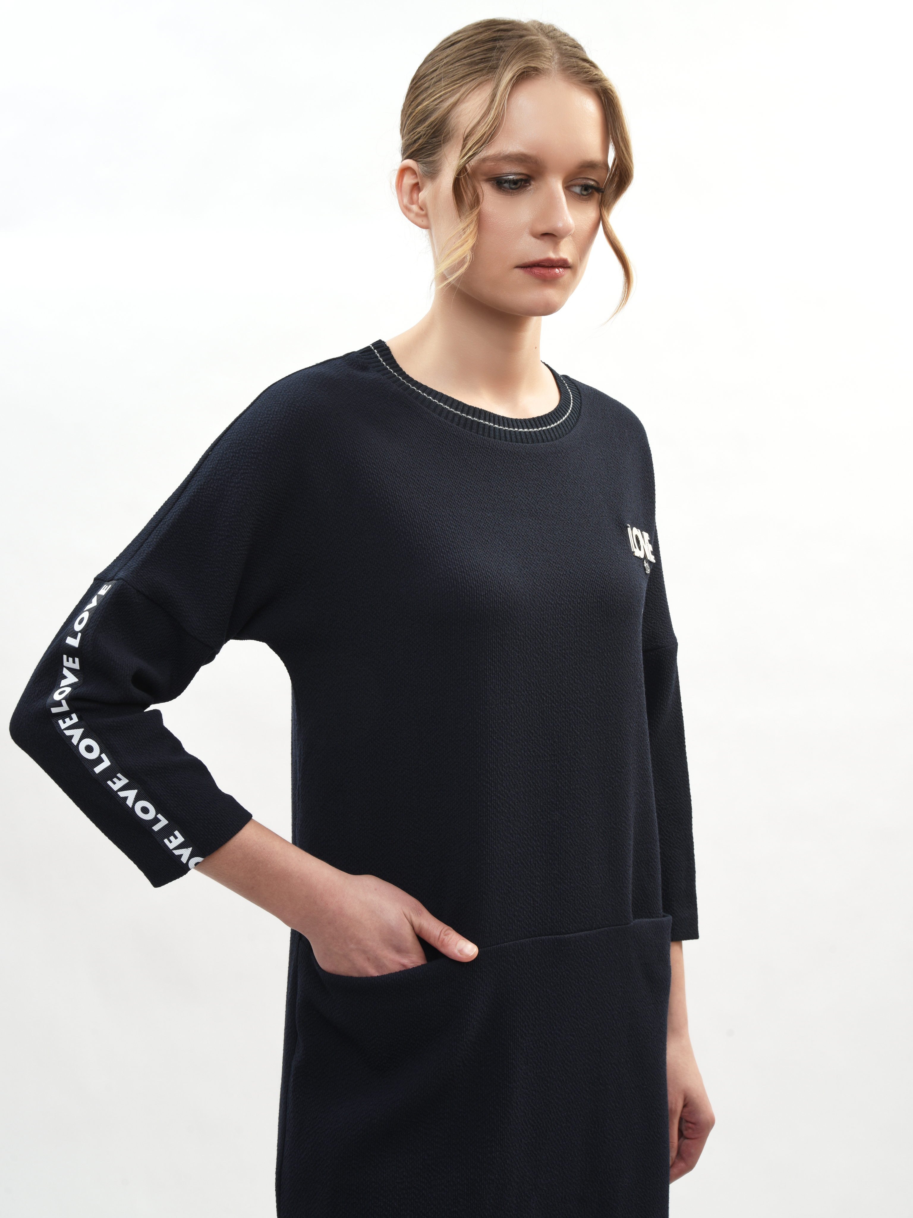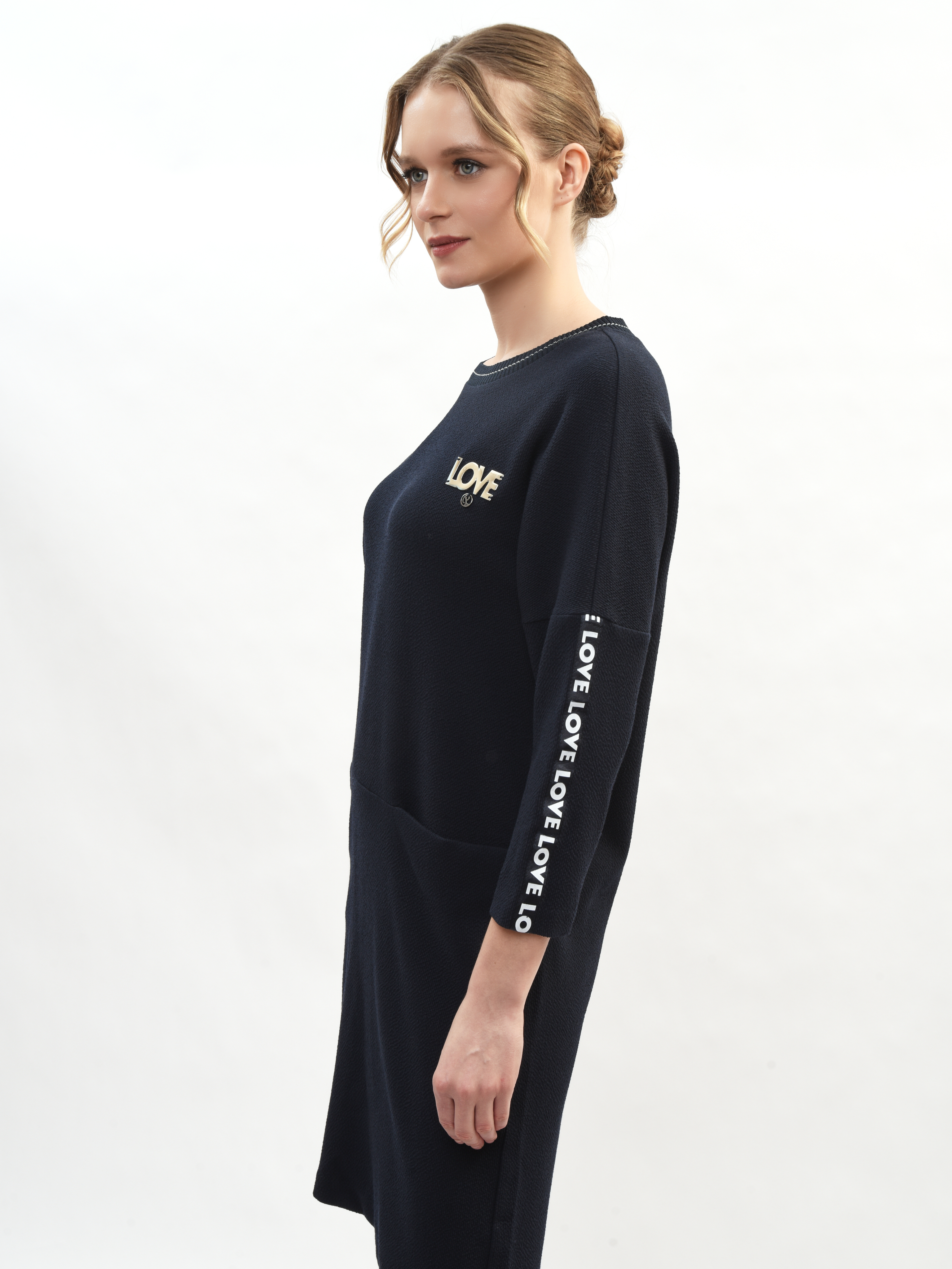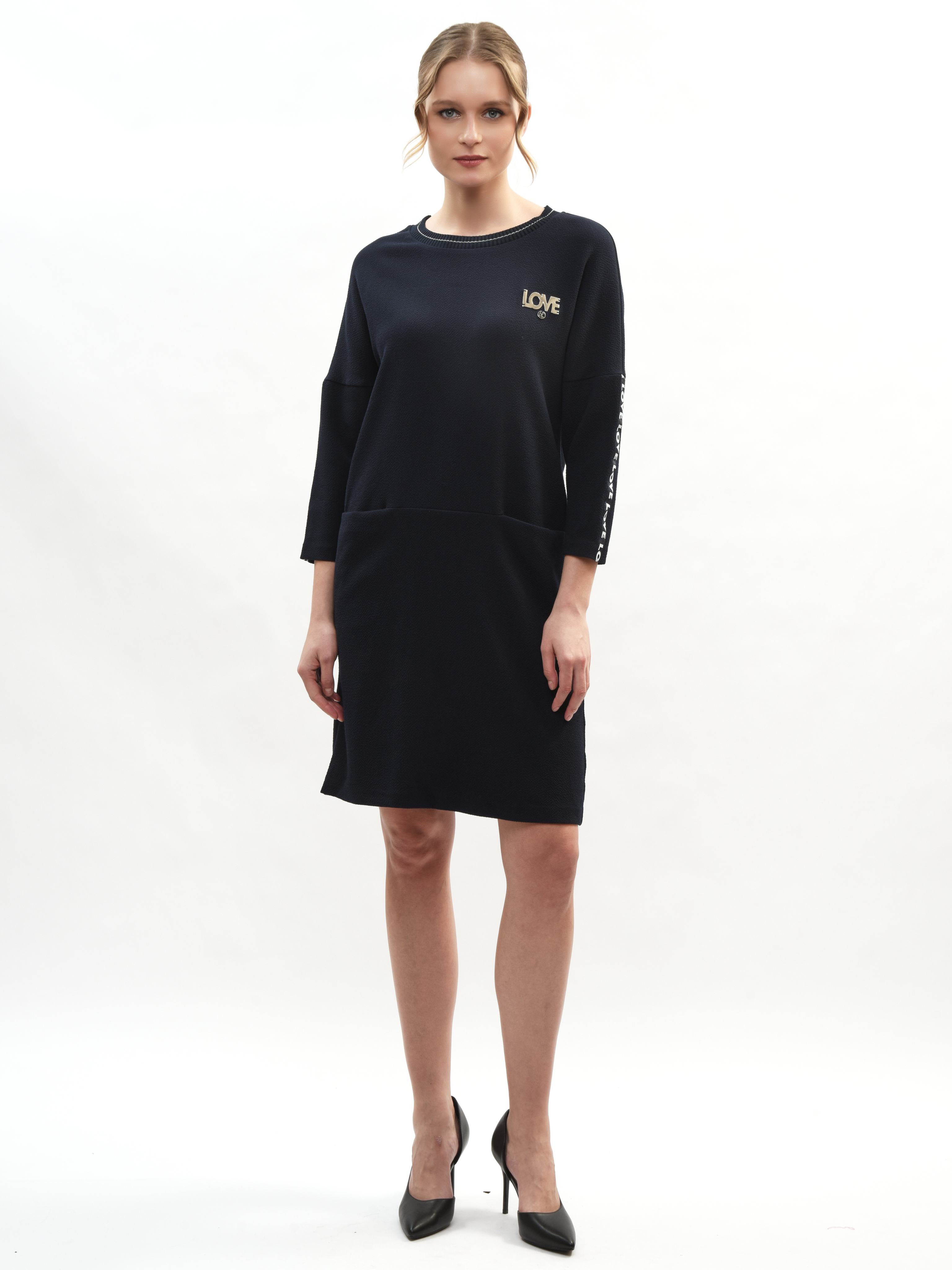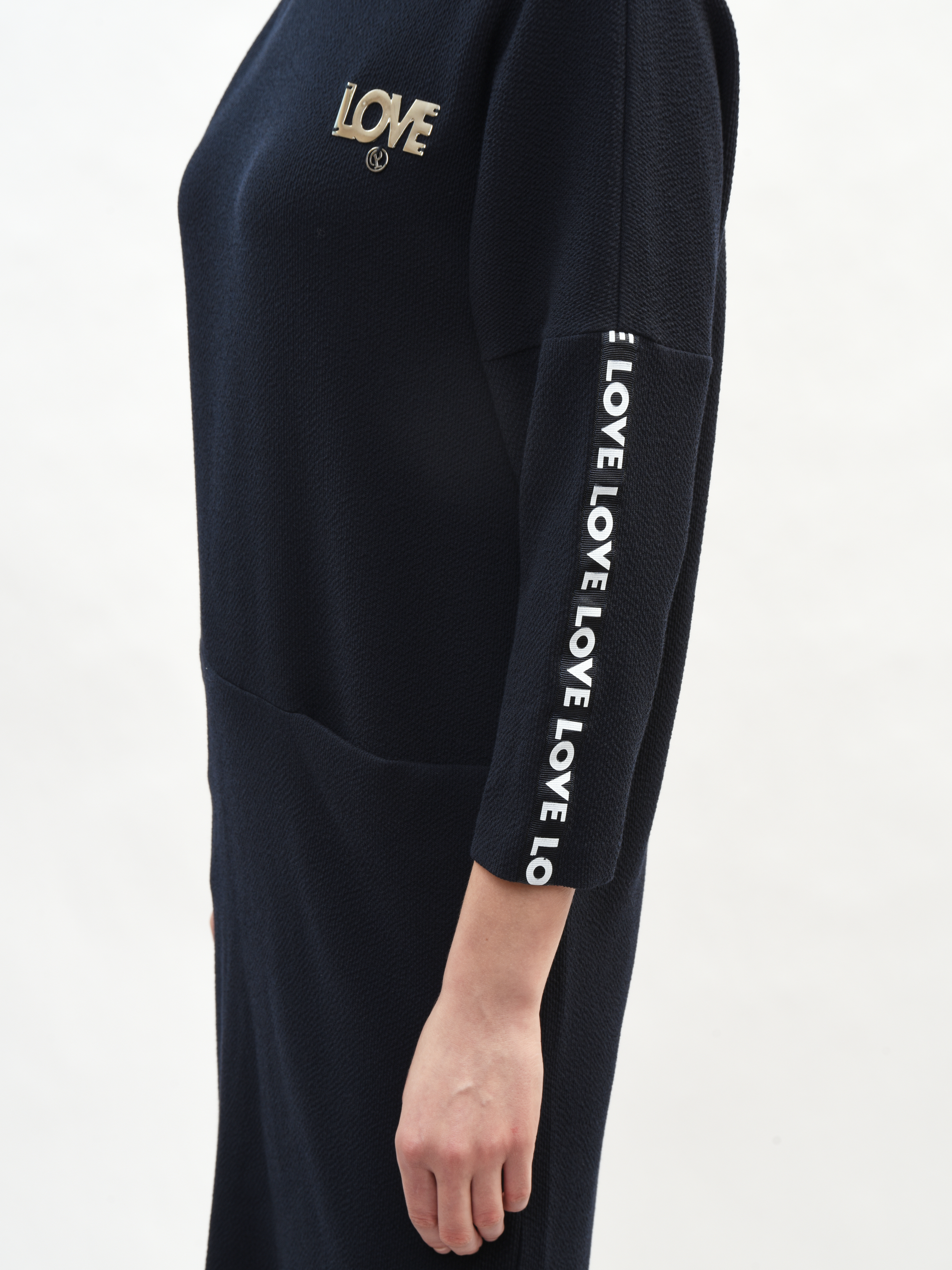 Платье прямого и удобного кроя из мягкой ткани подходит как для работы, прогулок по городу, визитов в магазины или на свидания. Свободный крой выгодно подчеркивает достоинства вашей фигуры и маскирует малейшие несовершенства – идеальная находка для вашего гардероба! Рукава дополнены лампасами с небольшой надписью «LOVE» в формате декоративного, акцентирующего элемента. Свобода движения в платье гарантирована и обеспечена.