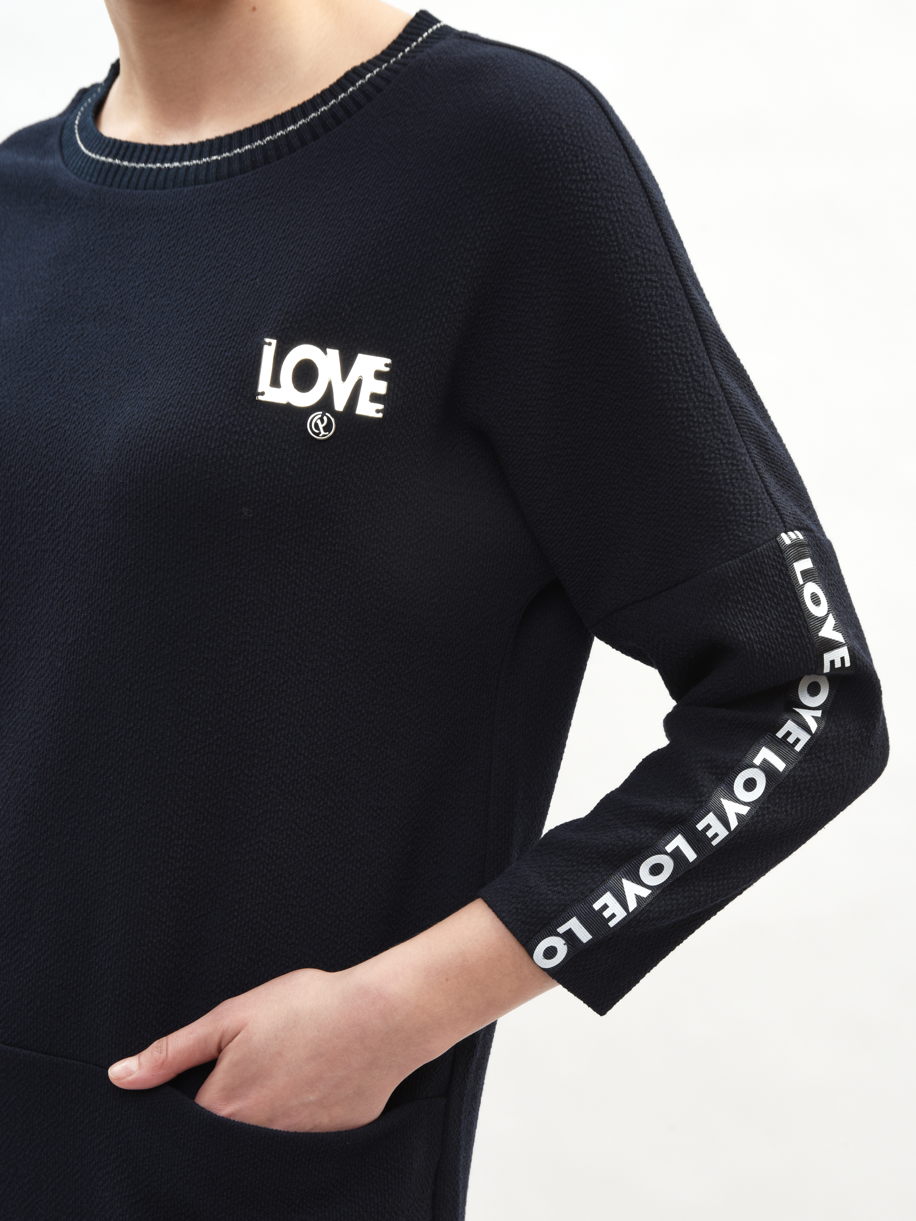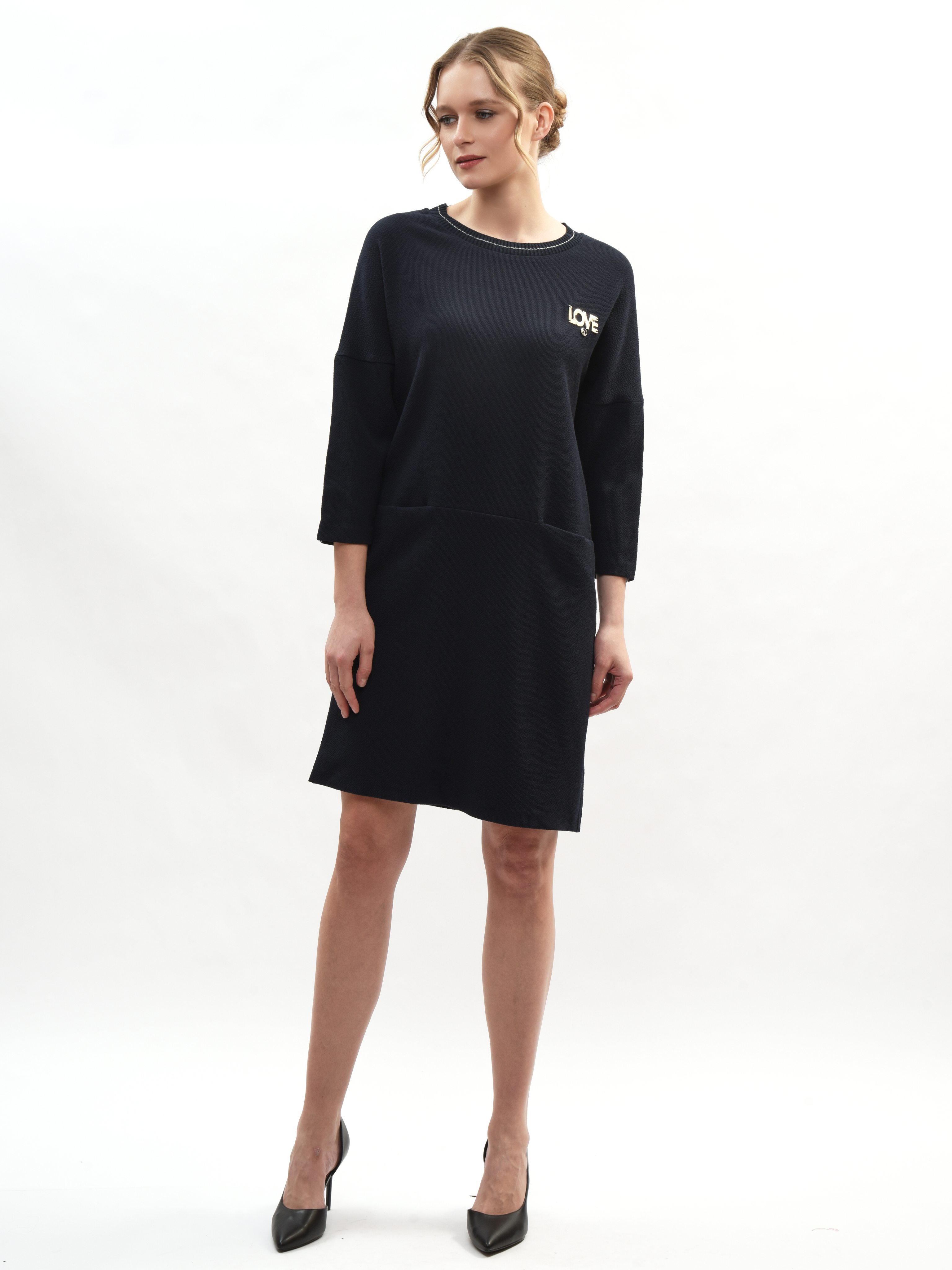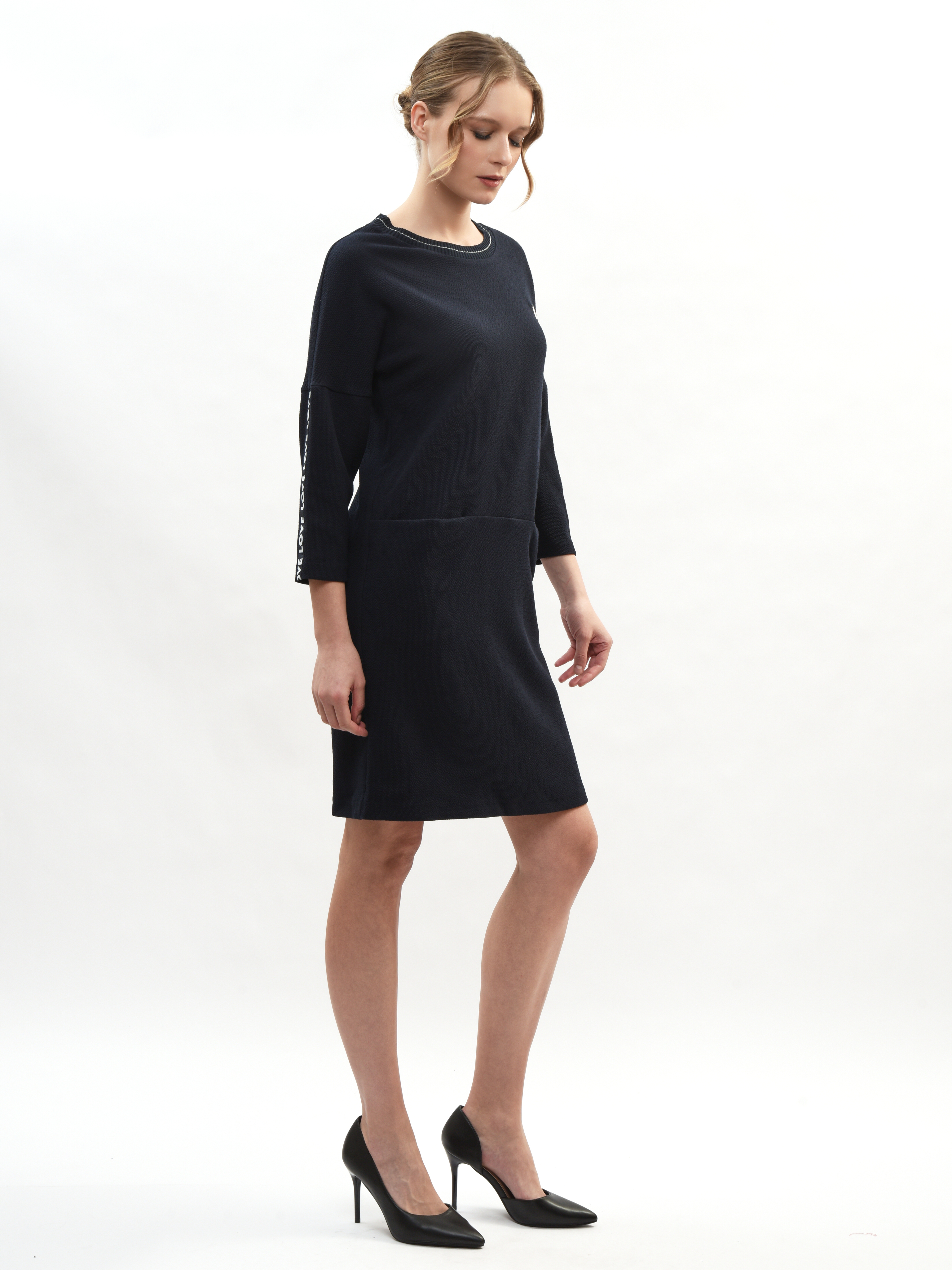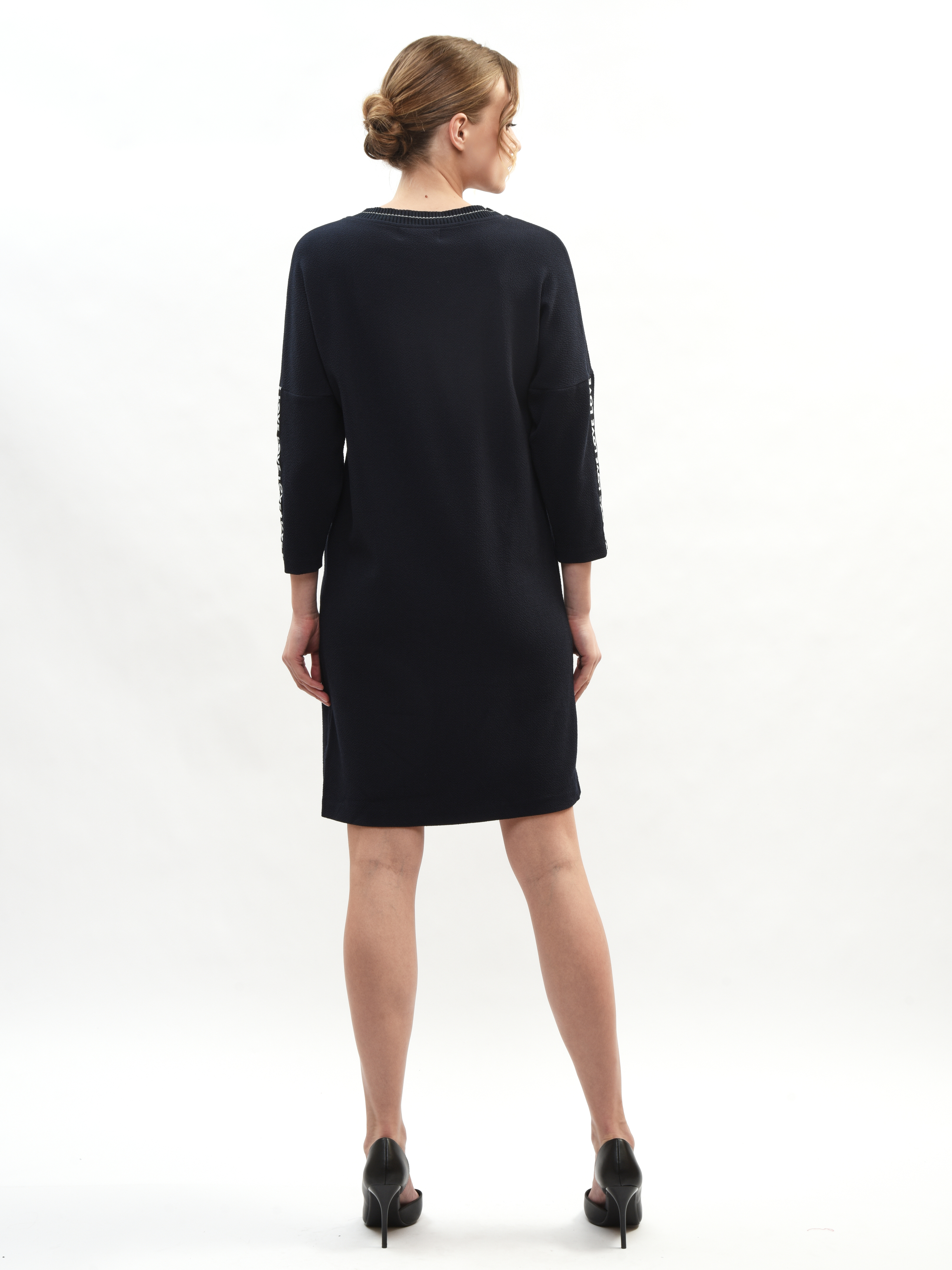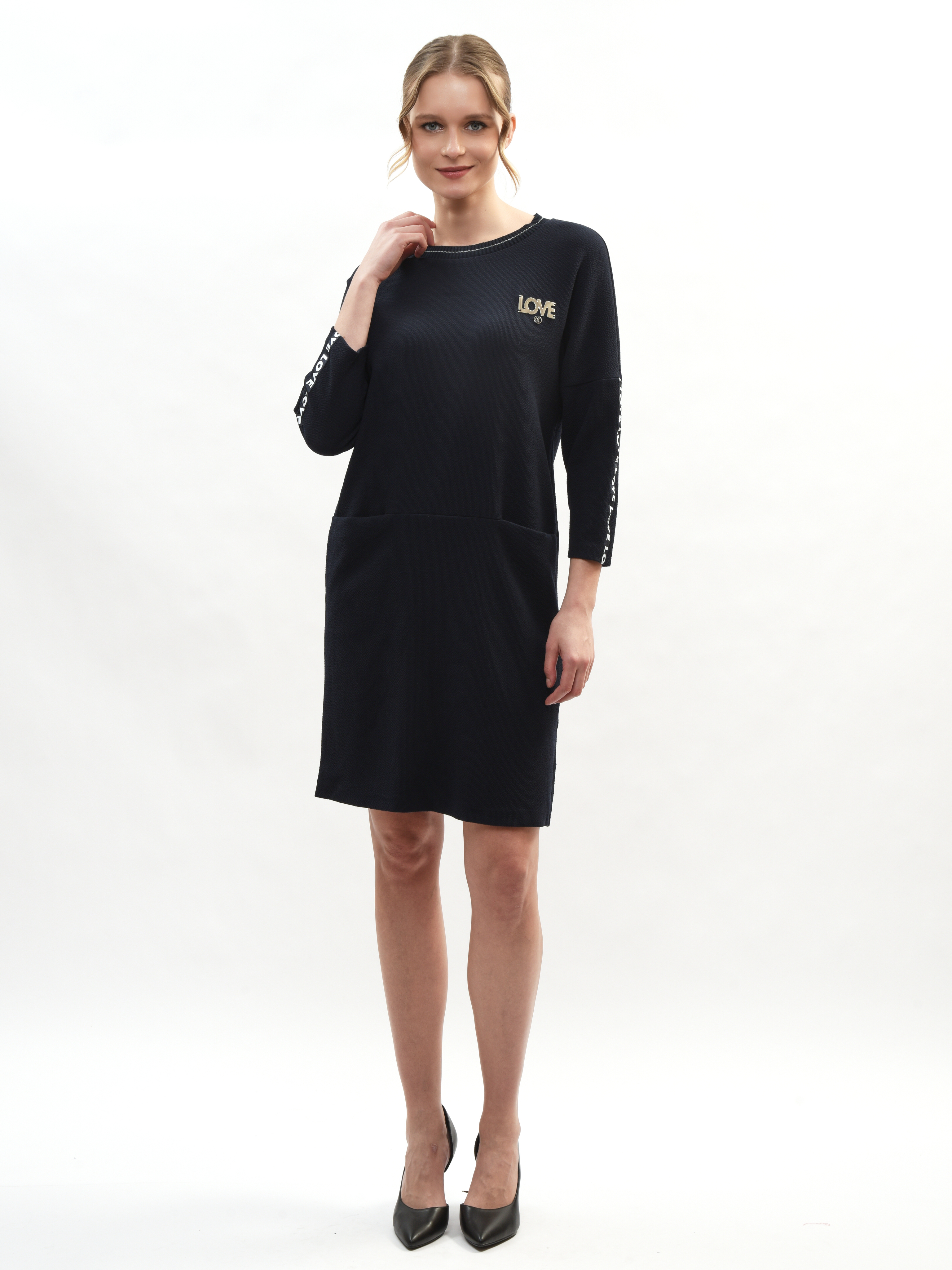 Платье прямого и удобного кроя из мягкой ткани подходит как для работы, прогулок по городу, визитов в магазины или на свидания. Свободный крой выгодно подчеркивает достоинства вашей фигуры и маскирует малейшие несовершенства – идеальная находка для вашего гардероба! Рукава дополнены лампасами с небольшой надписью «LOVE» в формате декоративного, акцентирующего элемента. Свобода движения в платье гарантирована и обеспечена.