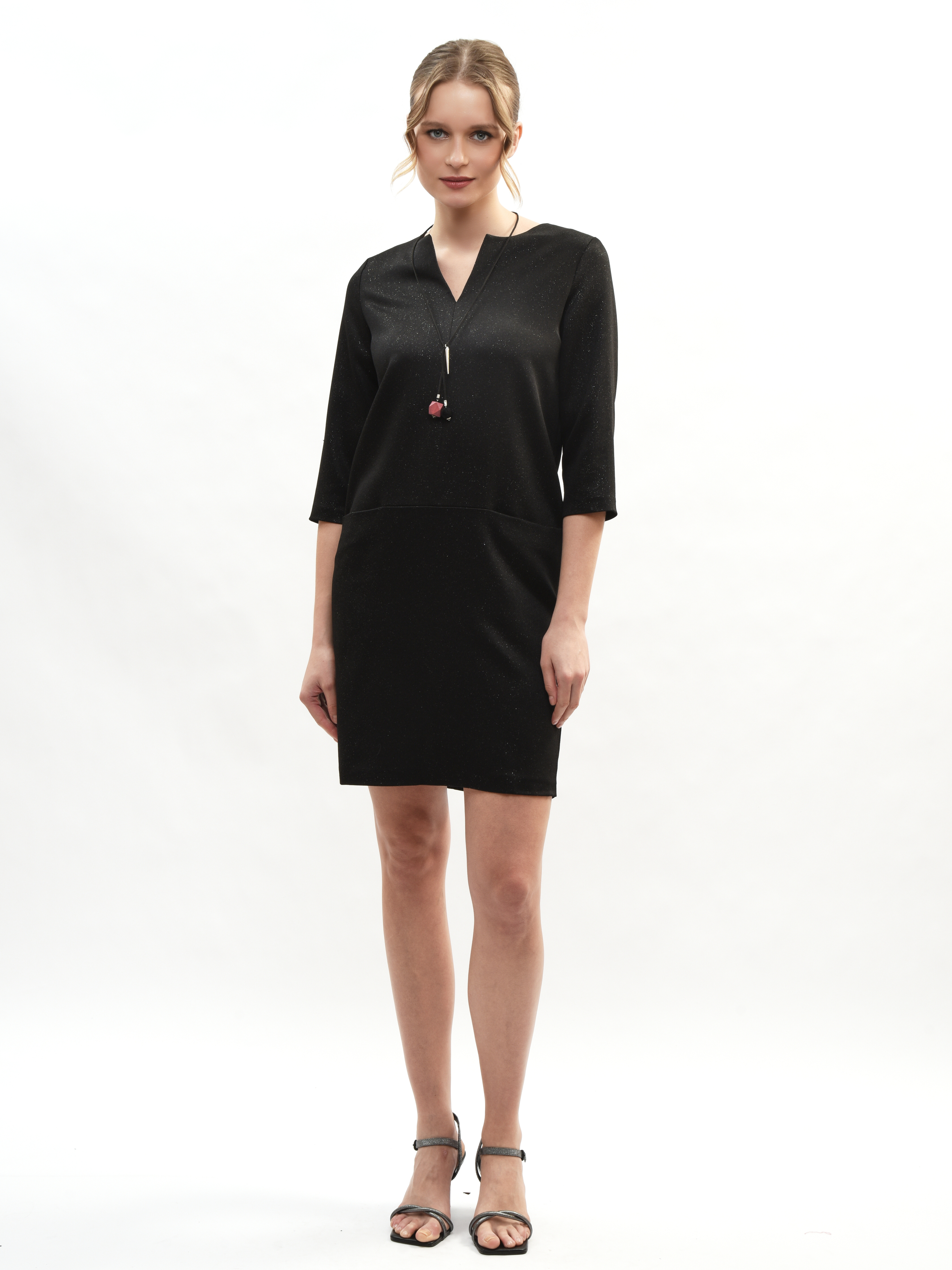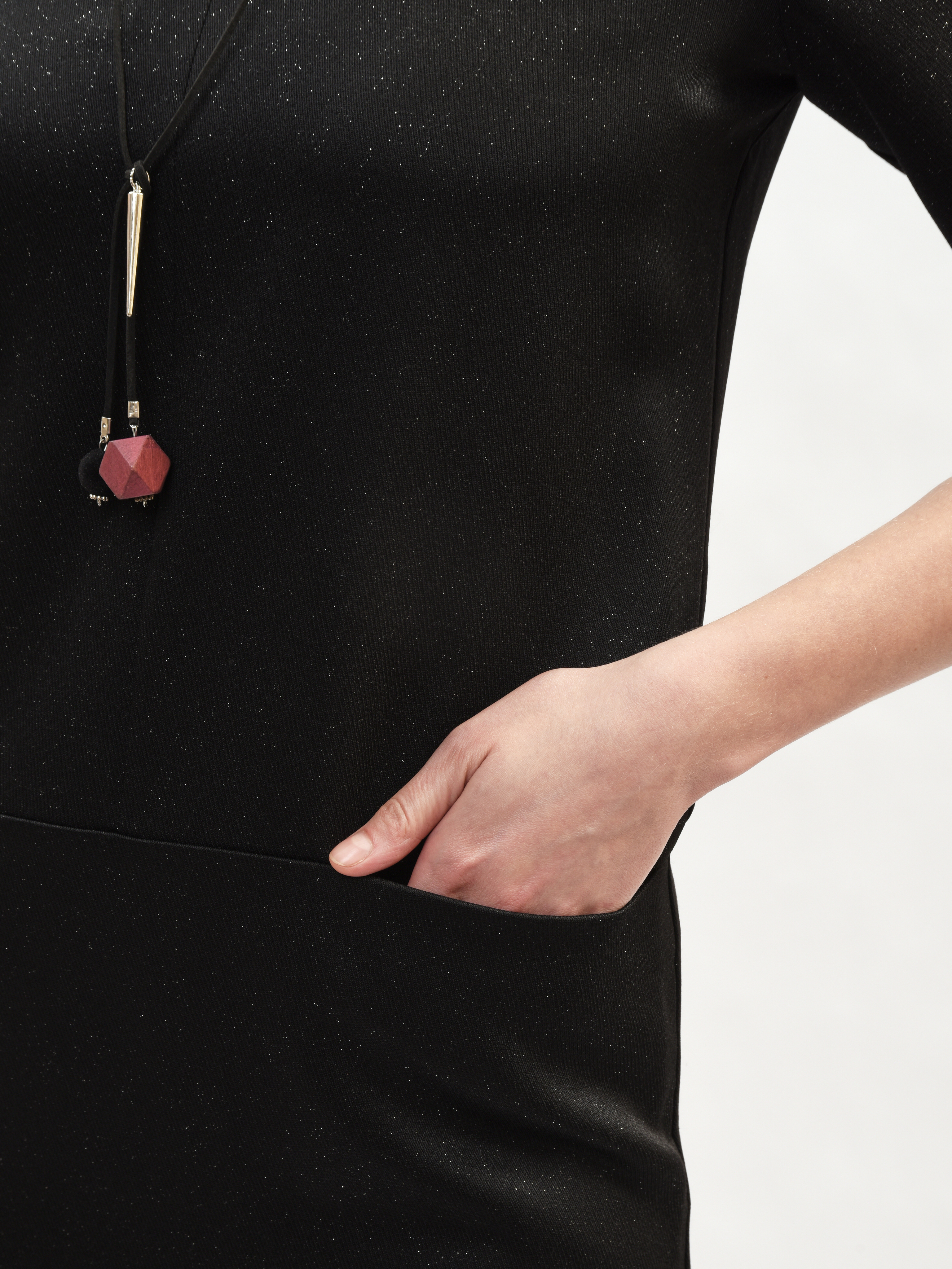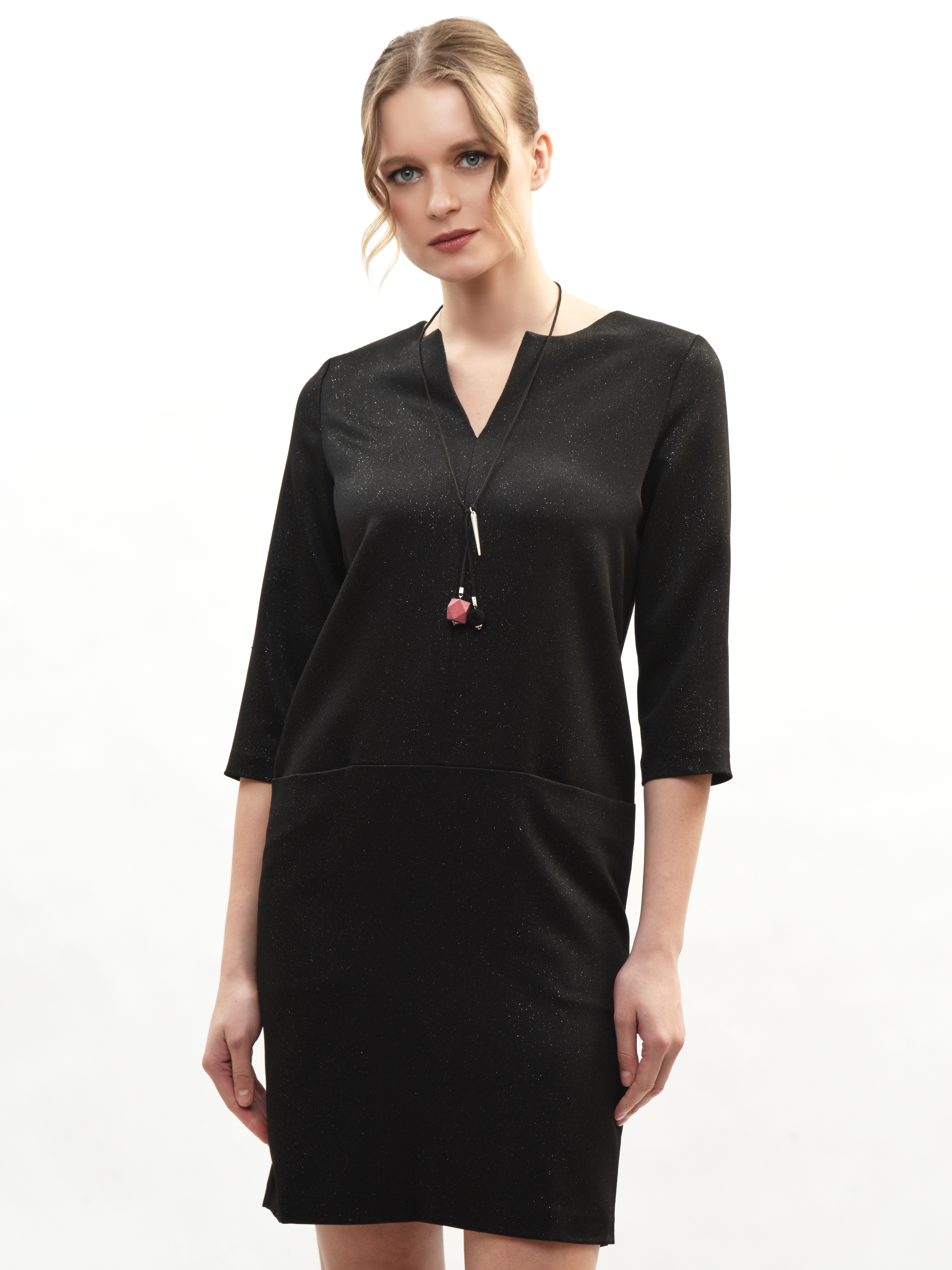 Маленькое черное платье – ваш идеальный спутник в мире моды! Прямой крой подчеркивает фигуру, а необычный вырез горловины добавляет элегантности. Карманы обеспечивают удобство, а рукава три четверти создают стильный акцент. Струящийся блестящий материал придает образу нотку роскоши и привлекает восхищенные взгляды. Отличное сочетание комфорта и привлекательности!