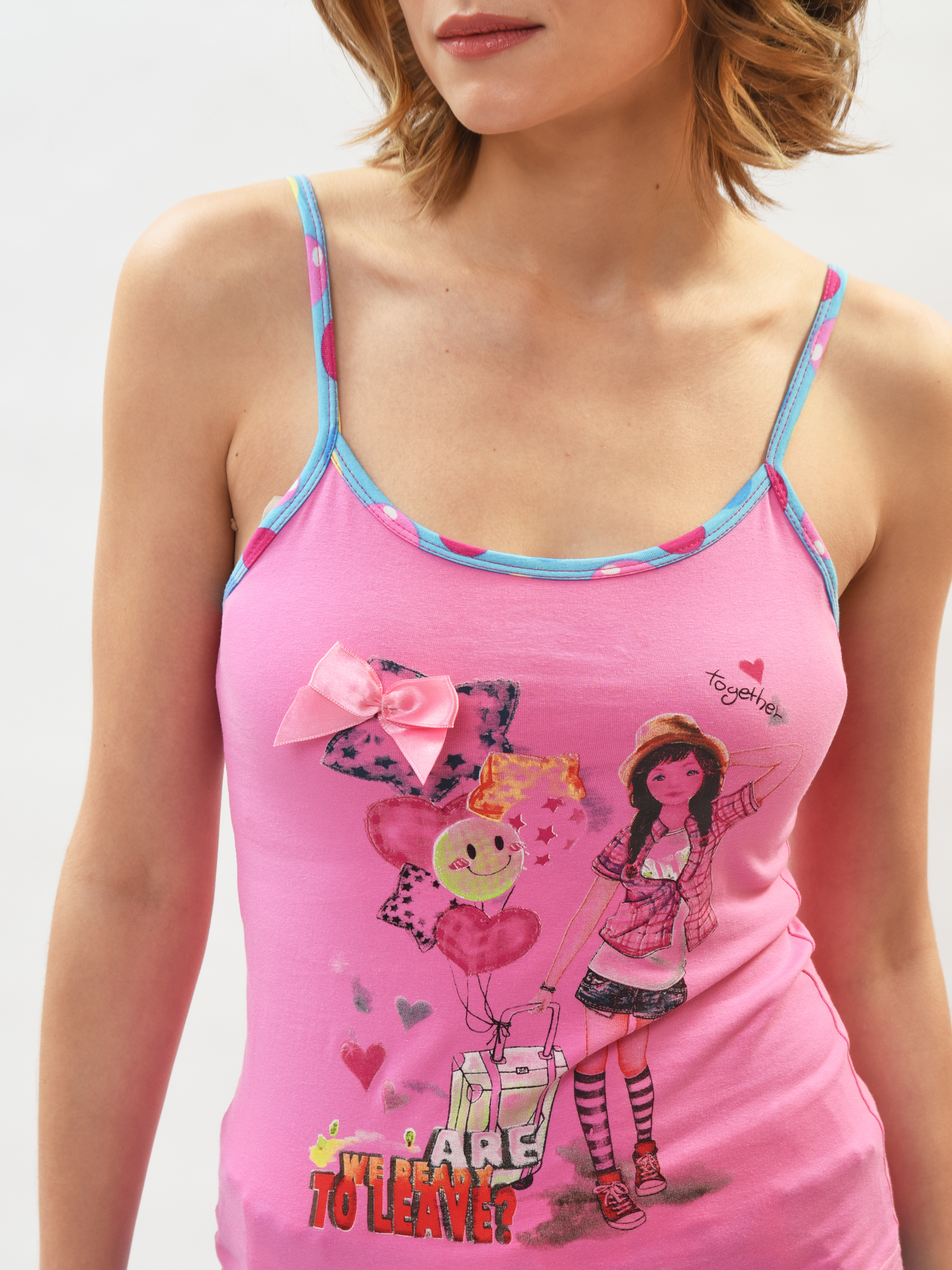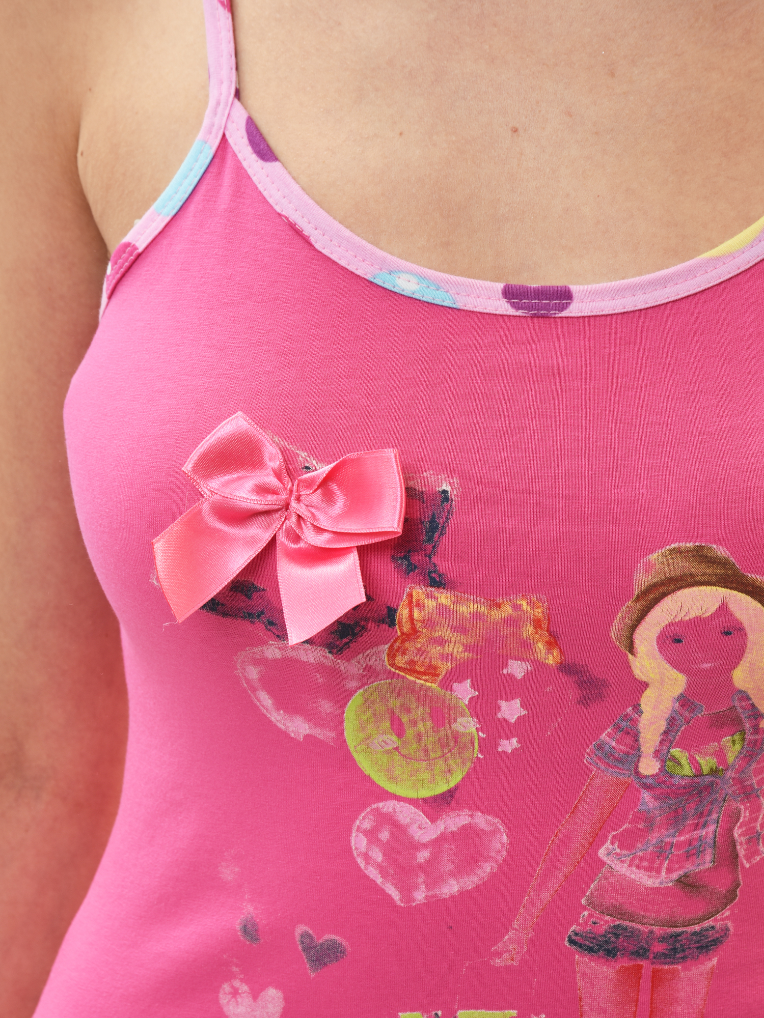 Нежная женская пижама, созданная для сладких снов! Стильный комплект облегающего силуэта включает короткие шорты с ярким принтом из разноцветных шариков и удобный топ с милым бантиком и аппликацией девочки – настоящая находка для любительниц комфорта и стиля! Идеально подчеркивает фигуру, дарит уют и комфорт. Прекрасно подходит как для дома, так и оригинального подарка близкой подруге.