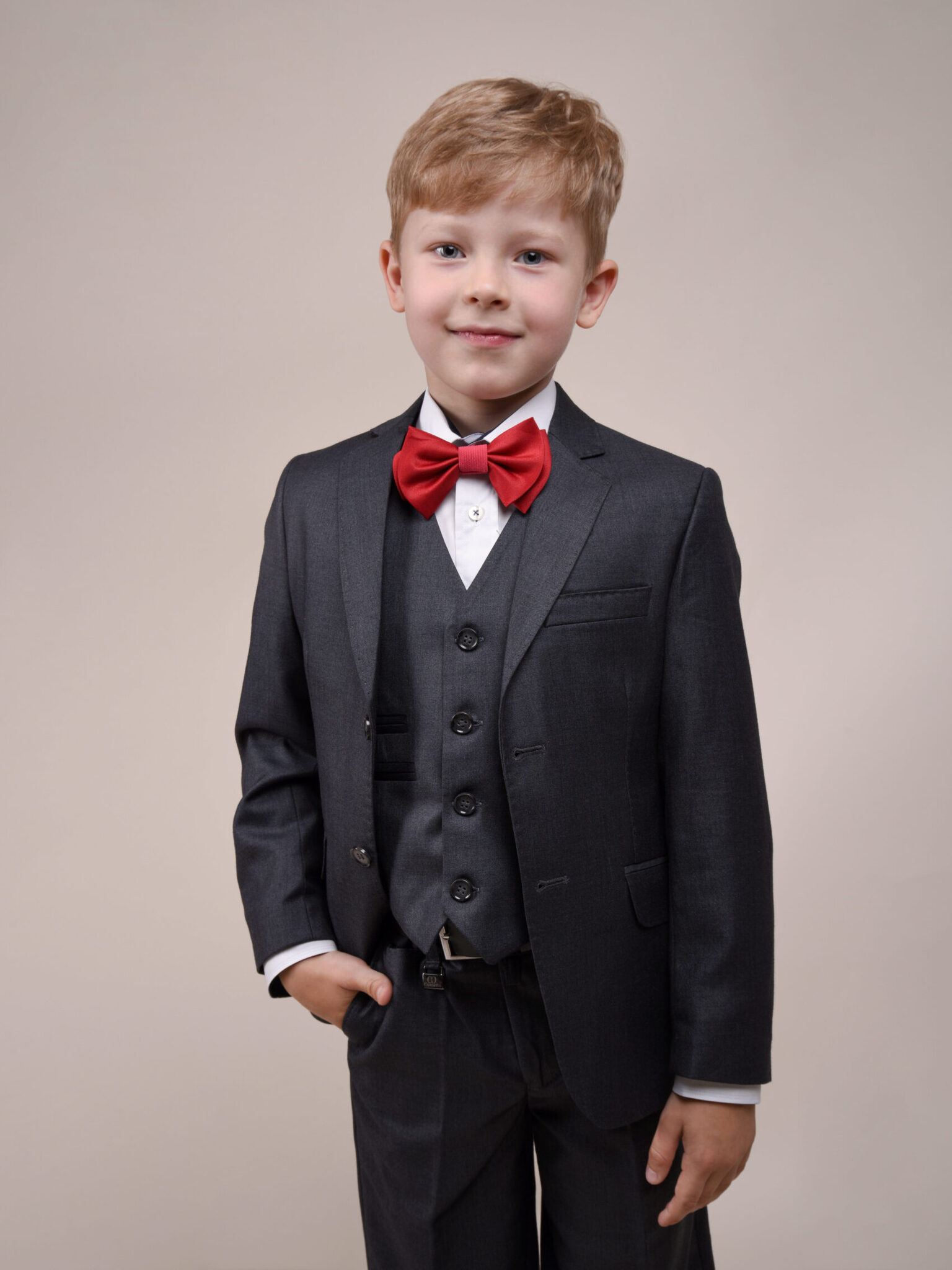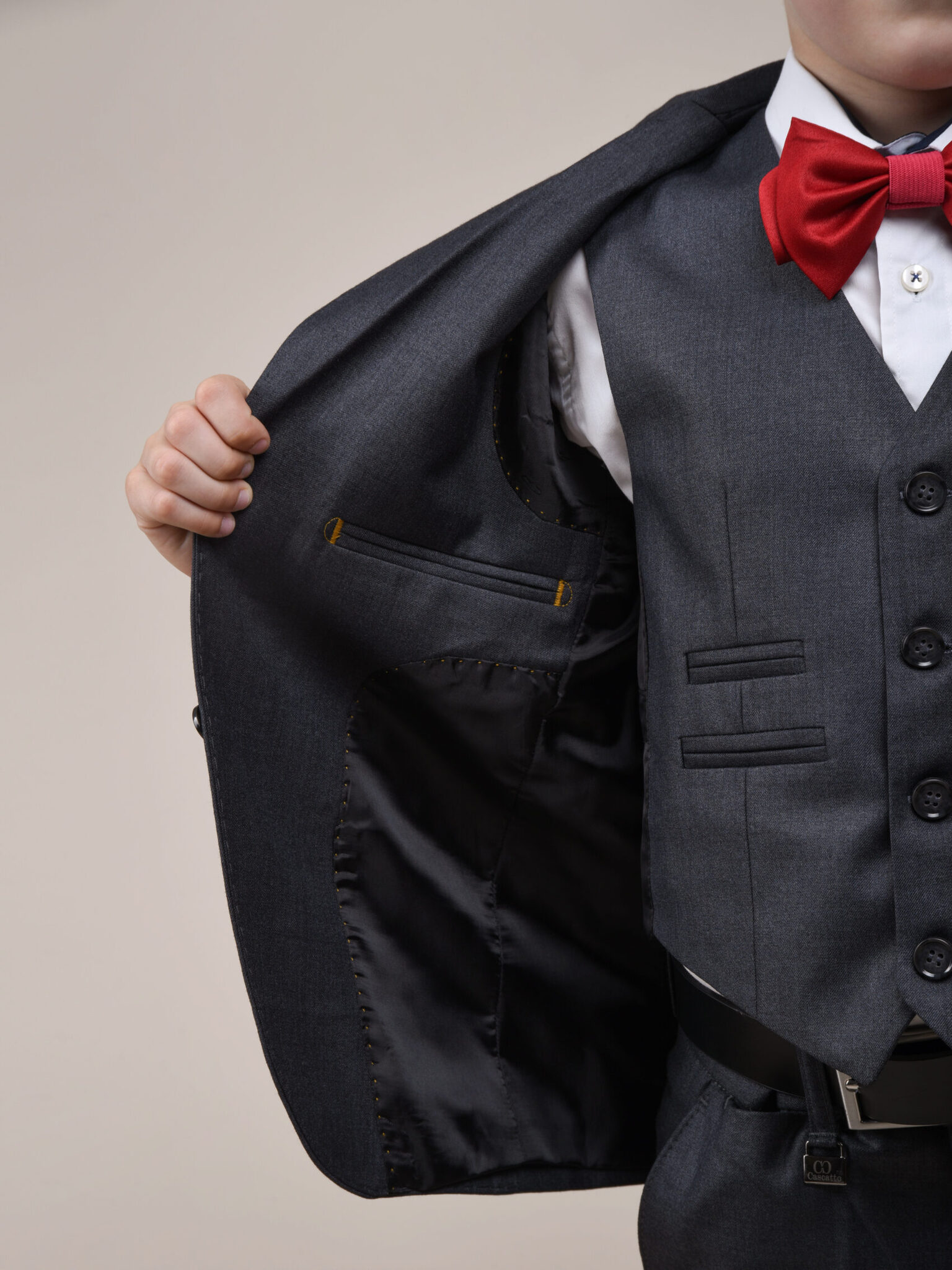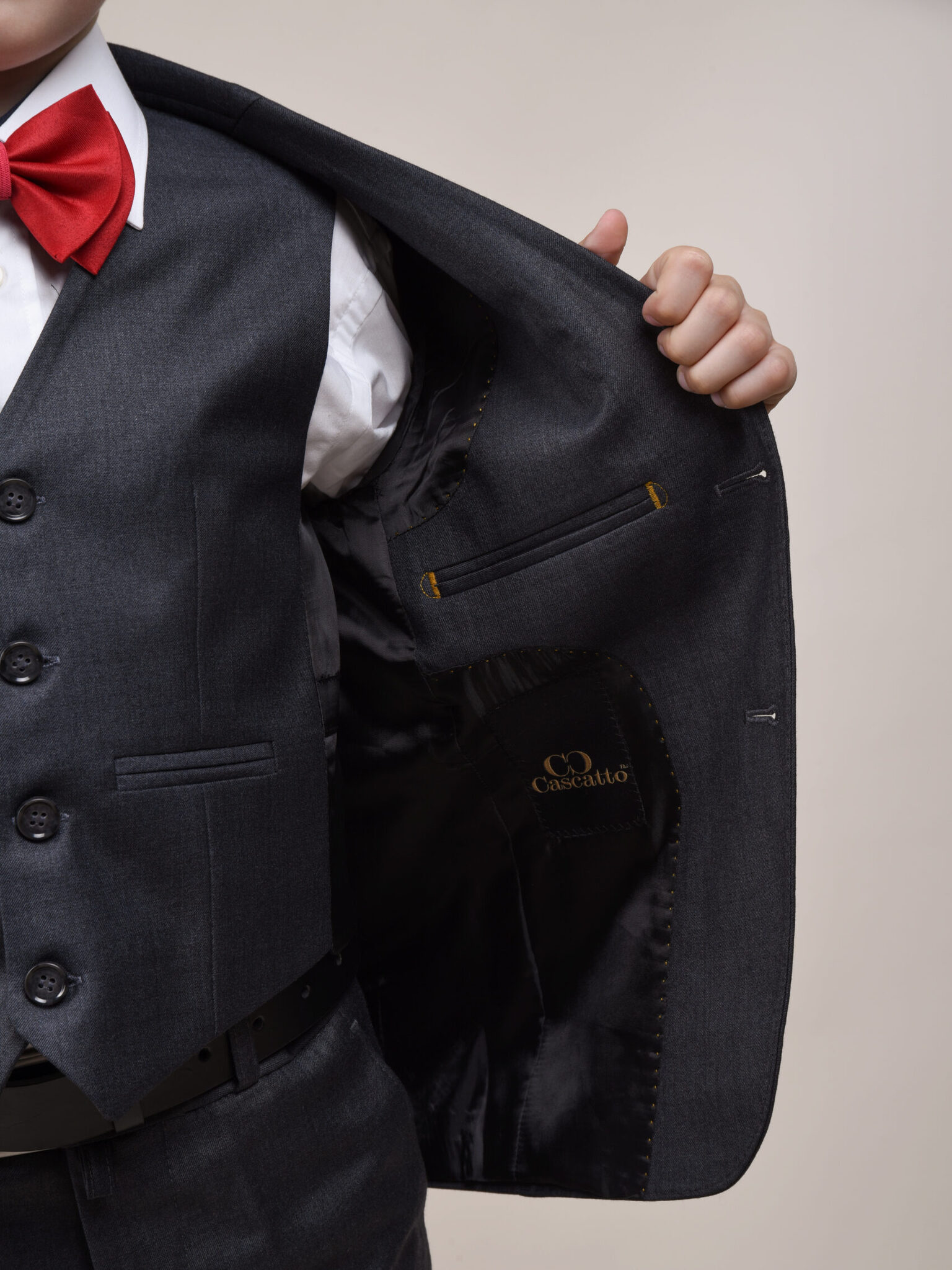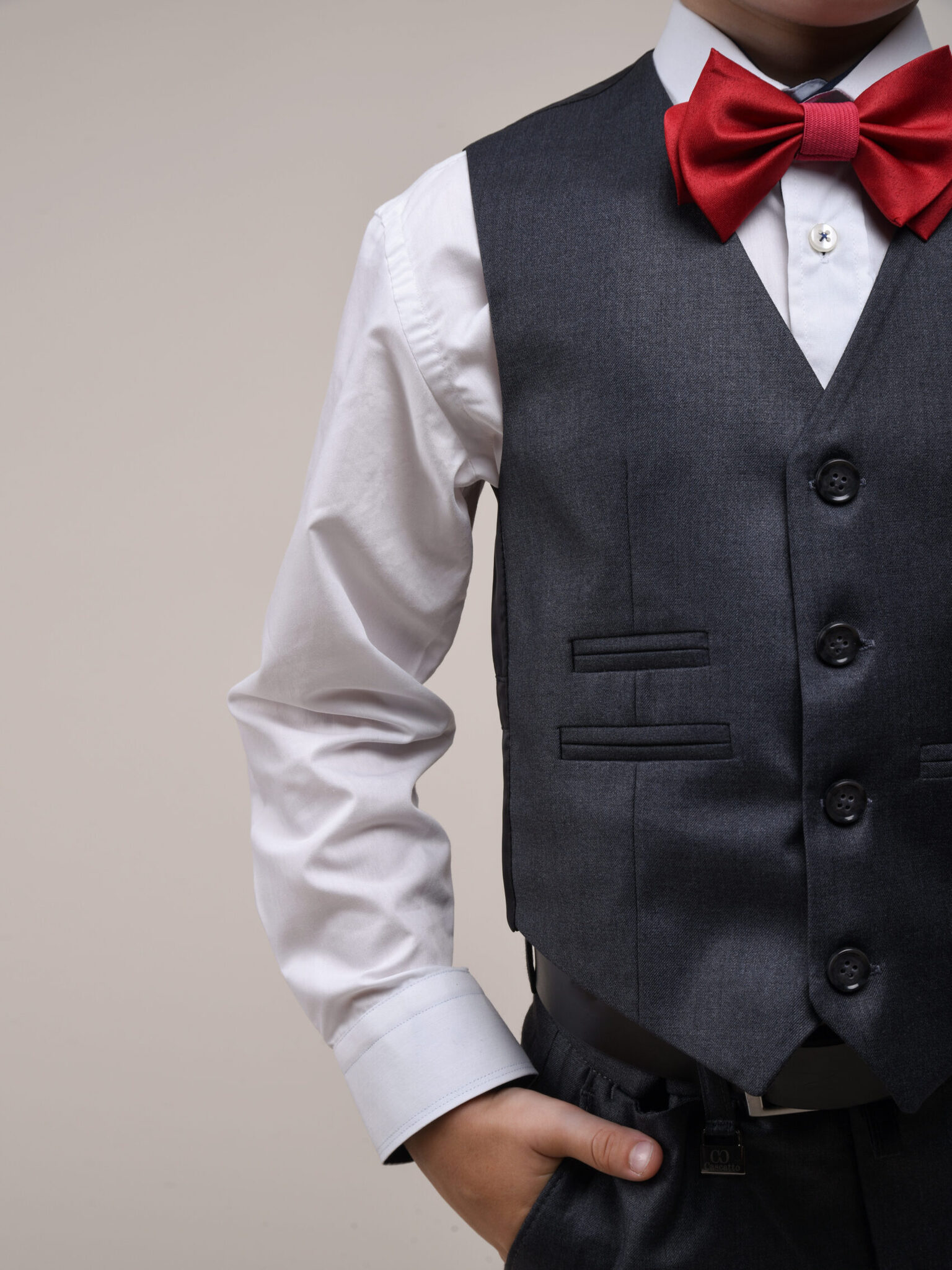 Костюм для мальчика от бренда Cascatto – это сочетание стиля и комфорта. Изготовлен из качественной шерстяной ткани, этот комплект включает в себя однобортный пиджак прямого кроя, жилет и классические брюки.