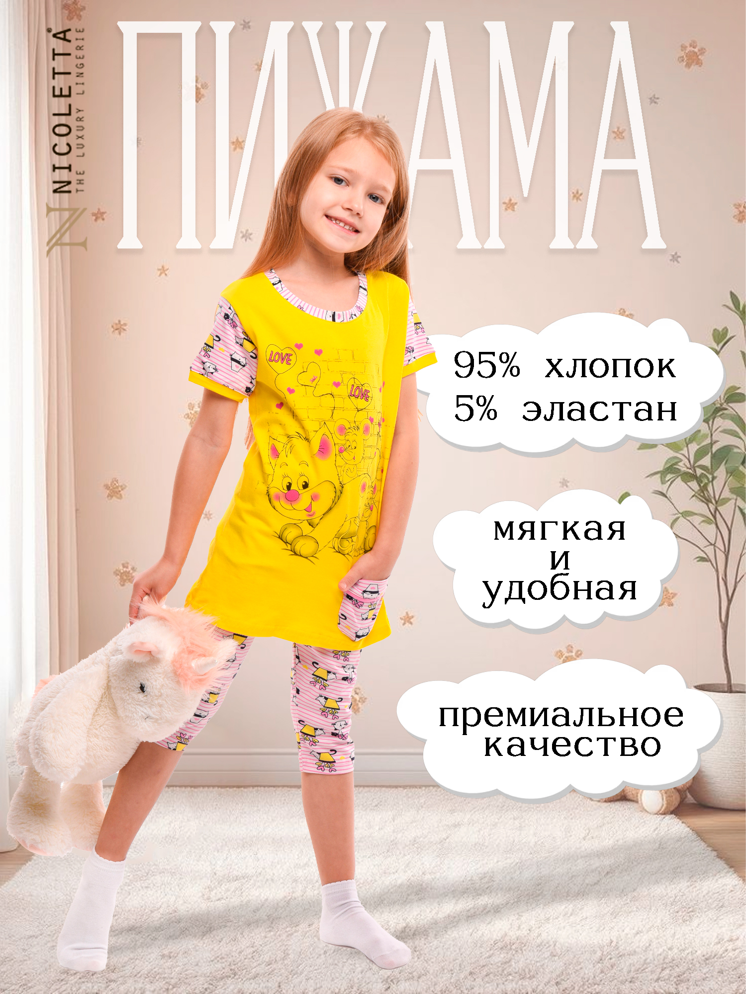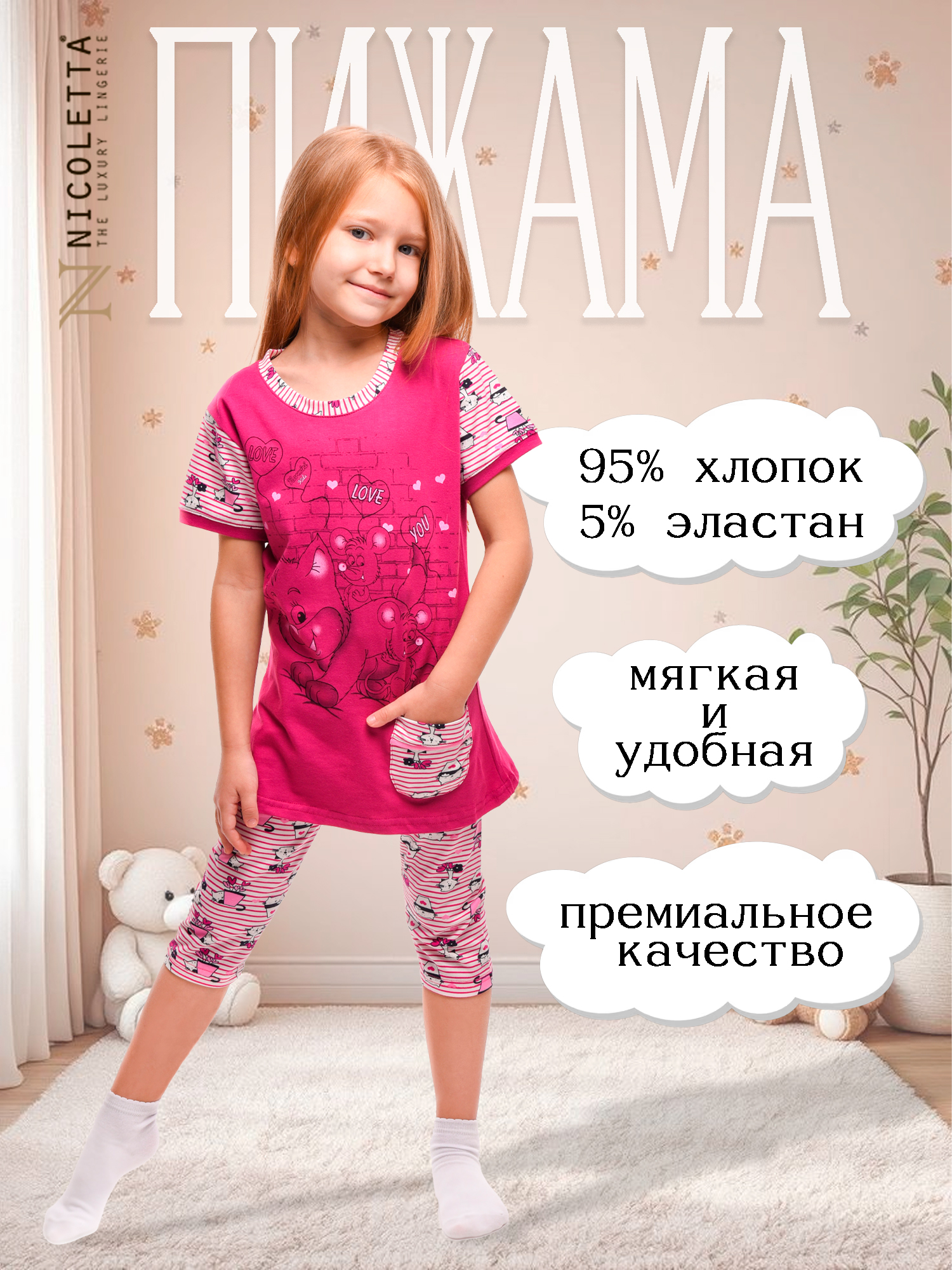 Пижама для маленькой принцессы! Девочки обожают её за комфорт и свободу движений. А мамы ценят качество материалов: 95% нежного хлопка и всего 5% эластана обеспечивают мягкость, воздухопроницаемость и долговечность изделия. В комплект входят удобная футболка и элегантные облегающие капри – идеальный дуэт для сладких снов и уютных домашних вечеров.