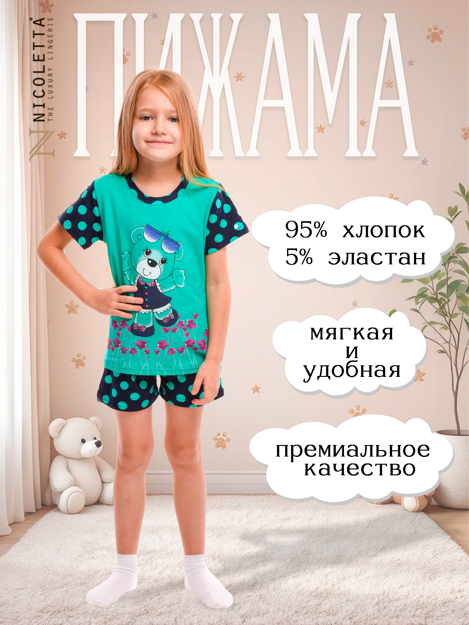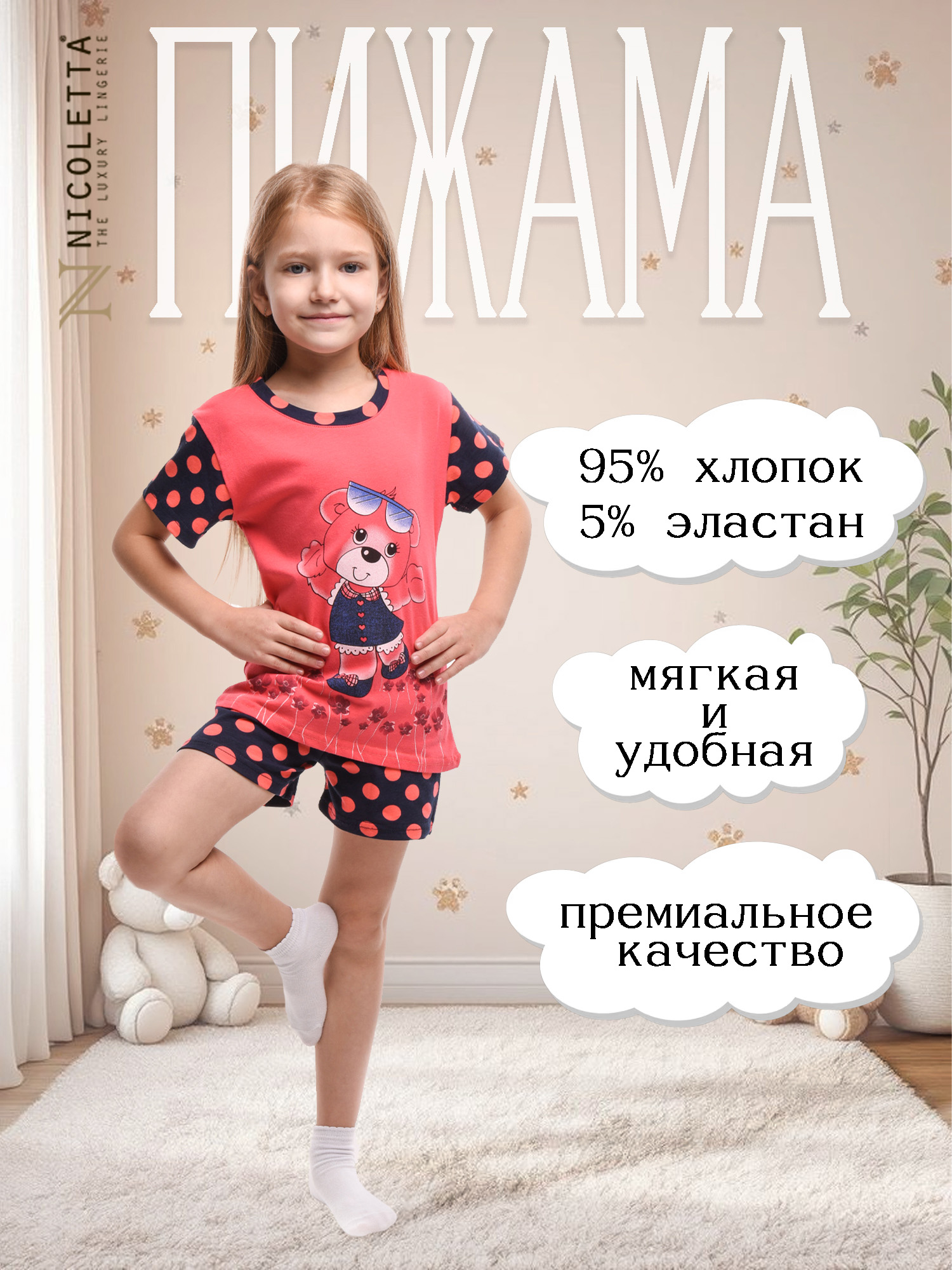 Домашний комплект, от которого точно будет весело любому ребенку! Уютная удлинённая футболка с веселым медведем сочетается со стильными шортиками в темном горохе. Пижама изготовлена из тонкого хлопкового трикотажа, который держит форму после стирки при 30°C. Ощущай комфорт весь день: играй, отдыхай и наслаждайся уютом без ограничений!