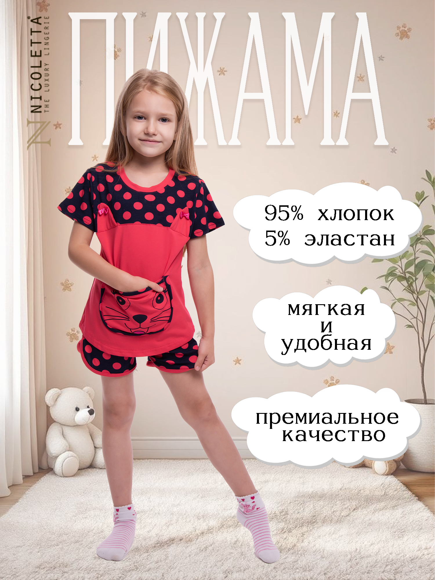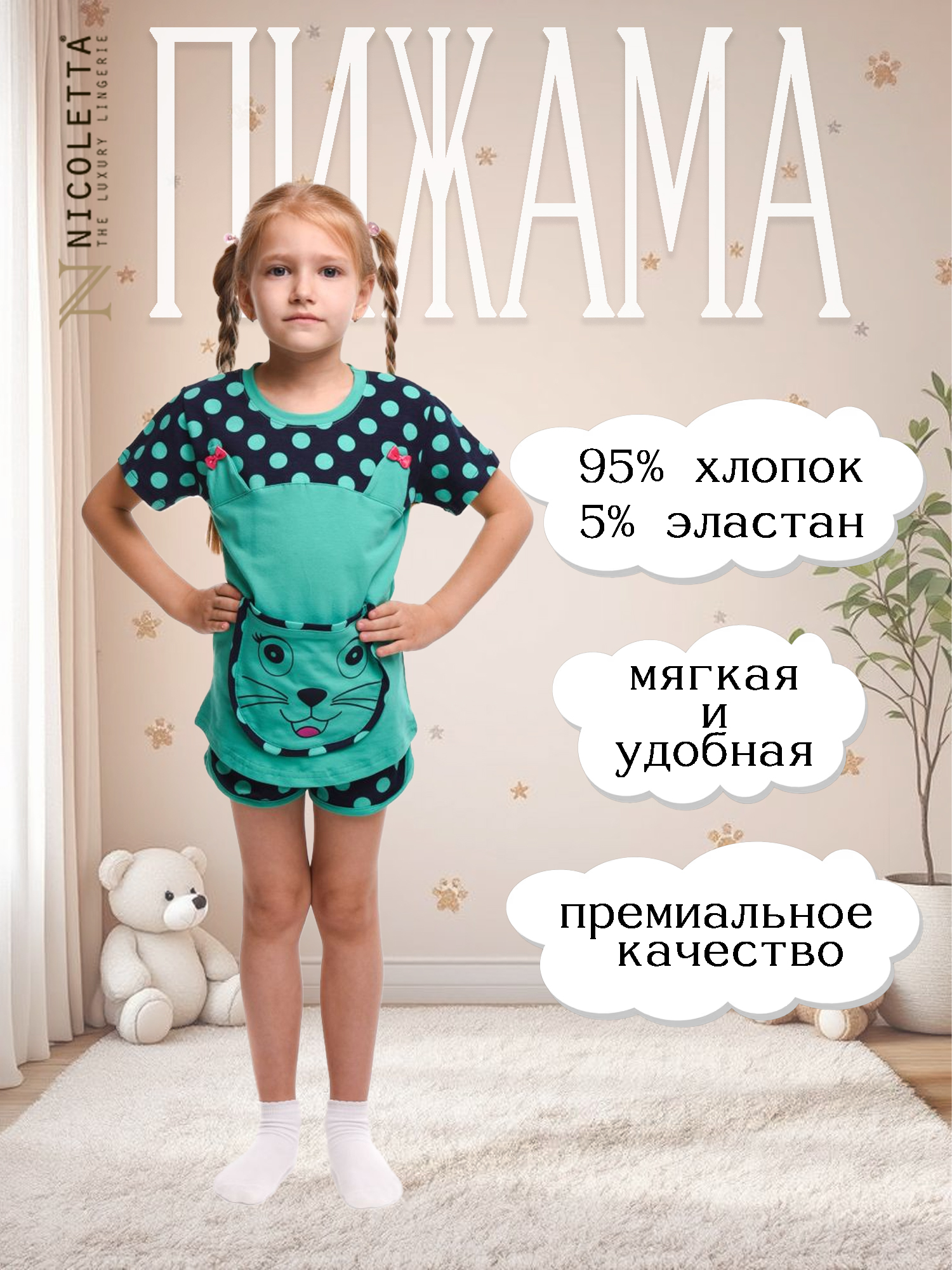 Прекрасное сочетание комфорта и стиля! Пижама для девочки от бренда Nicoletta изготовлена из мягкого материала: 95% натурального хлопка и 5% эластана, что обеспечивает свободу движений и приятные ощущения во время сна.