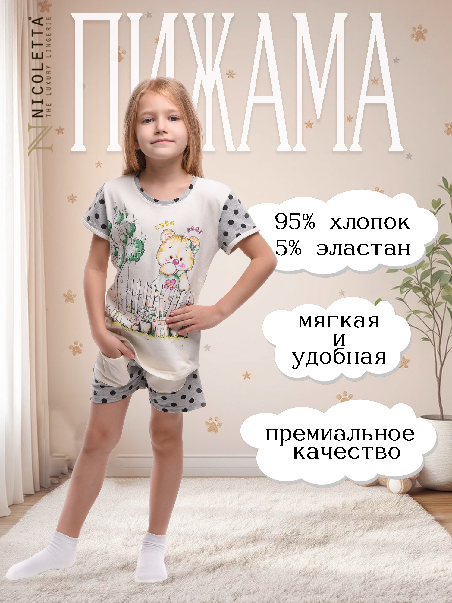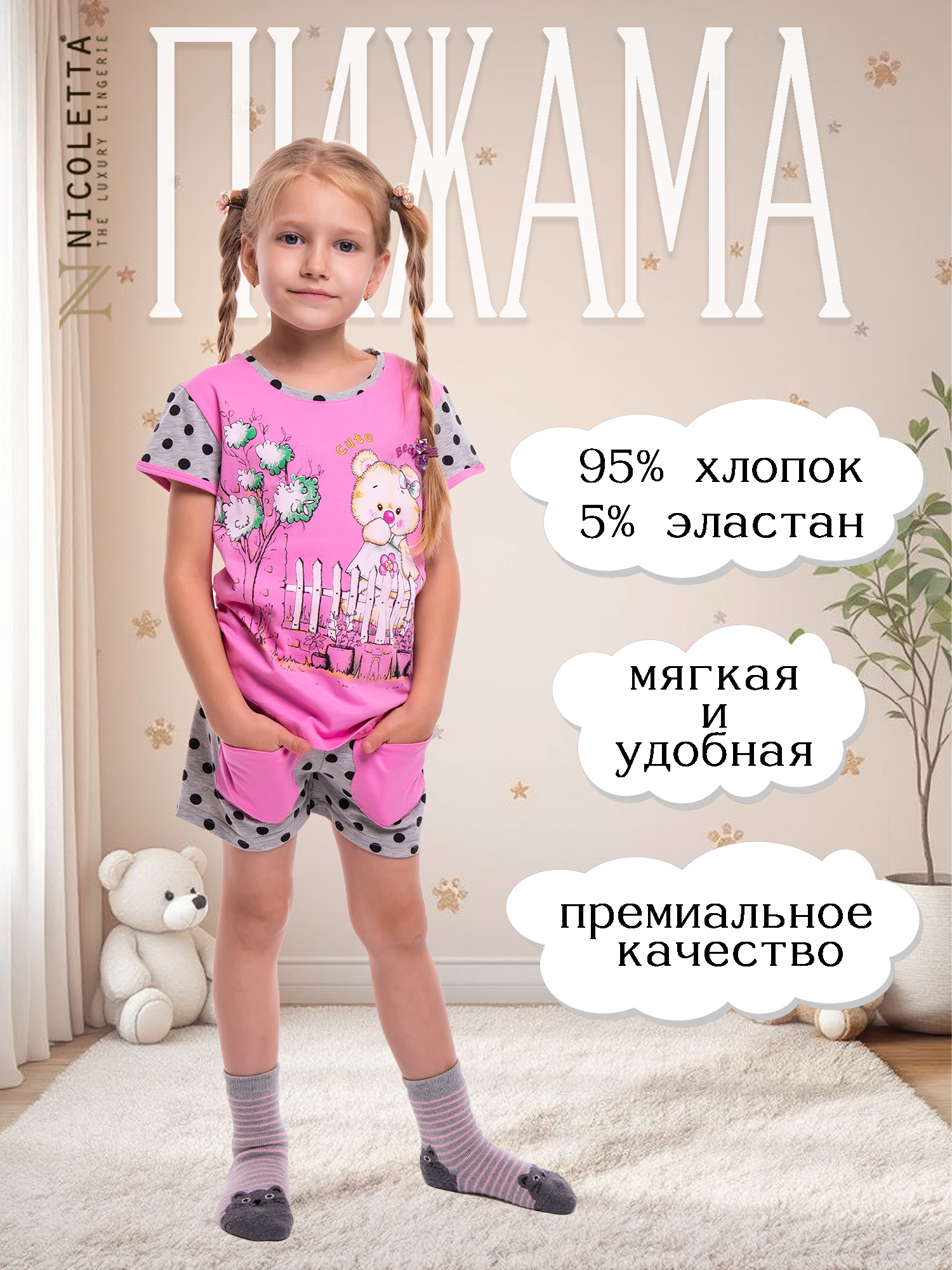 Прекрасное сочетание комфорта и стиля! Пижама для девочки от бренда Nicoletta — истинный хит этого сезона. Изготовлена из качественного материала: 95% мягкого хлопка и 5% эластана, обеспечивающего свободу движений. Сделано в Турции. Подходит для круглогодичной носки.