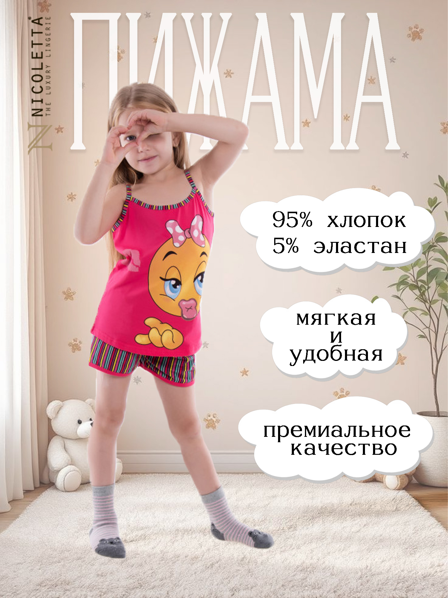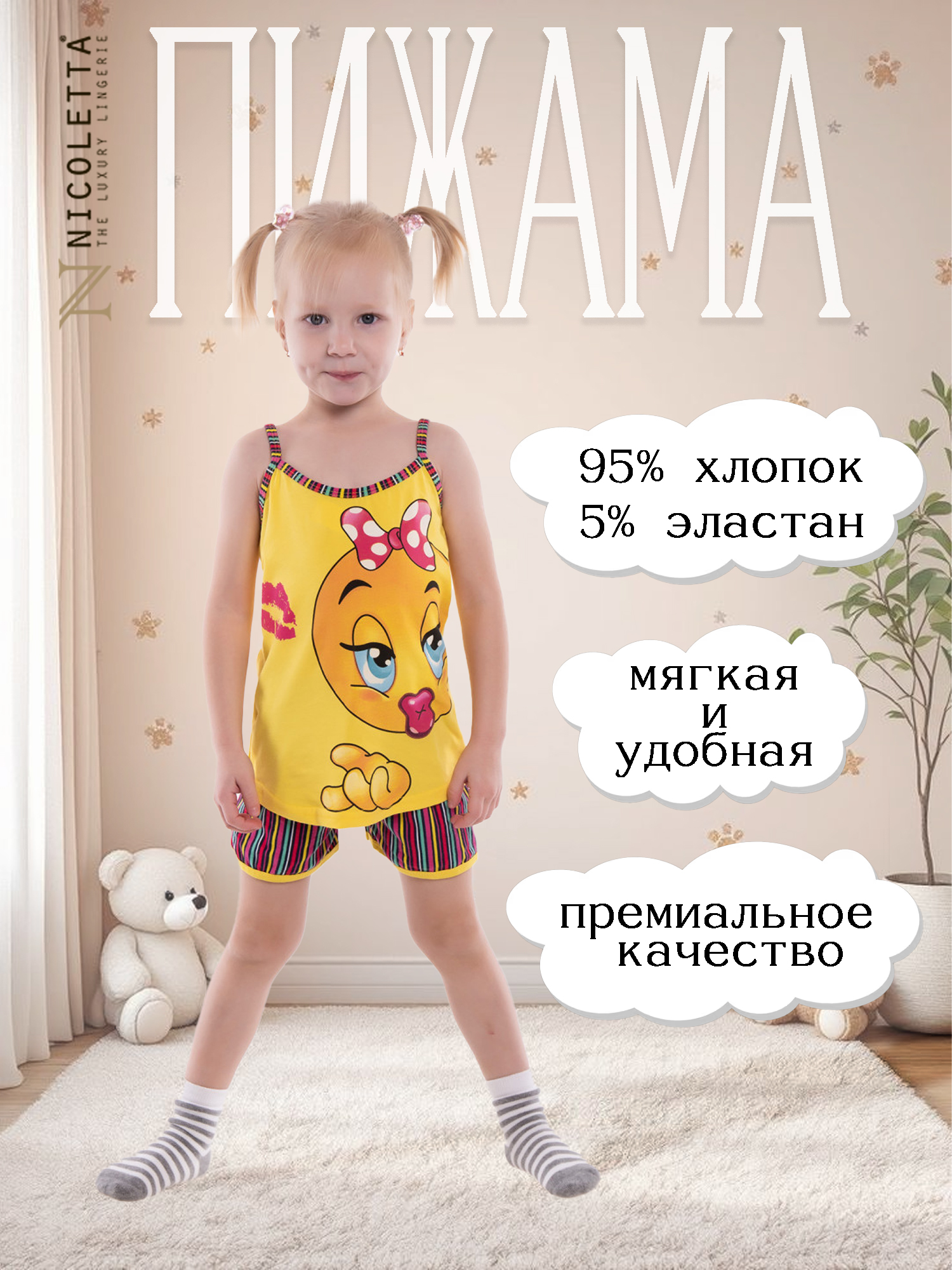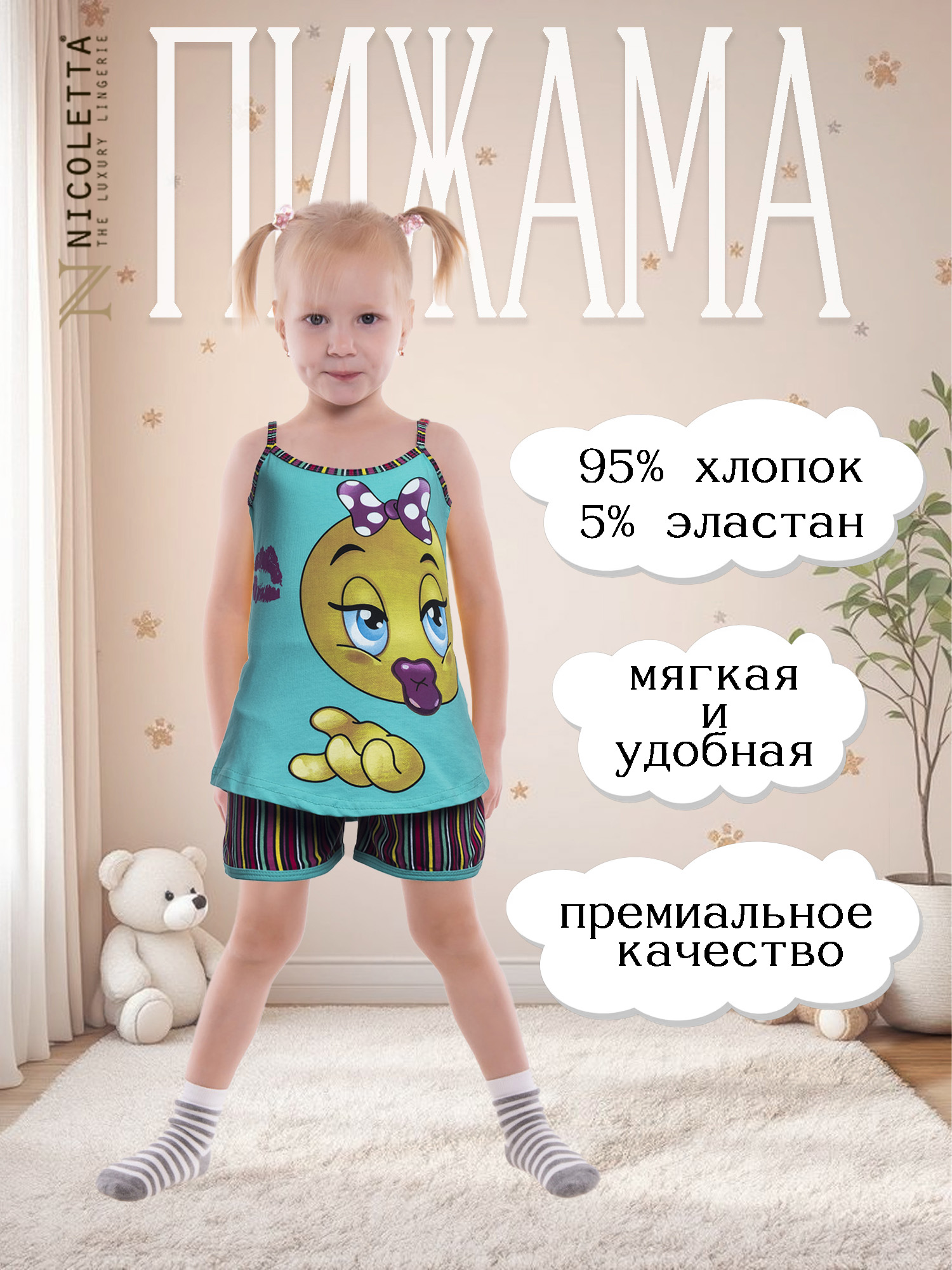 Пижама для девочки с забавным цыпленком! Костюмчик выполнен в виде топа на тонких бретелях и шортиков. Гарнитур изготовлен из натуральной кулирки, благодаря чему — хорошо пропускает воздух и не вызывает раздражений. Прямой слегка удлиненный силуэт не сковывает движений во время отдыха, и не пережимает тело. Закругленные полы майки придают игривую эстетику фасону. Паттерн шорт (на легкой резинке) гармонично сочетается с однородной окантовкой бретелей и вырезов топа. Внутренние швы миниатюрные и неощутимые. Этот яркий и жизнерадостный комплект — находка для настроения и здоровья ребенка!