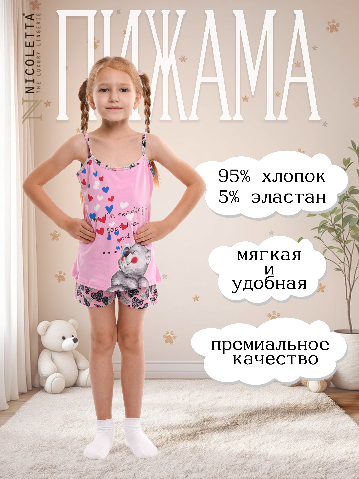 Пижама для маленькой принцессы — очаровательный комплект из нежного топа и озорных шортиков. Бренд Nicoletta дарит малышке комфорт и стиль благодаря мягкому трикотажу (95% хлопка, 5% эластана). Ткань приятна к телу, идеально садится по фигурке и позволяет свободно двигаться. Сделано в Турции с любовью и заботой о детях. Легкий уход: просто постирайте пижамку при температуре 30°C и она надолго останется любимой вещицей вашей крохи!