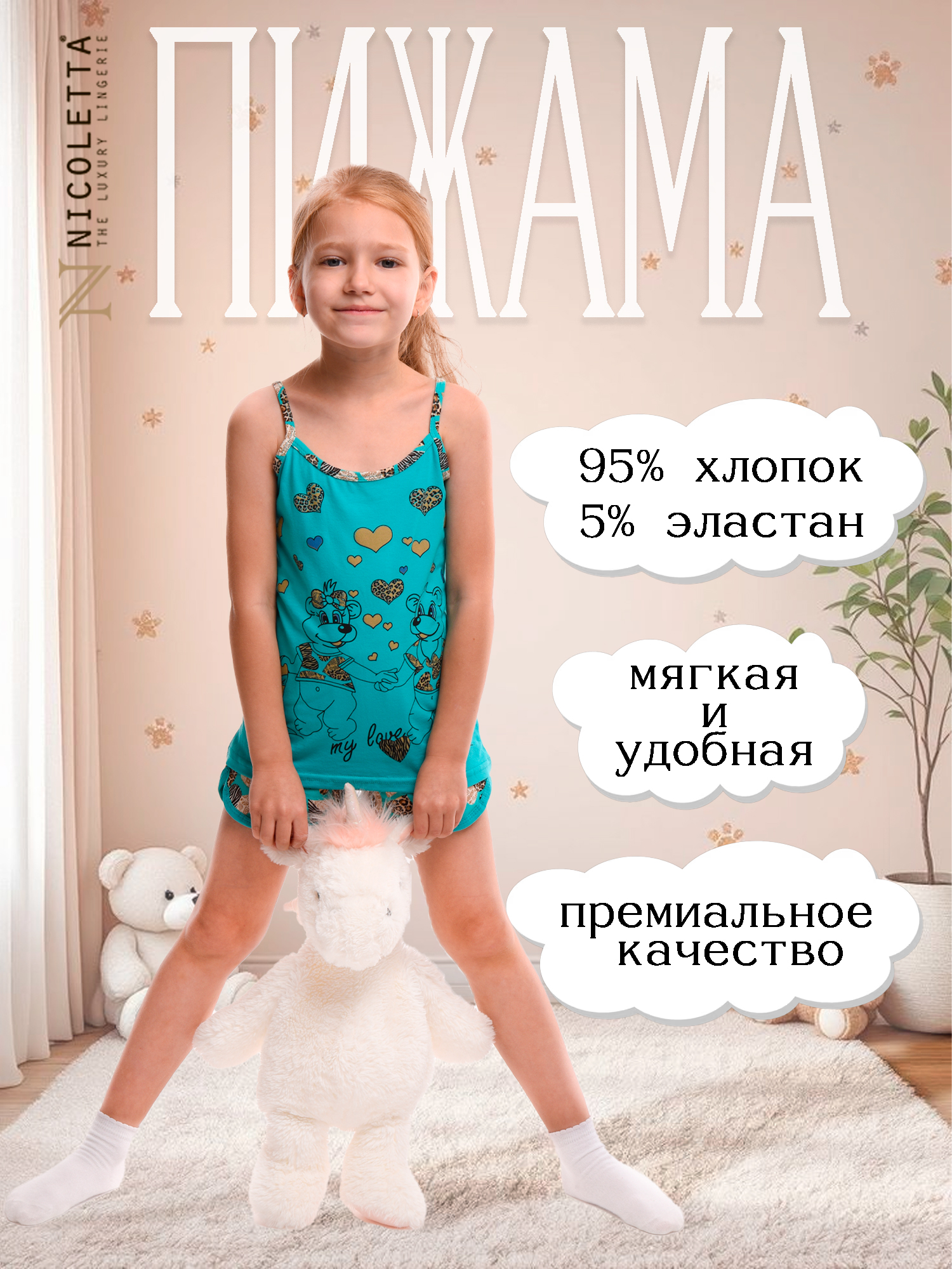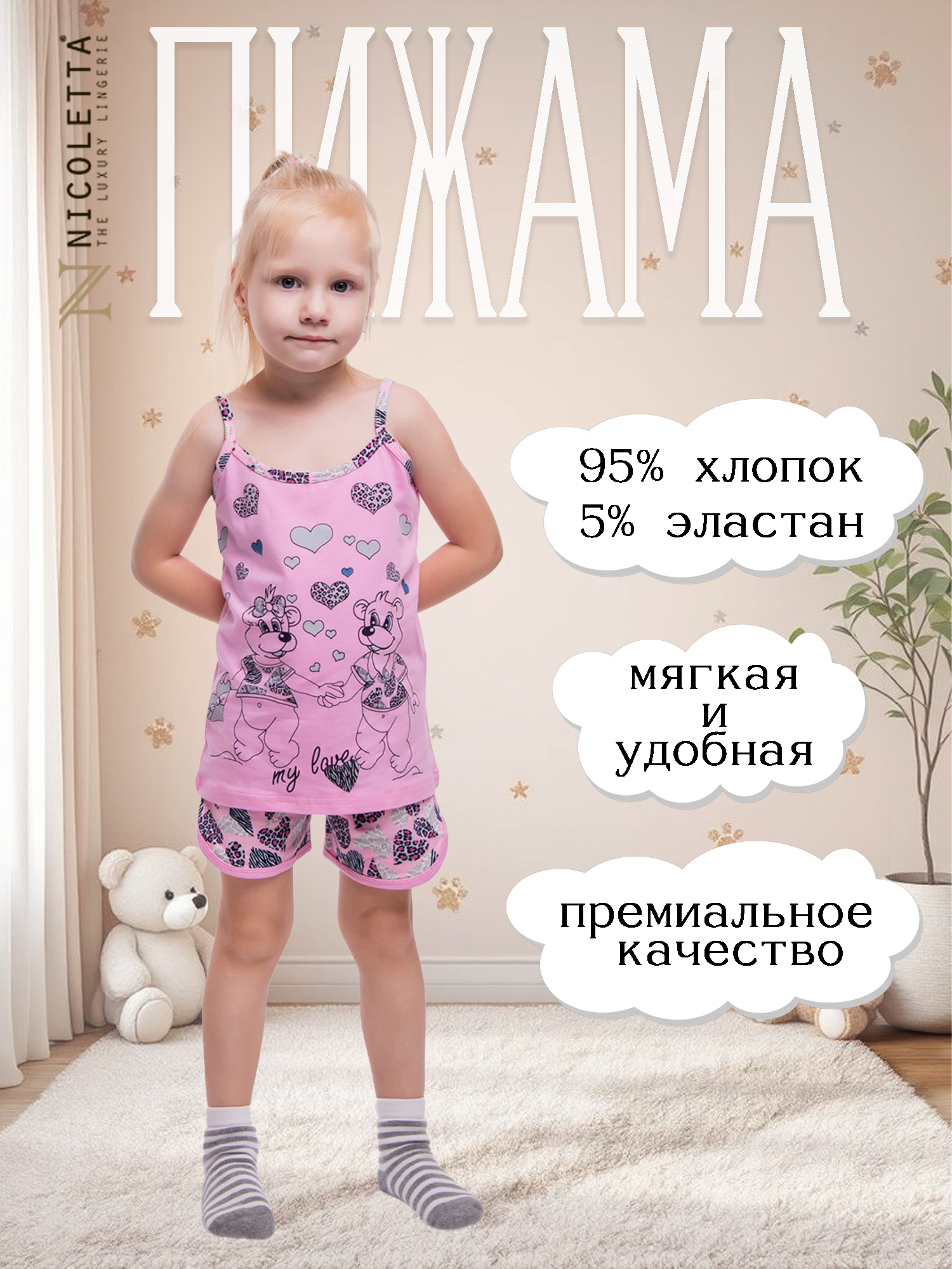 Пижама для девочки из топика и шортиков. Изделие отличается высоким качеством материала, обеспечивающим комфорт во время сна, а также практичностью и долговечностью. Пижама от бренда *Nicoletta* — это сочетание стильного дизайна и удобства. Идеально подходит для круглогодичного использования.
